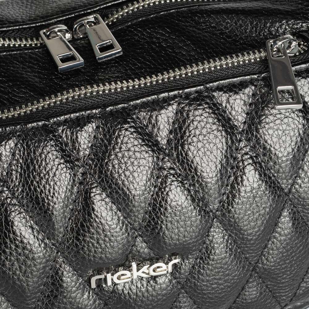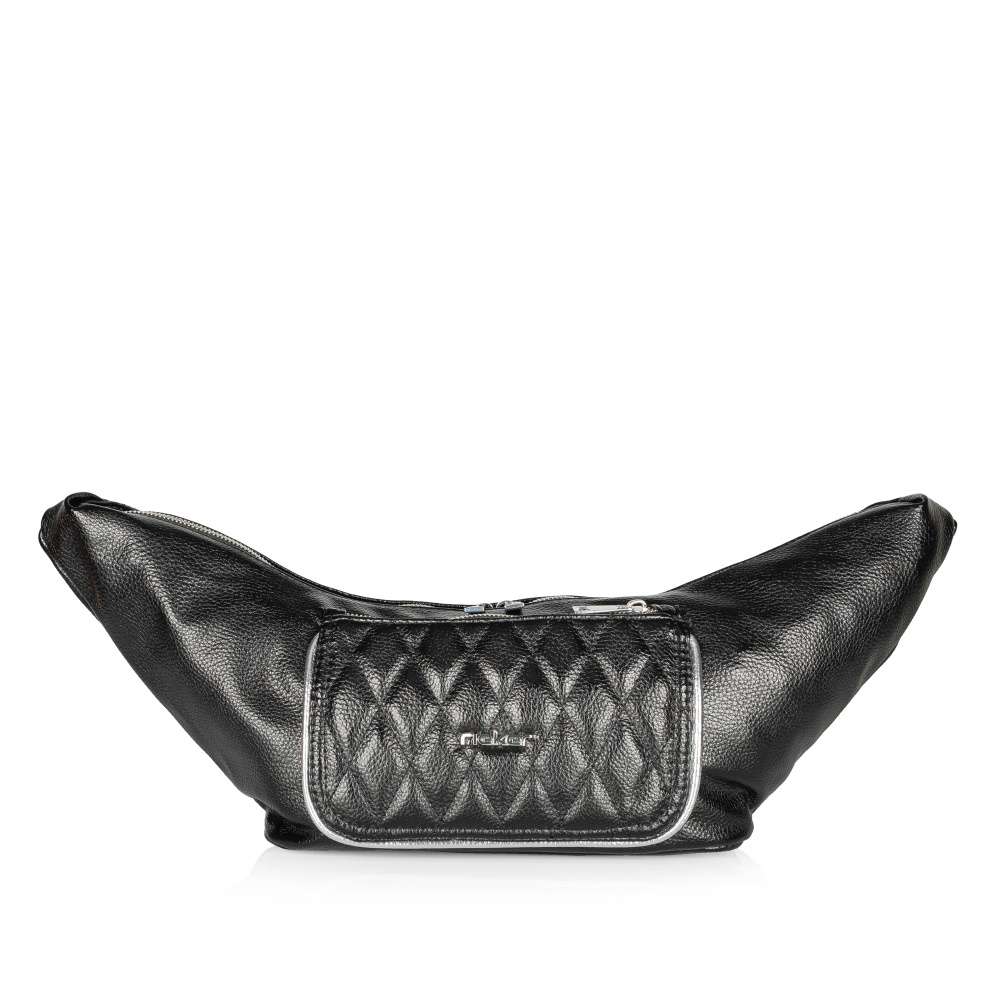 Módní ledvinka RIEKER, které nelze odolat a bude krásně zdobit Váš vzhled. Černý svršek je zdoben malou prošitou kapsičkou na přední straně uzavřenou zipem. Vrchní zip o délce cca 53 cm dává možnost dokonalého přehledu a otevírá prostor pro uložení věcí, naleznete zde i dvě malé kapsičky kde můžete uložit drobnosti. Délku popruhu si můžete upravit podle svých potřeb a vyjít do práce nebo na kávu s kamarádkami.