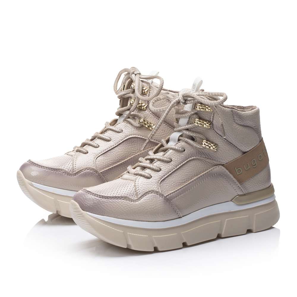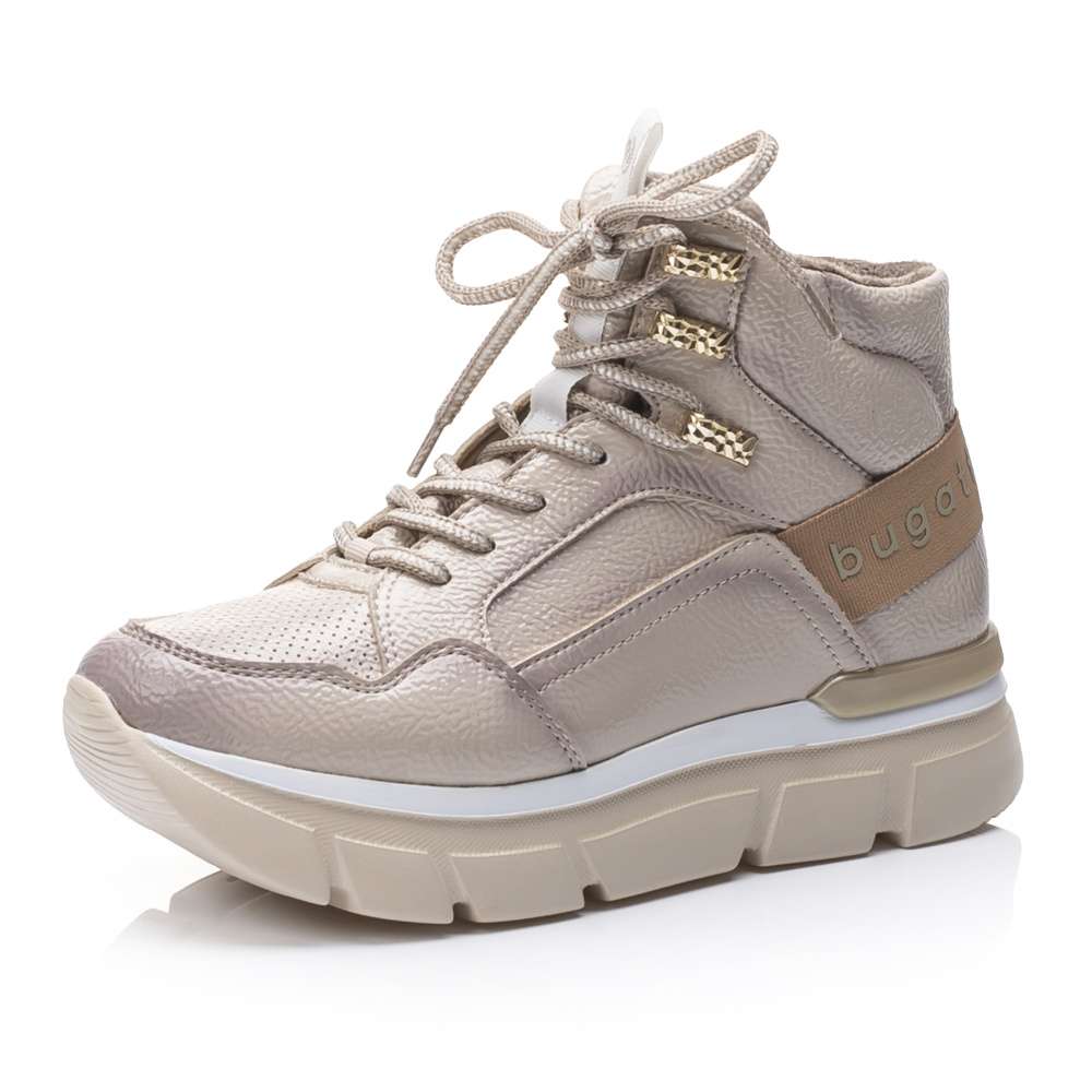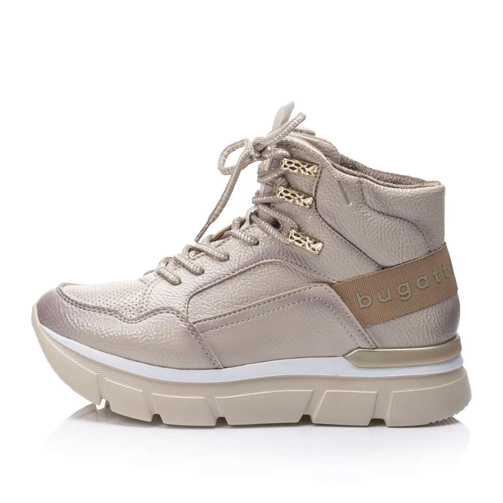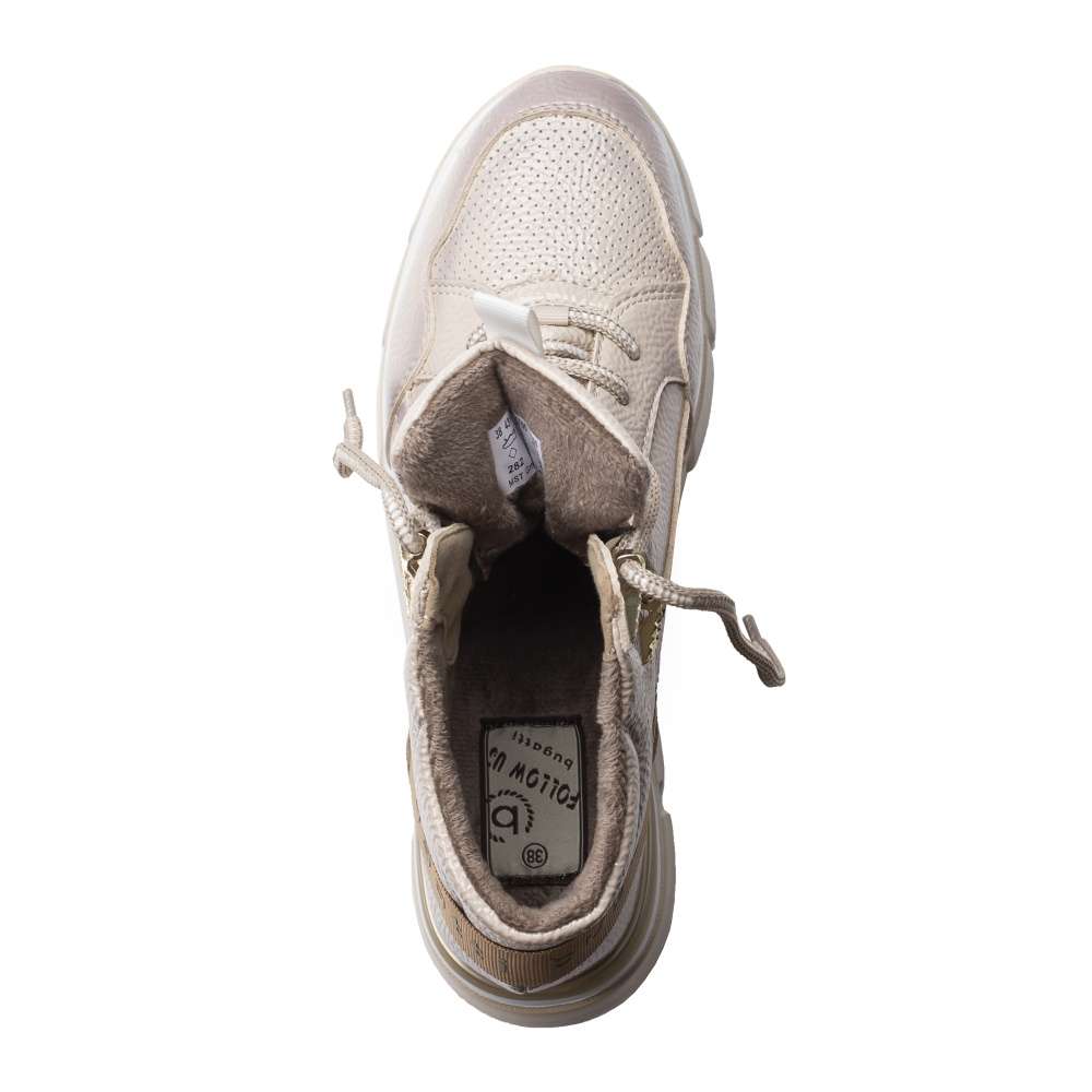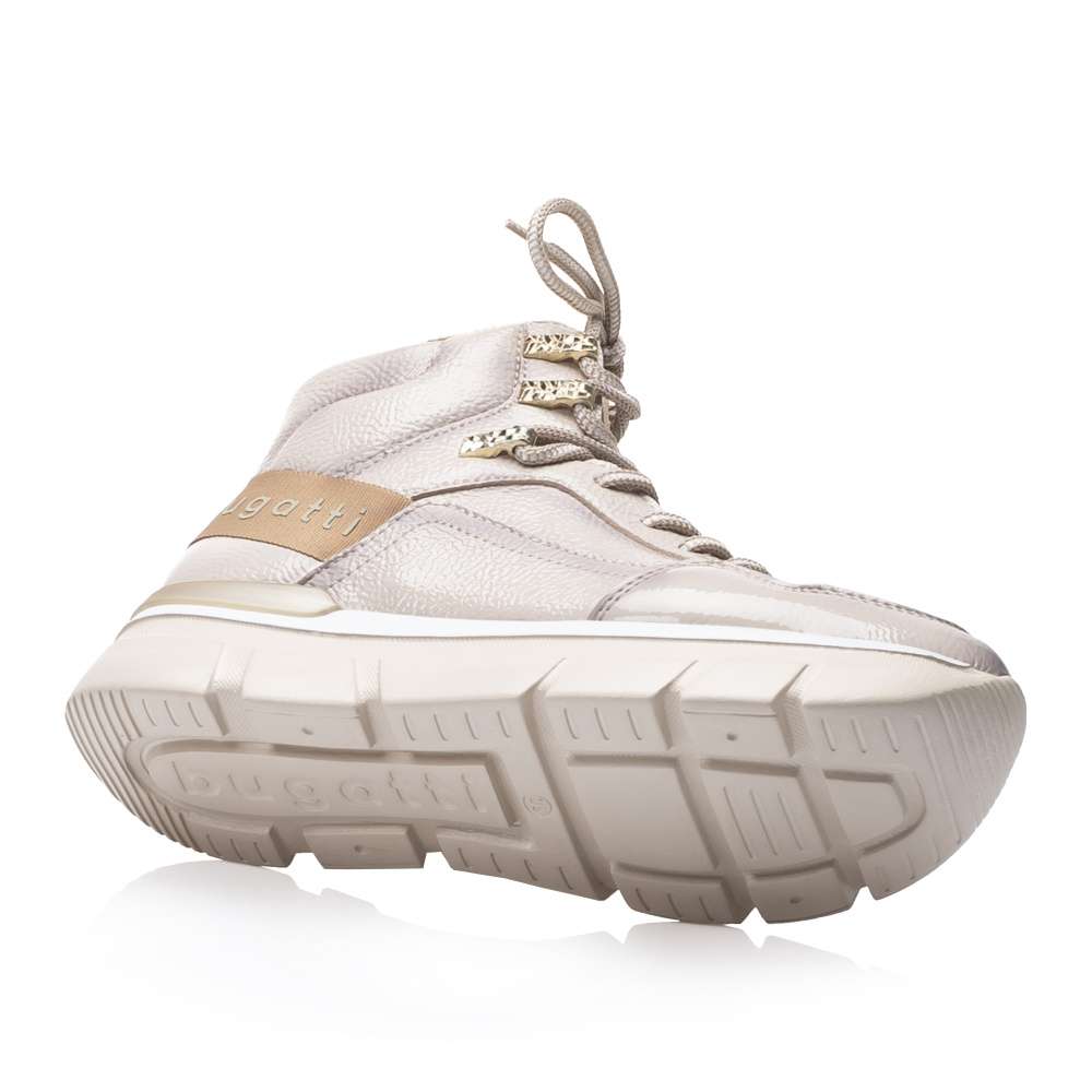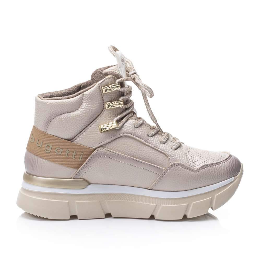 Lesklý béžový svršek se stínováním zdobí textilní nápis na patě a tkaničky provlečené zlatými očky. Lehké zateplení oceníte v chladnějším podzimním počasí.