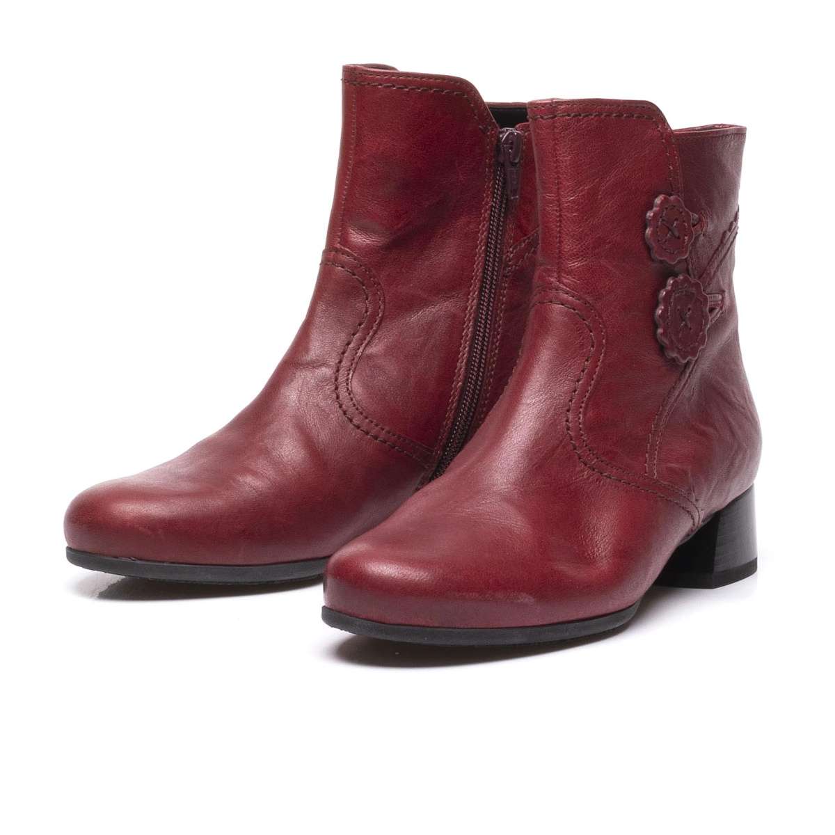 Dámská kožená kotníková obuv zaujme nejen červenou barvou, ale i detailním zpracováním prošívání svršku. Na vnější straně obuvi je zdobení v podobě dvou kytiček. Při nazouvání oceníte zip z vnitřní části boty.