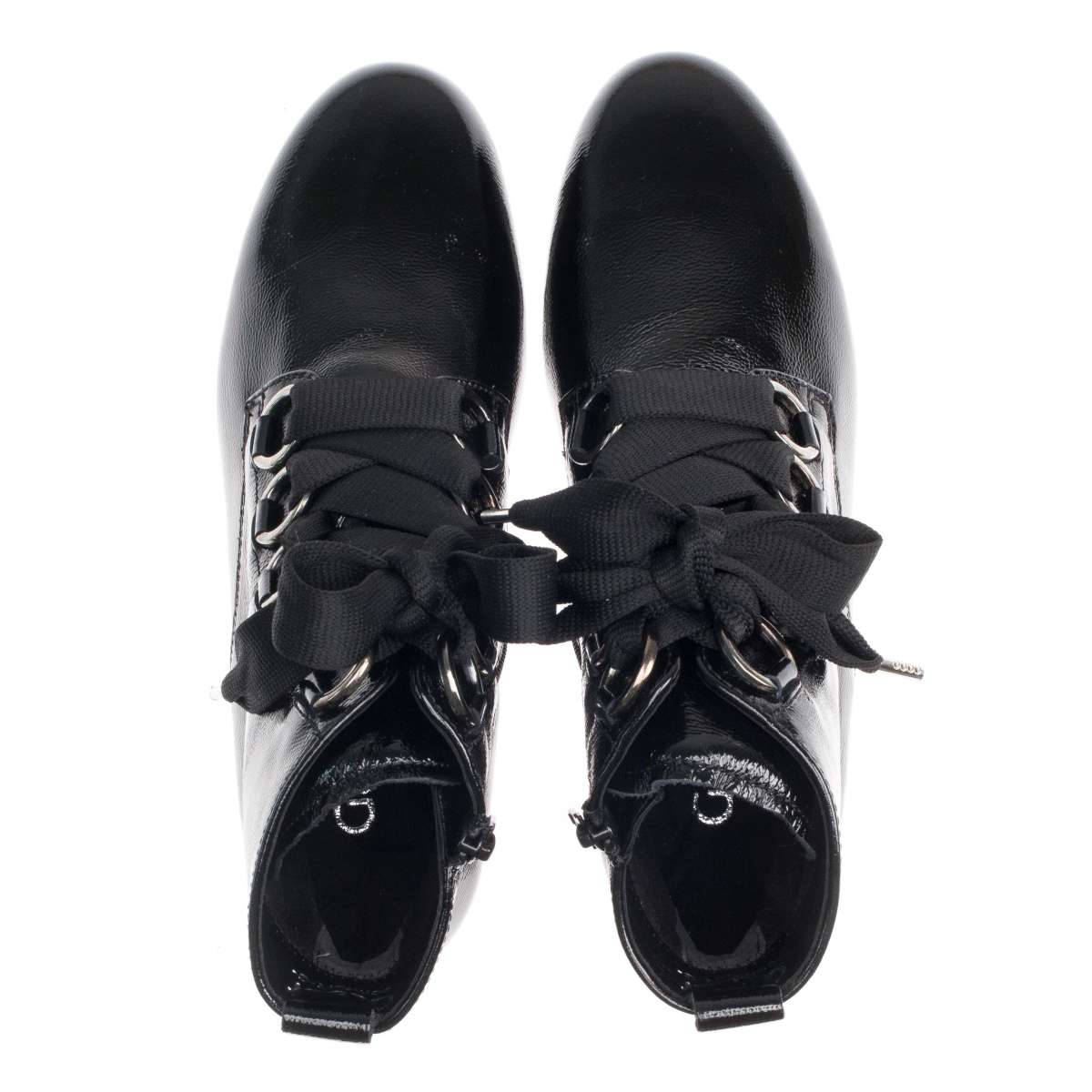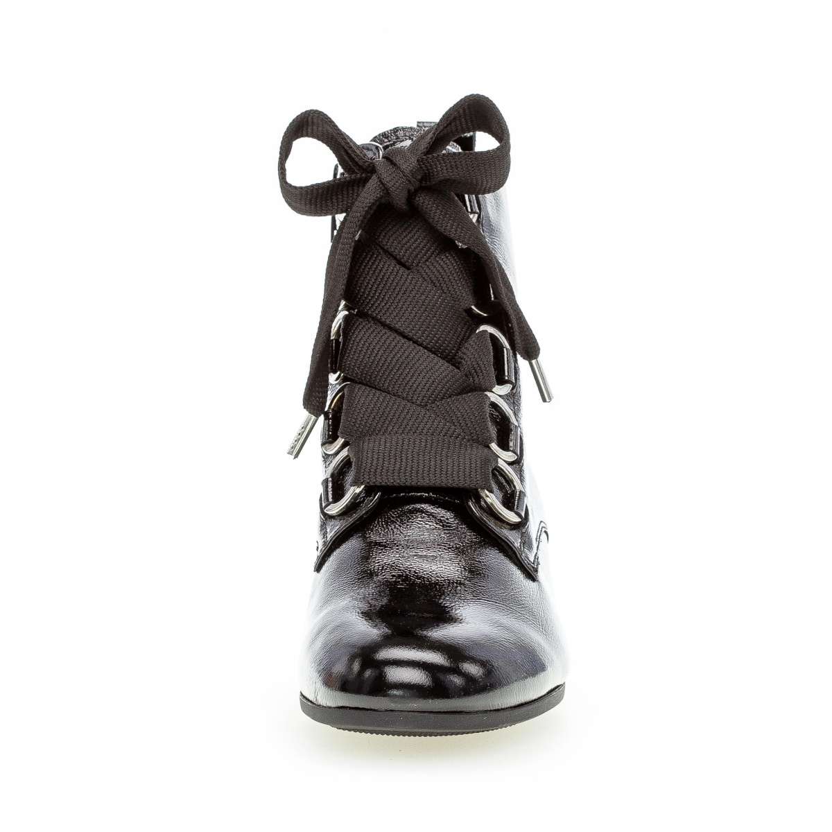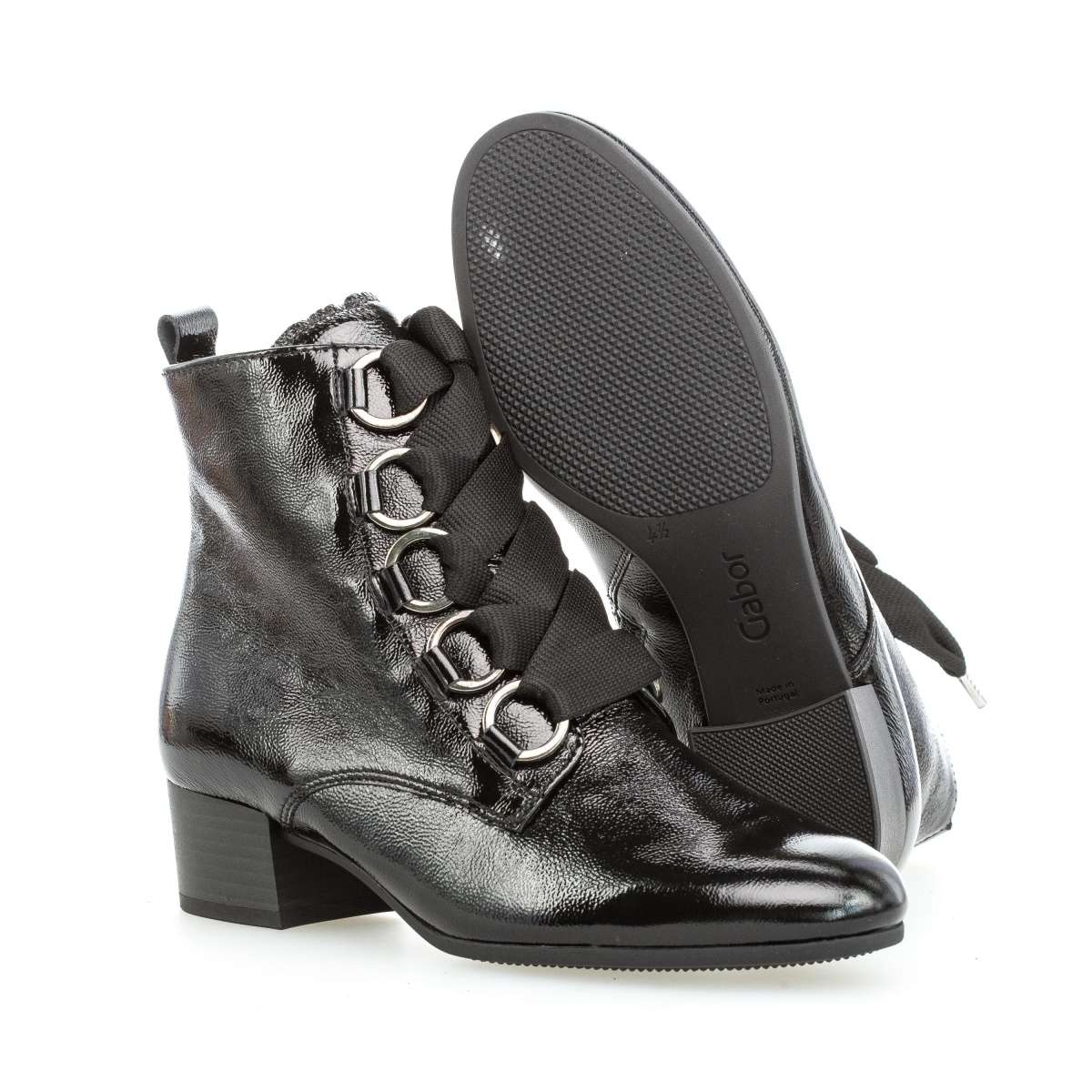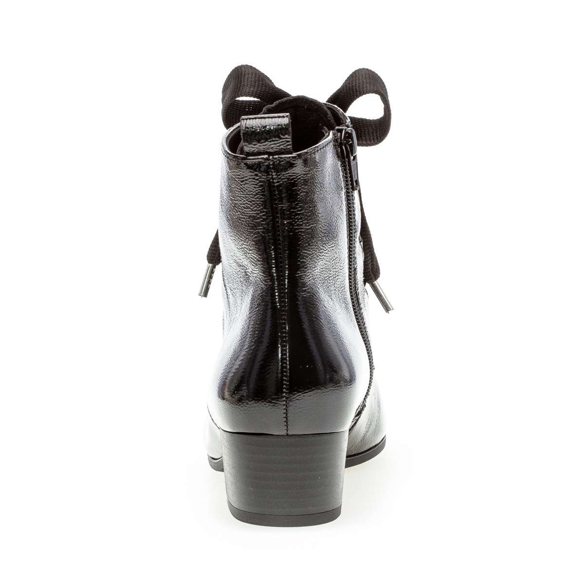 Lakovaný svršek s užší kulatou špičkou upoutá pozornost. Na nártu je výrazné ozdobné šněrování, kterým si zároveň botu uzpůsobíte na nohu. Z vnitřní strany je všitý zip pro snadné obouvání.