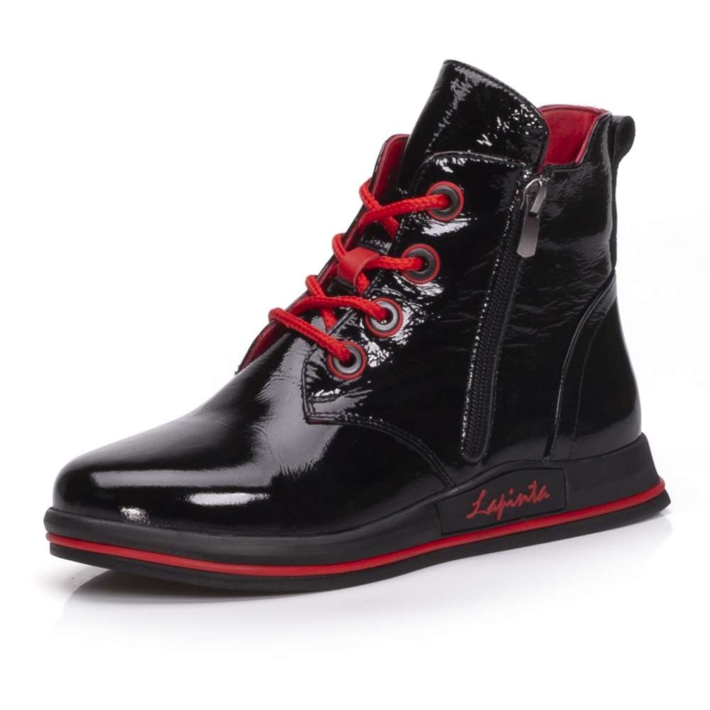 Lakovaný svršek vyrobený z pravé kůže je ozvláštněn kontrastním šněrováním, kterým si obuv přizpůsobíte dle Vašich požadavků. Pro snadné nazouvání Vám poslouží funkční zipy umístěné po stranách obuvi.