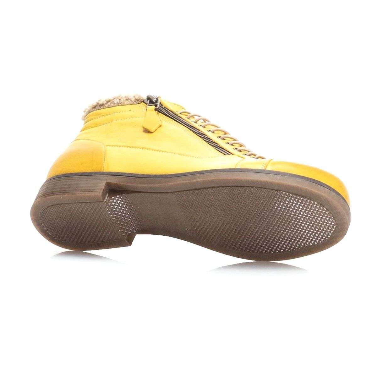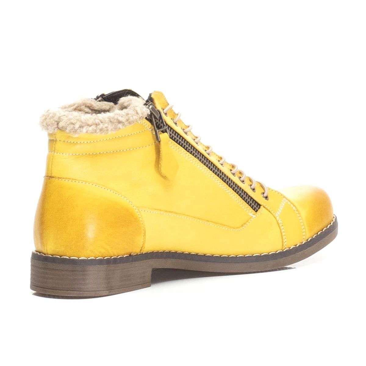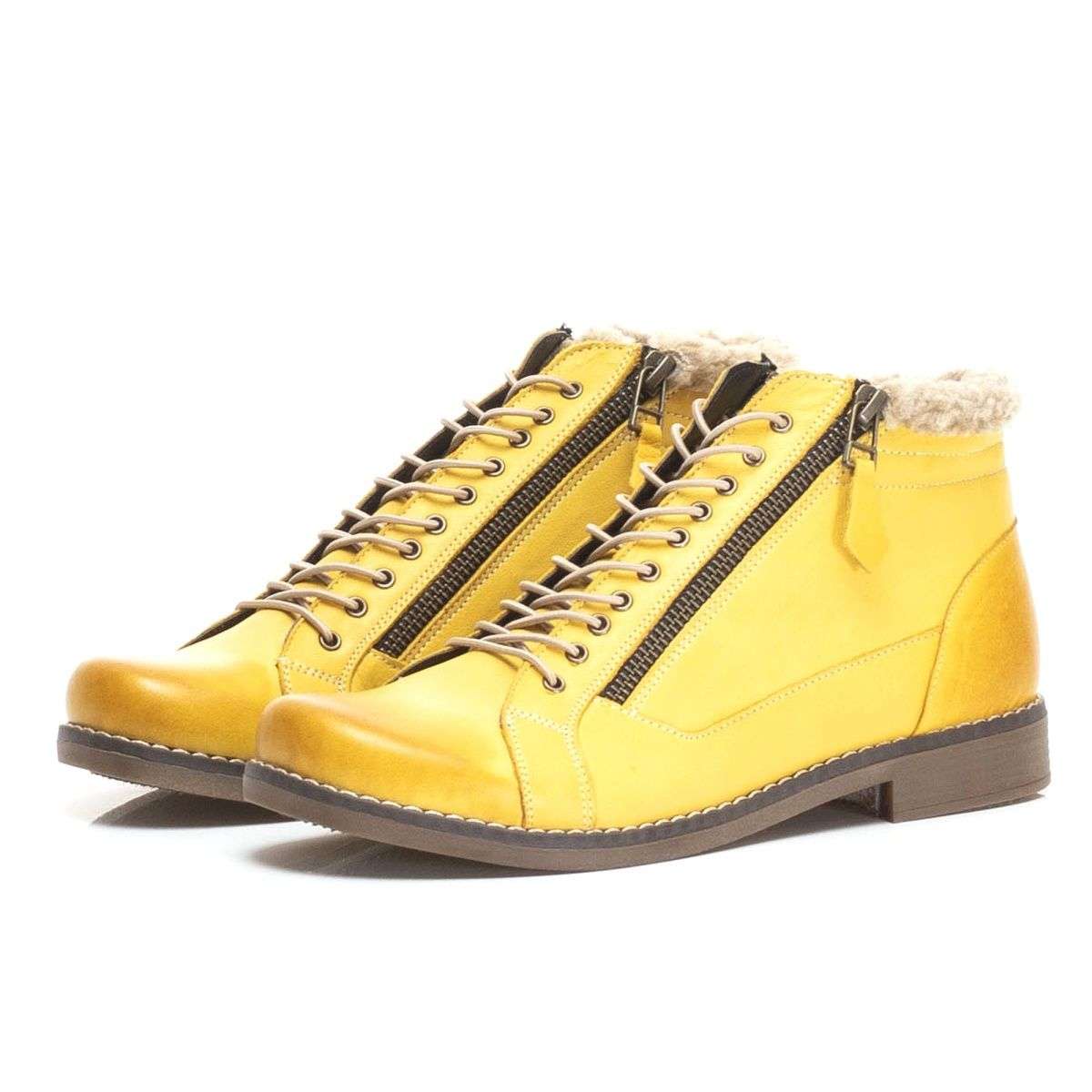 Tato dámská kotníková obuv Vás na první pohled zaujme svou barvou. Kožený svršek je po obou stranách doplněn funkčními zipy pro snadné nazouvání. Kulatá špička, jemné prošívání a šněrování tenkou kulatou gumičkou, to vše jsou zdobné prvky tohoto kotníku. Obuv bude skvěle vypadat z černým outfitům.