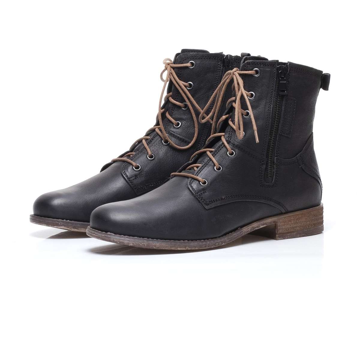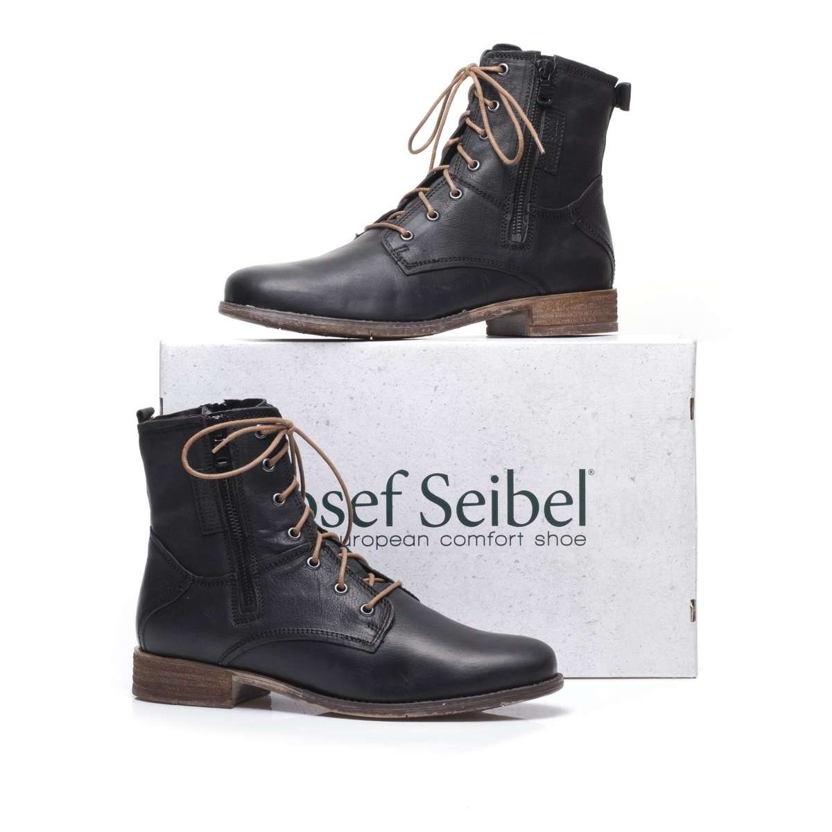 Dámská kotníková obuv šitá z pravé hladké kůže černé barvy ozdobena elegantním šitím s nápisem Josef Seibel na vnější straně. Zde se nachází i funkční zip, který je podšitý kůží, který pro zvětšení objemu kolem kotníku můžete rozepnout. Na vnitřní straně se nachází zip, pro snadné obutí. Šněrováním si botu upravíte přesně podle požadavků. Tento velmi pohodlný a elegantní model nabízený ve třech barevných variantách a využijete je ke všem příležitostem a outfitům.