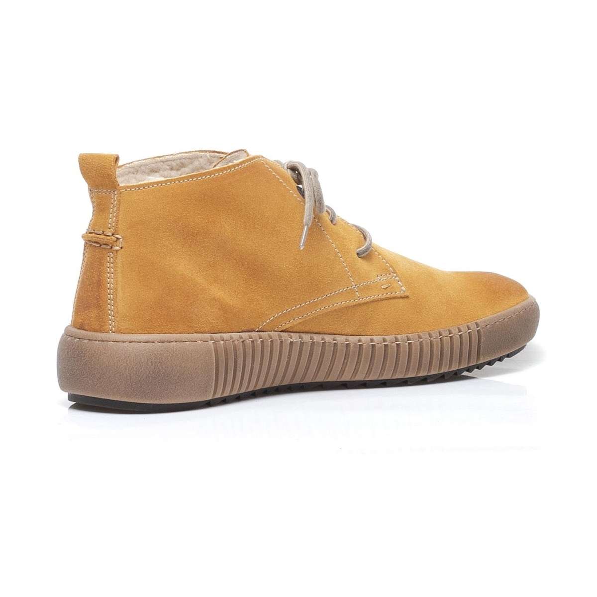 Dámská kotníková obuv je šitá z pravé kůže žluté barvy se semišovým vzhledem. Zdobena je kontrastním šitím, designovou podešví a kroužky na tkaničky. Šněrováním si je pak upravíte dle vlastních požadavků. Teplou podšívku oceníte v chladných zimních dnech. Tento velmi pohodlný model nabízený ve více barevných variantách a využijete je ke všem příležitostem a outfitům.