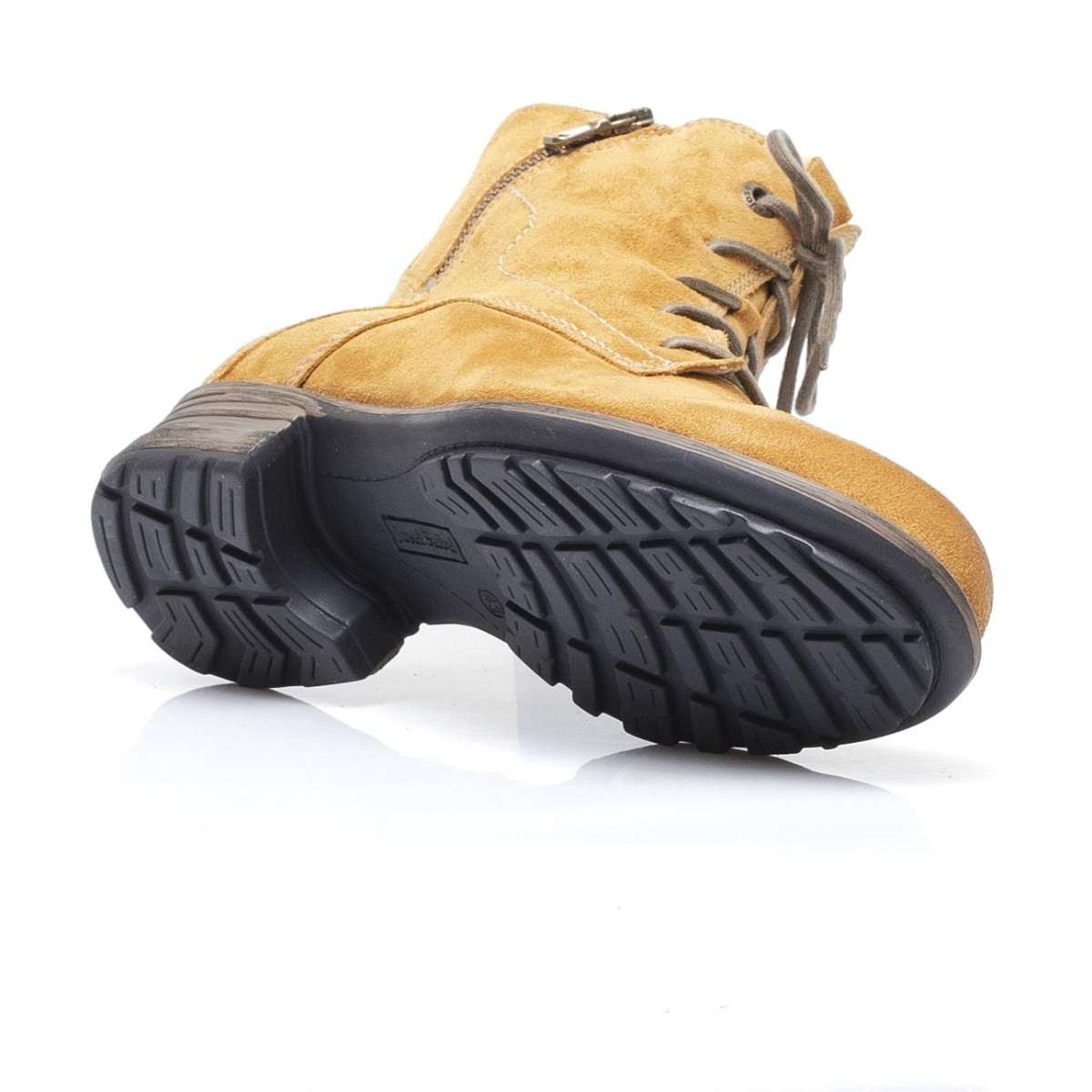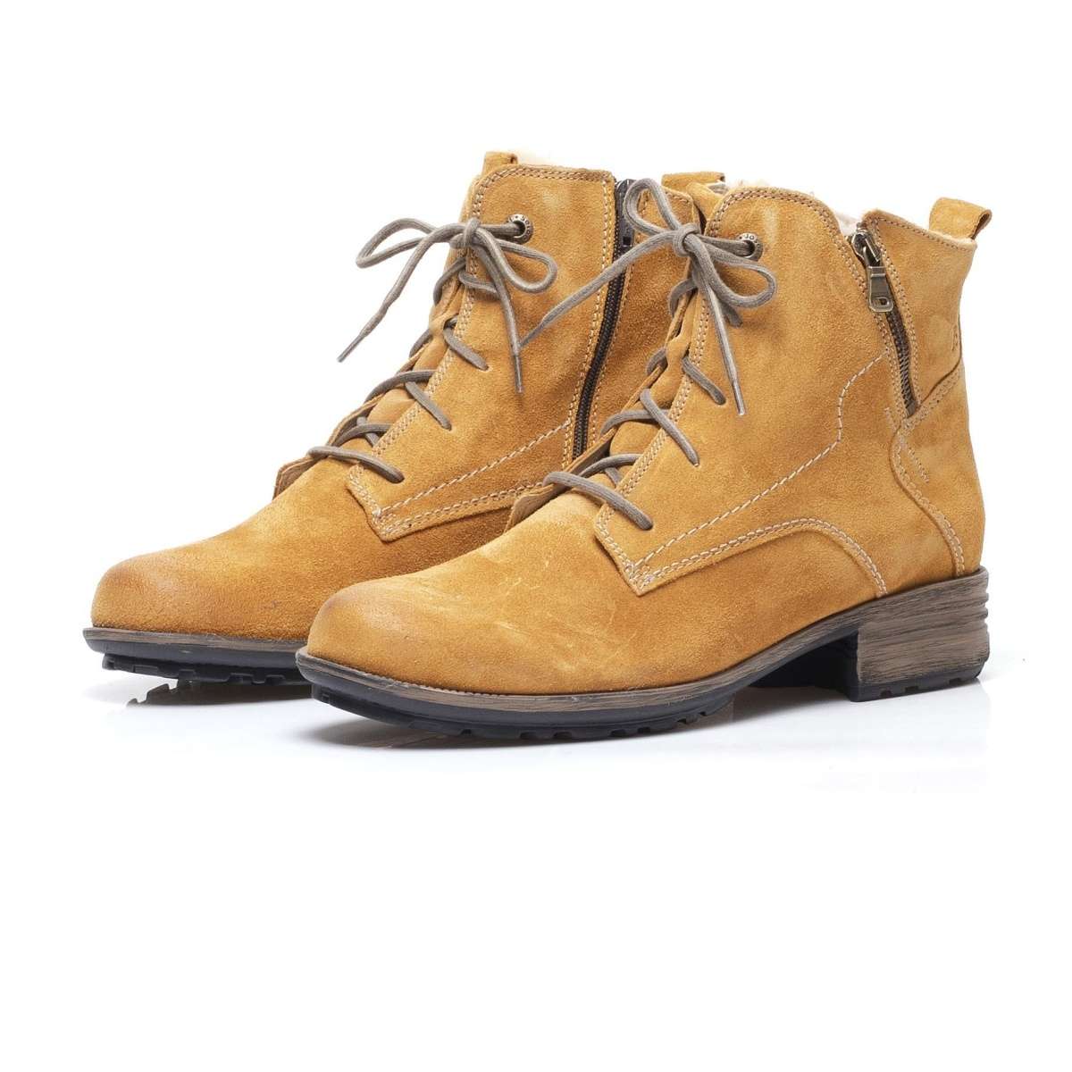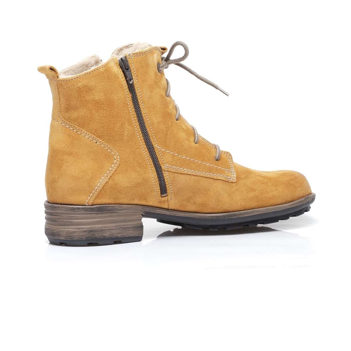 Svršek je z broušené kůže hořčicové barvy s ozdobným zipem na vnější straně. Pro snadnější obutí je všitý funkční zip ze strany vnitřní. Nechybí ani šněrování pro dodatečnou úpravu. Boty jsou zateplené kožíškem, který oceníte v chladnějších dnech.