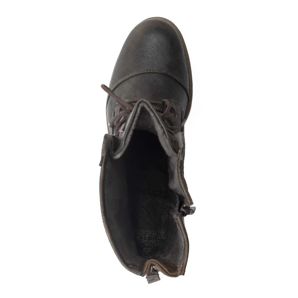 Svršek obuvi je zdobný kontrastním šitím, zipem na patě a tkaničkami kolem kotníku. Na vnitřní straně je funkční zip pro snadné obutí a šněrováním si pak obuv upravíte dle svých požadavků.