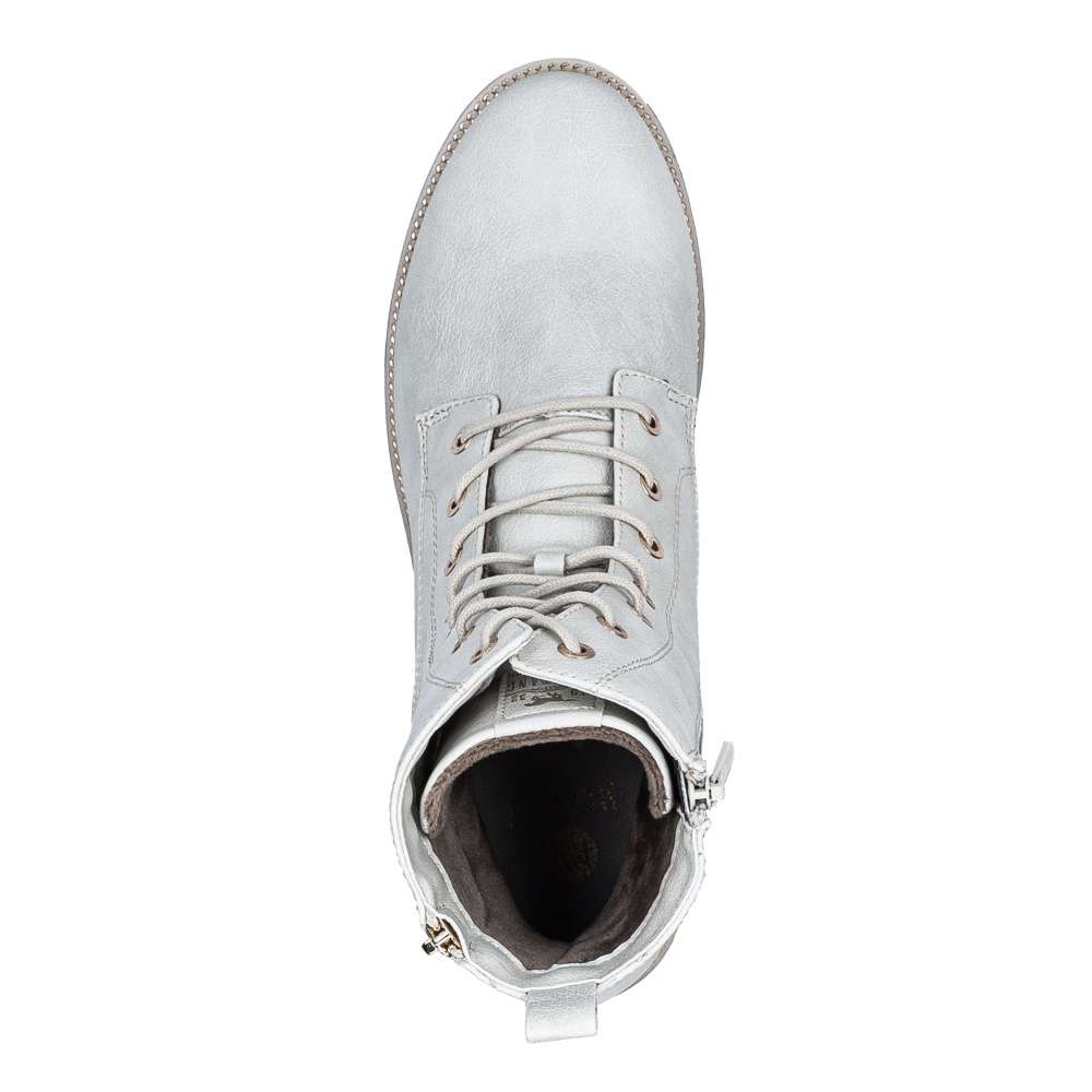 Tyto dámské kotníky značky MUSTANG v designové barvě Vás uchvátí na první pohled. Hladký svršek je zdoben jemným prošíváním a malým logem značky na patě. Snadné nazouvání a přizpůsobení obuvi dle Vašich požadavků zajistí šněrování a funkční zip na vnitřní straně obuvi. Na vnější straně najdete druhý kratší zip, který plní funkci ozdoby. Zipy mají kontrastní zlatou barvu. Pohodlí a komfort Vám zajistí měkká stélka s hřejivou podšívkou. Proto Vás už nemusí trápit chladné zimní večery. Menší podpatek podtrhne krásu tohoto modelu.