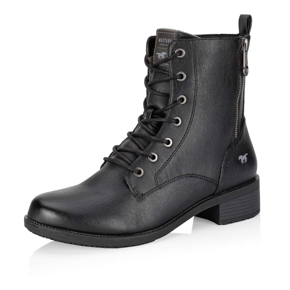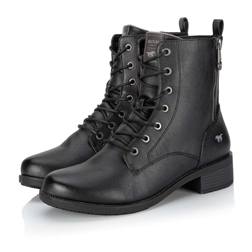 Detailní informace Tyto dámské kotníky značky MUSTANG v nadčasové barvě Vás uchvátí na první pohled. Hladký svršek je zdoben jemným prošíváním a malým logem značky na patě. Snadné nazouvání a přizpůsobení obuvi dle Vašich požadavků zajistí šněrování a funkční zip na vnitřní straně obuvi. Na vnější straně najdete druhý kratší zip, který plní funkci ozdoby. Zipy mají kontrastní zlatou barvu. Pohodlí a komfort Vám zajistí měkká stélka s hřejivou podšívkou. Proto Vás už nemusí trápit chladné zimní večery. Menší podpatek podtrhne krásu tohoto modelu.