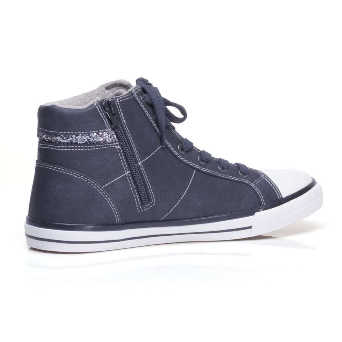 Dámský nízký kotník v úžasné kombinaci modré a světlé barvy zdobený kontrastním šitím, flitrovým páskem na vnější straně a kolem paty. Na vnitřní straně je funkční zip pro snadné obutí. Šněrováním si pak model upravíte přímo k Vaší noze. Pro chladnější dny oceníte lehké textilní zateplení uvnitř boty.