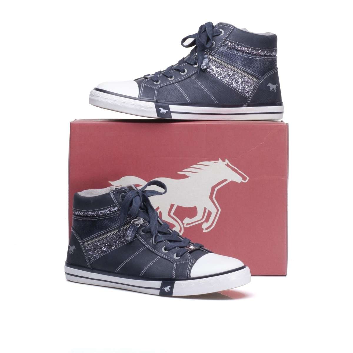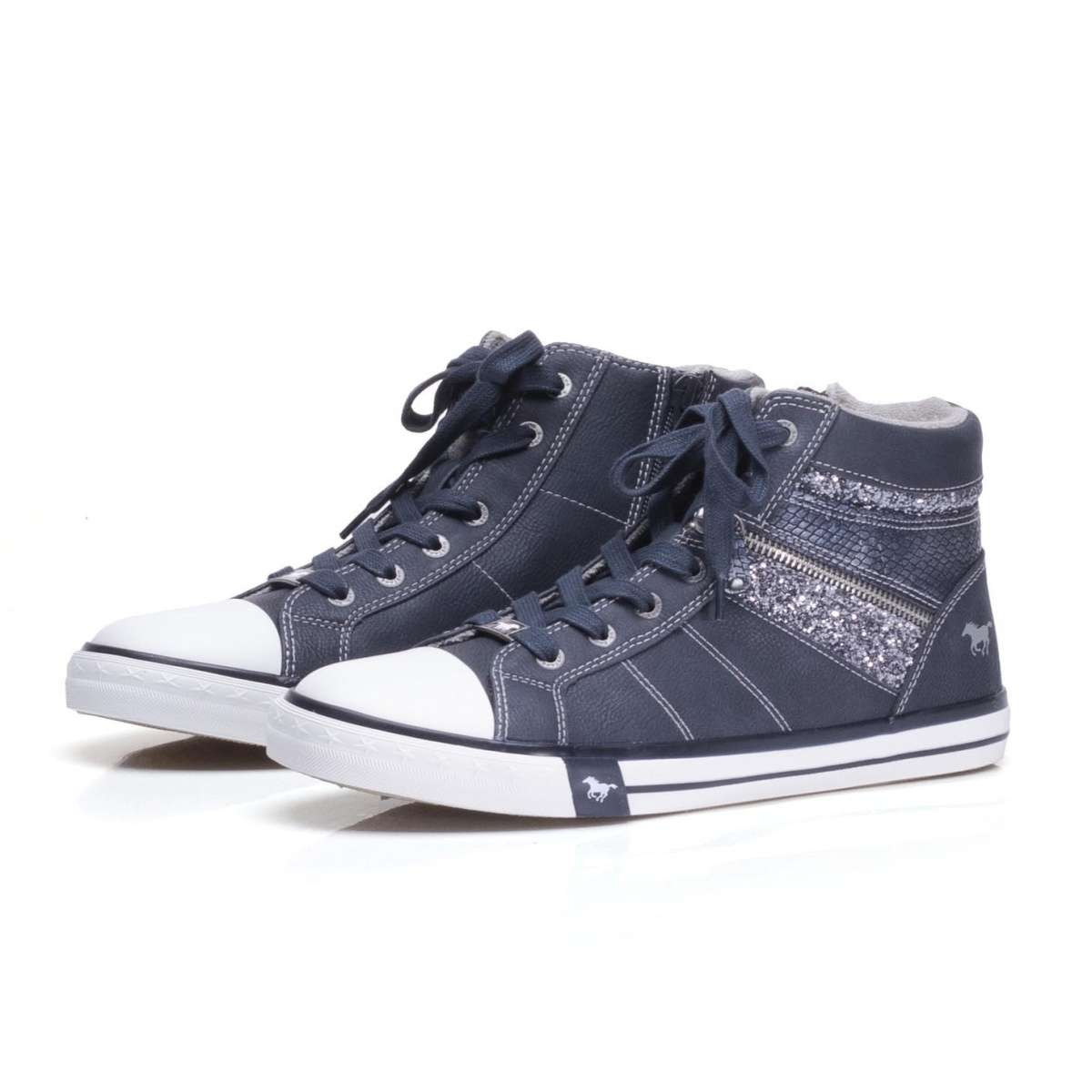 Dámský nízký kotník, značky MUSTANG. Podešev Podešev je vyrobena z velmi kvalitního syntetického materiálu a v nejvyšším bodě pod patou je vysoká cca 2,5 cm. Svršek Dámský nízký kotník v úžasné kombinaci modré a světlé barvy zdobený kontrastním šitím, flitrovým páskem na vnější straně a kolem paty. Na vnitřní straně je funkční zip pro snadné obutí. Šněrováním si pak model upravíte přímo k Vaší noze. Pro chladnější dny oceníte lehké textilní zateplení uvnitř boty. Stélka Měkká stélka je příjemná pro celodenní nošení.