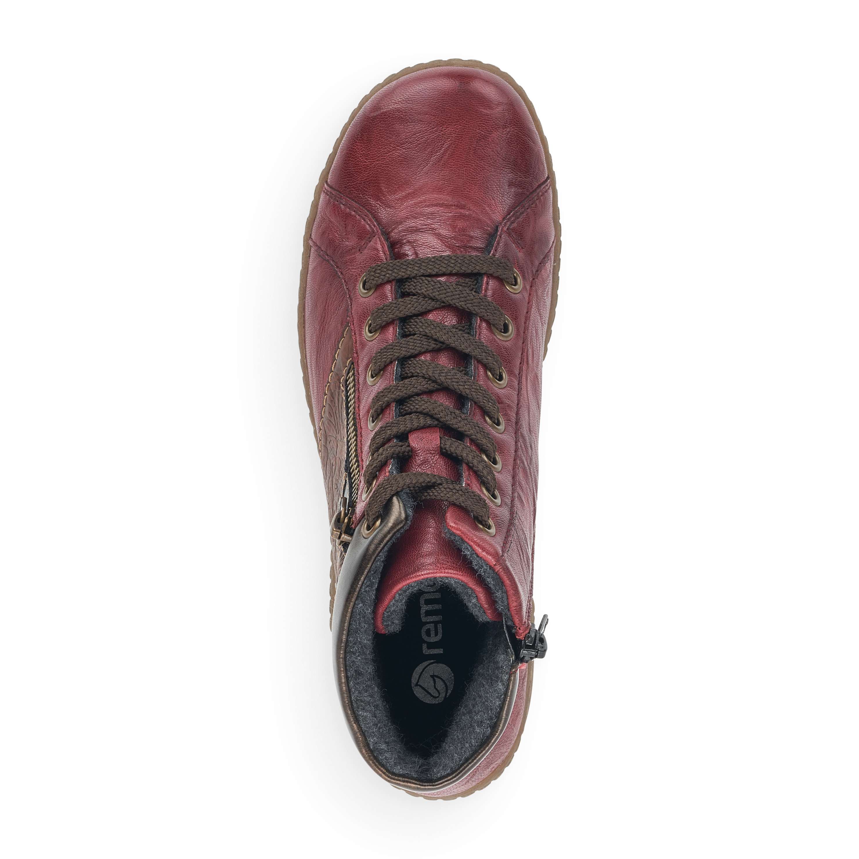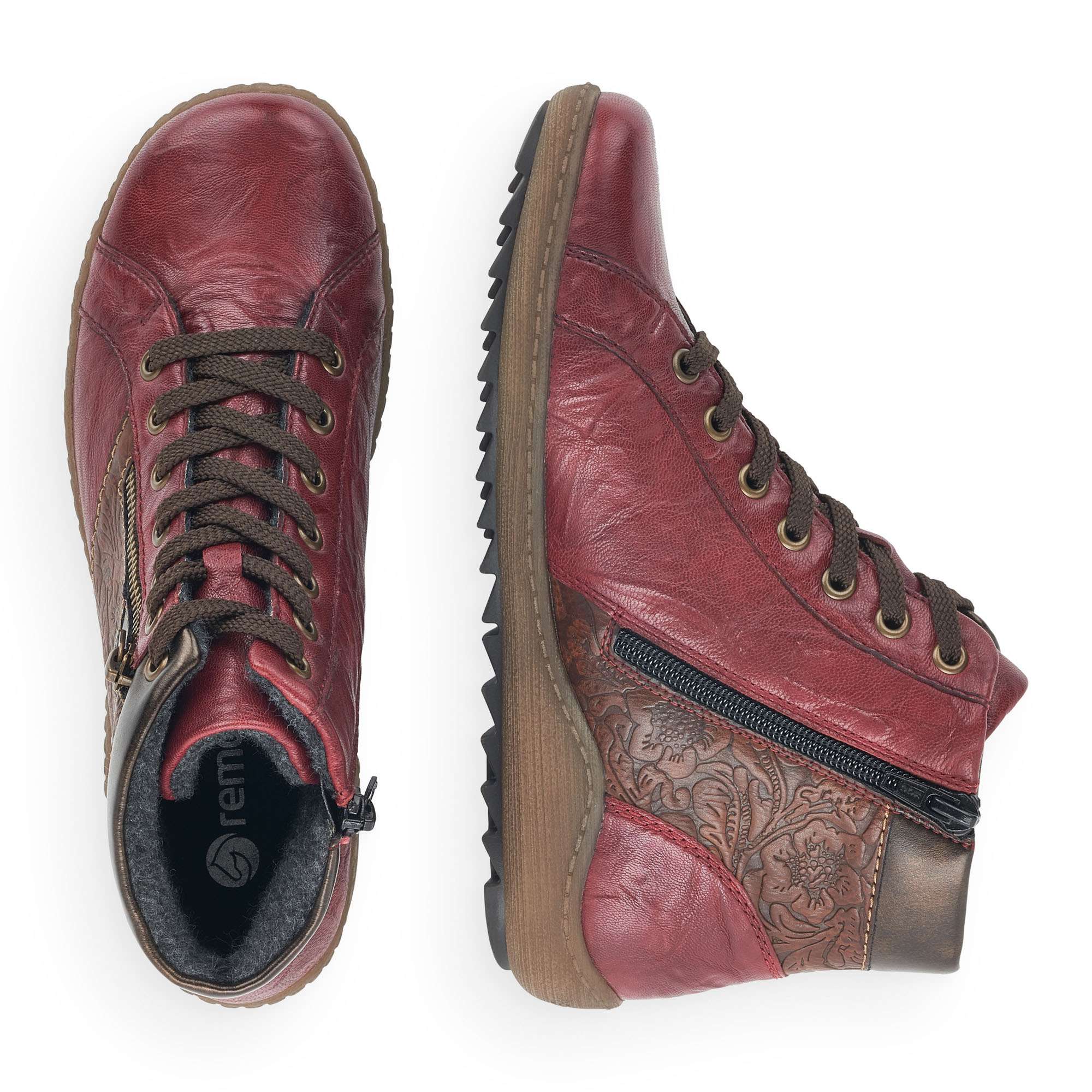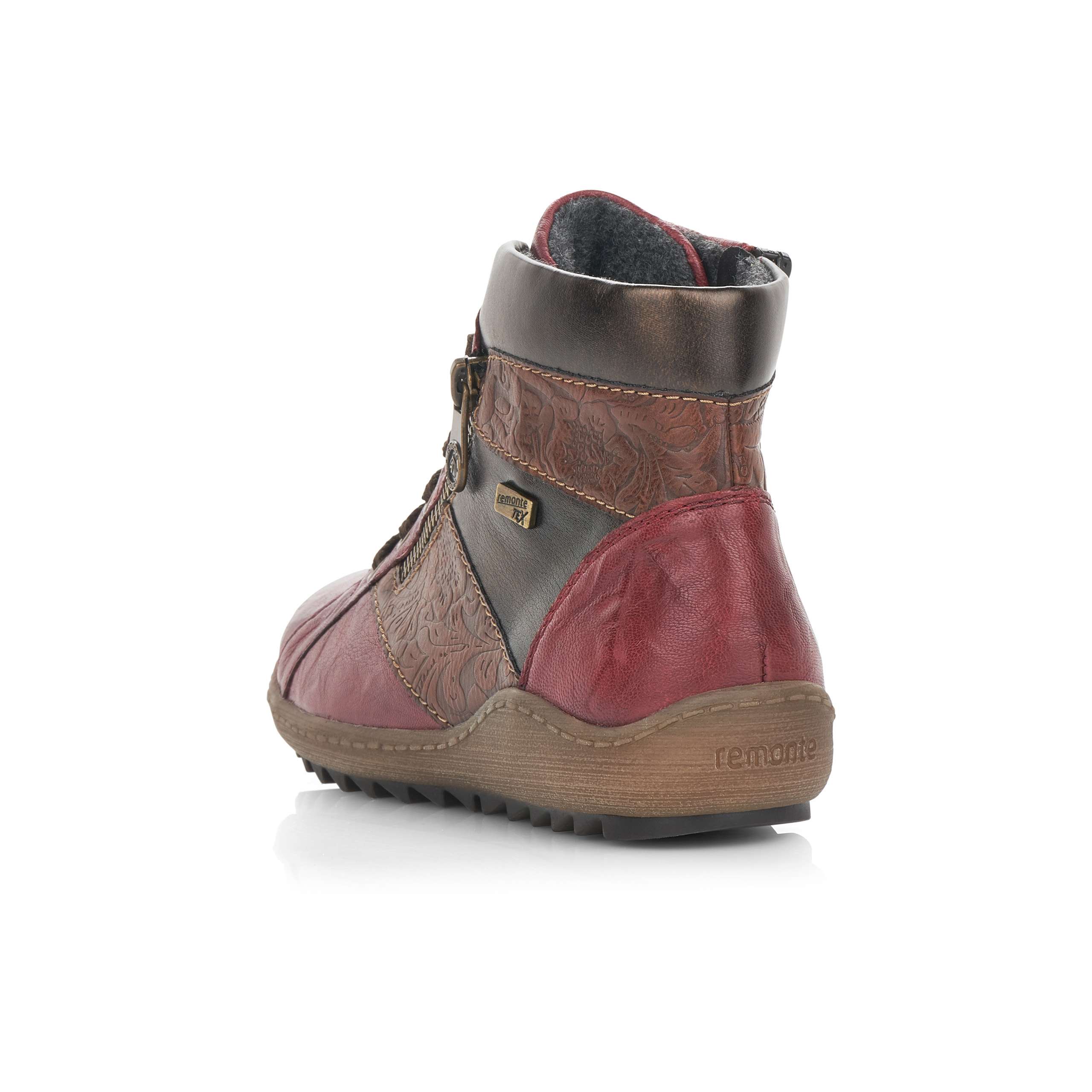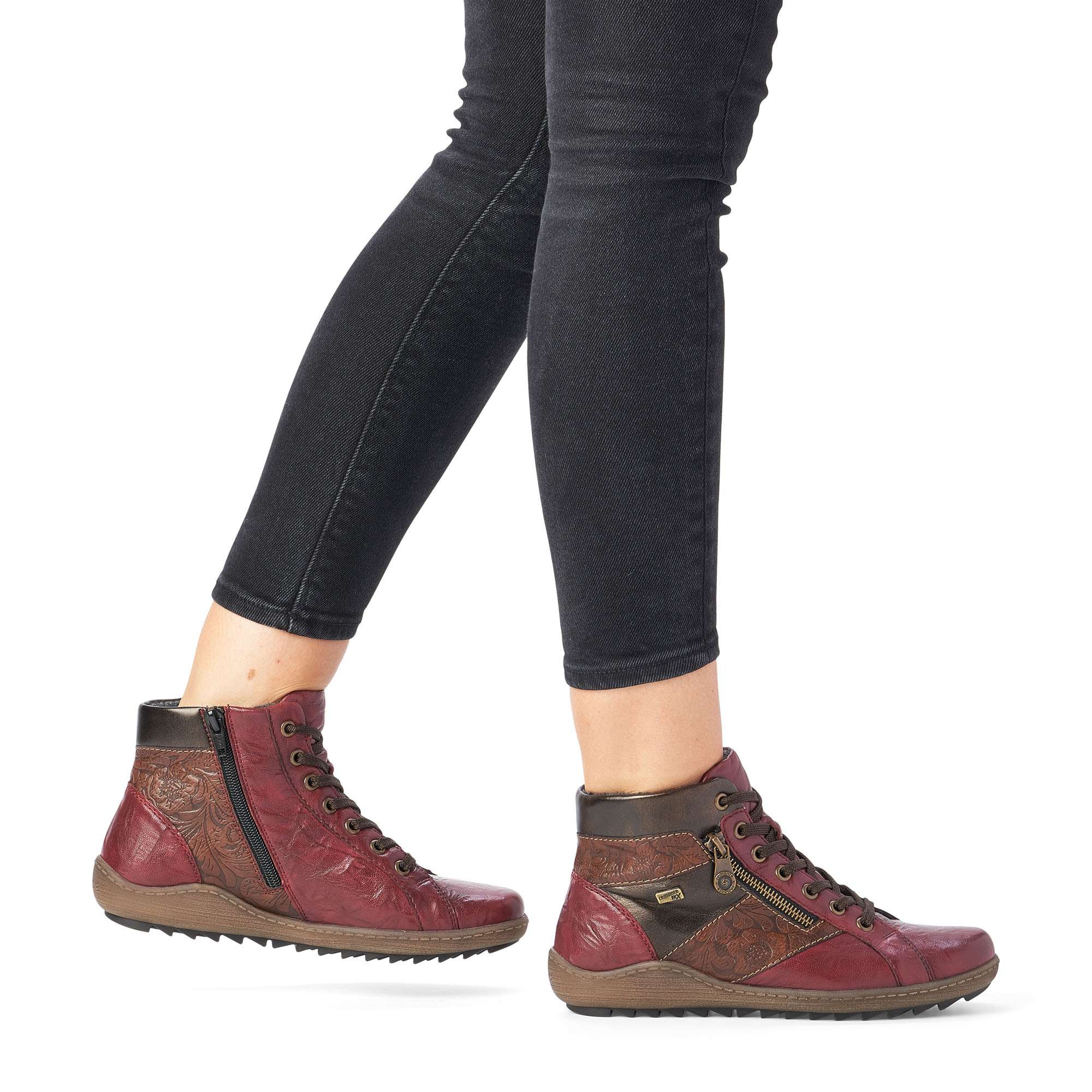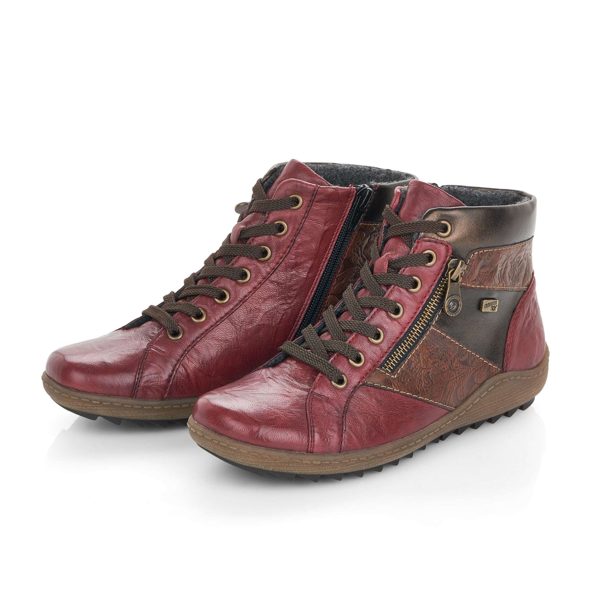 Kotníková obuv šitá z pravé kůže je zdobena výraznými designovými prvky na vnější straně obuvi, metalickými odlesky či ozdobným zipem. Pro snadné nazouvání slouží funkční zip na straně vnitřní a šněrováním si obuv přizpůsobíte dle svých představ. Funkční vrstva Remonte TEX se postará o nepromokavost přesto prodyšnost obuvi