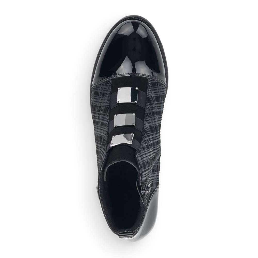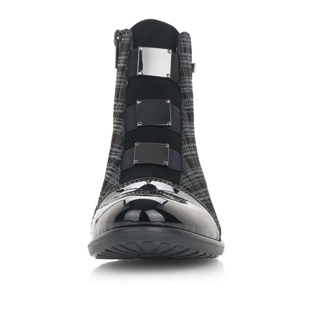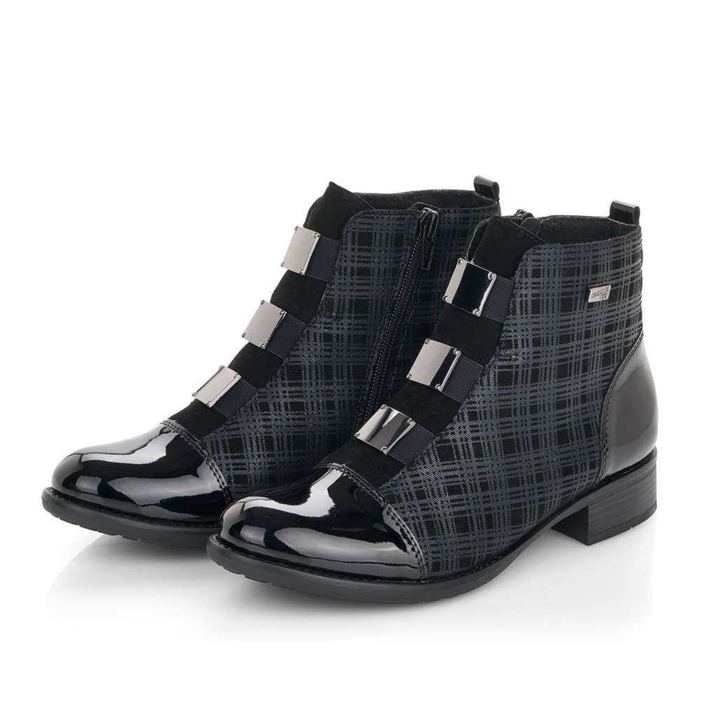 Zajímavá kotníková obuv v krásném designu je to pravé pro Vás. Boty mají na nártu tři ozdobné spony, které drží pružná guma, tím se obuv přizpůsobí i noze s vyšším nártem. Pro lepší obutí má bota funkční zip z vnitřní strany. Přednostmi obuvi je funkční vrstva Remonte TEX, díky které je bota nepromokavá a přesto prodyšná. Tato obuv krásně doplní Váš zimní outfit.