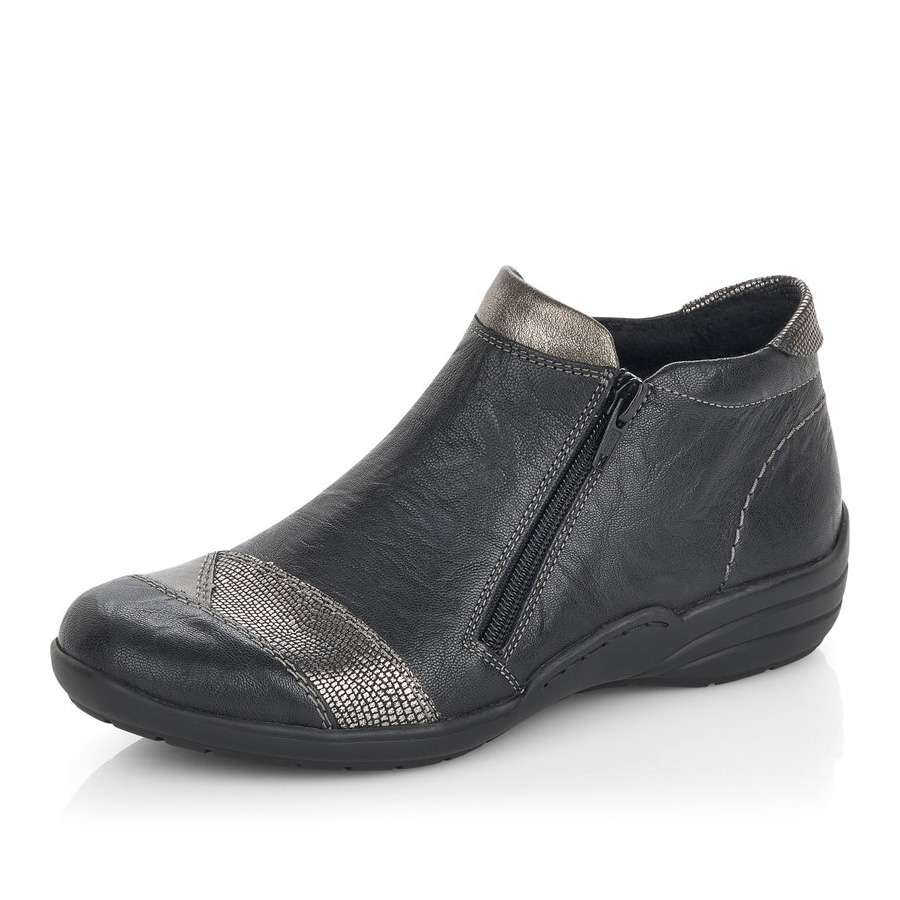 Dámský kožený kotník zdobený elegantní kombinací povrchových materiálů, značky REMONTE (jedná se o vyšší řadu značky RIEKER).