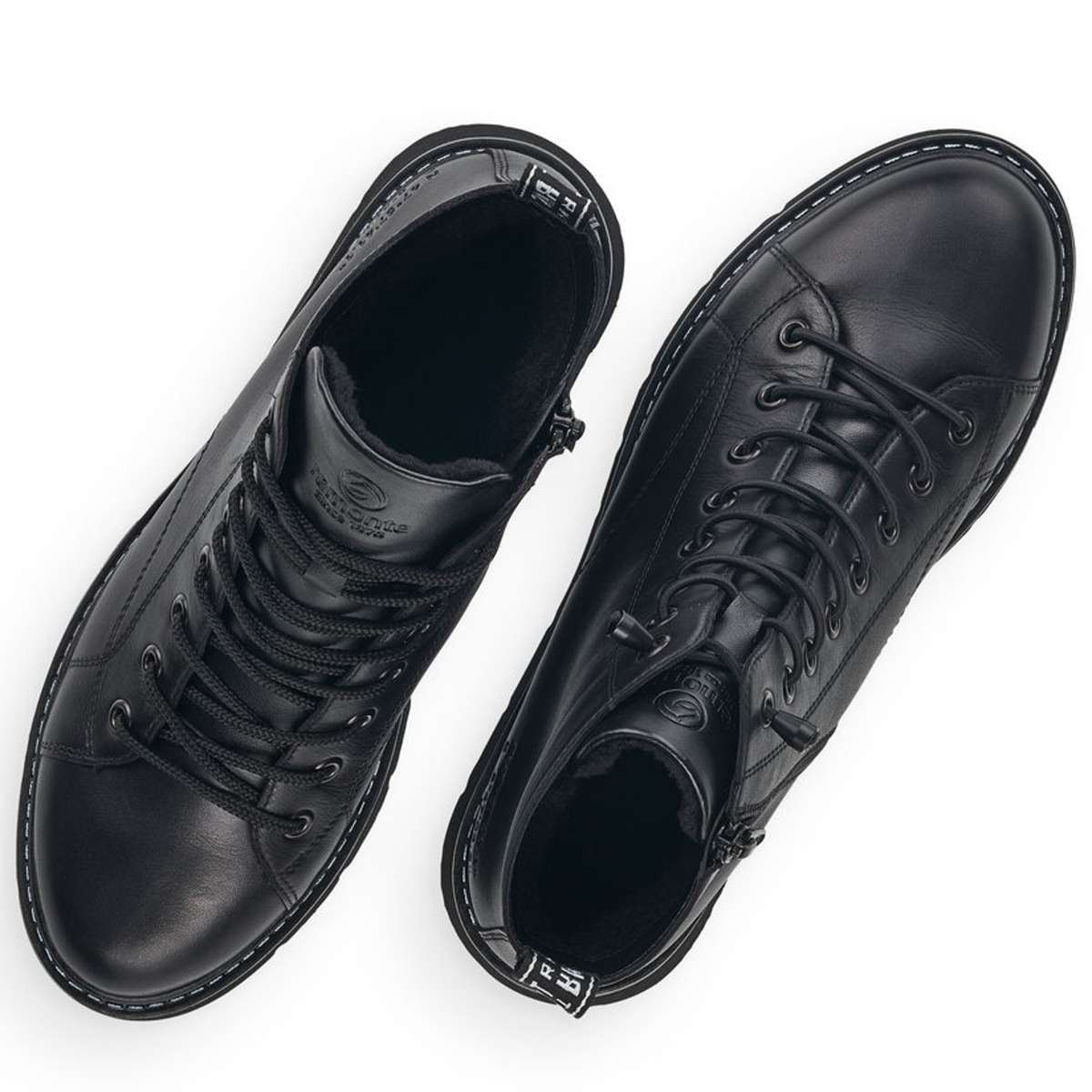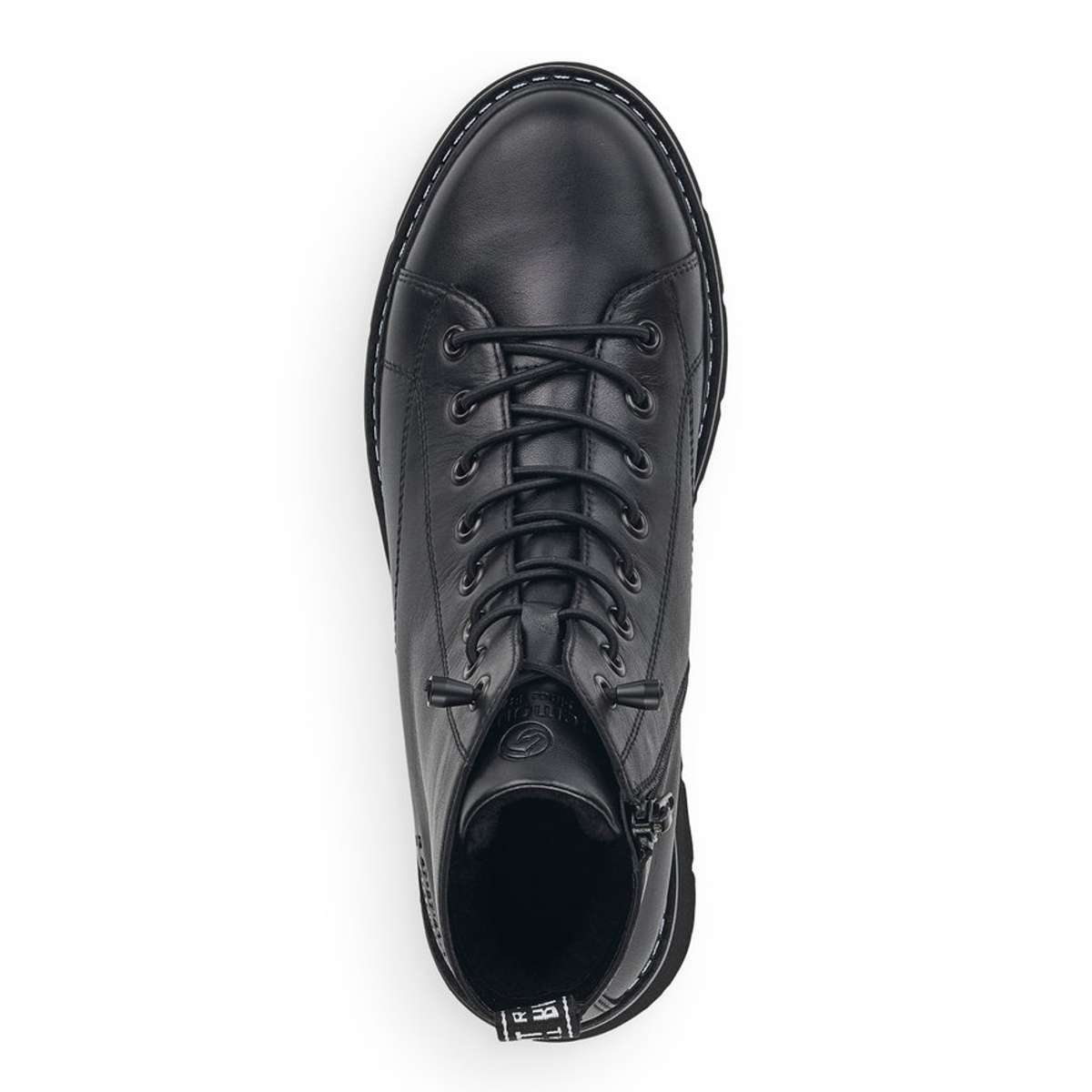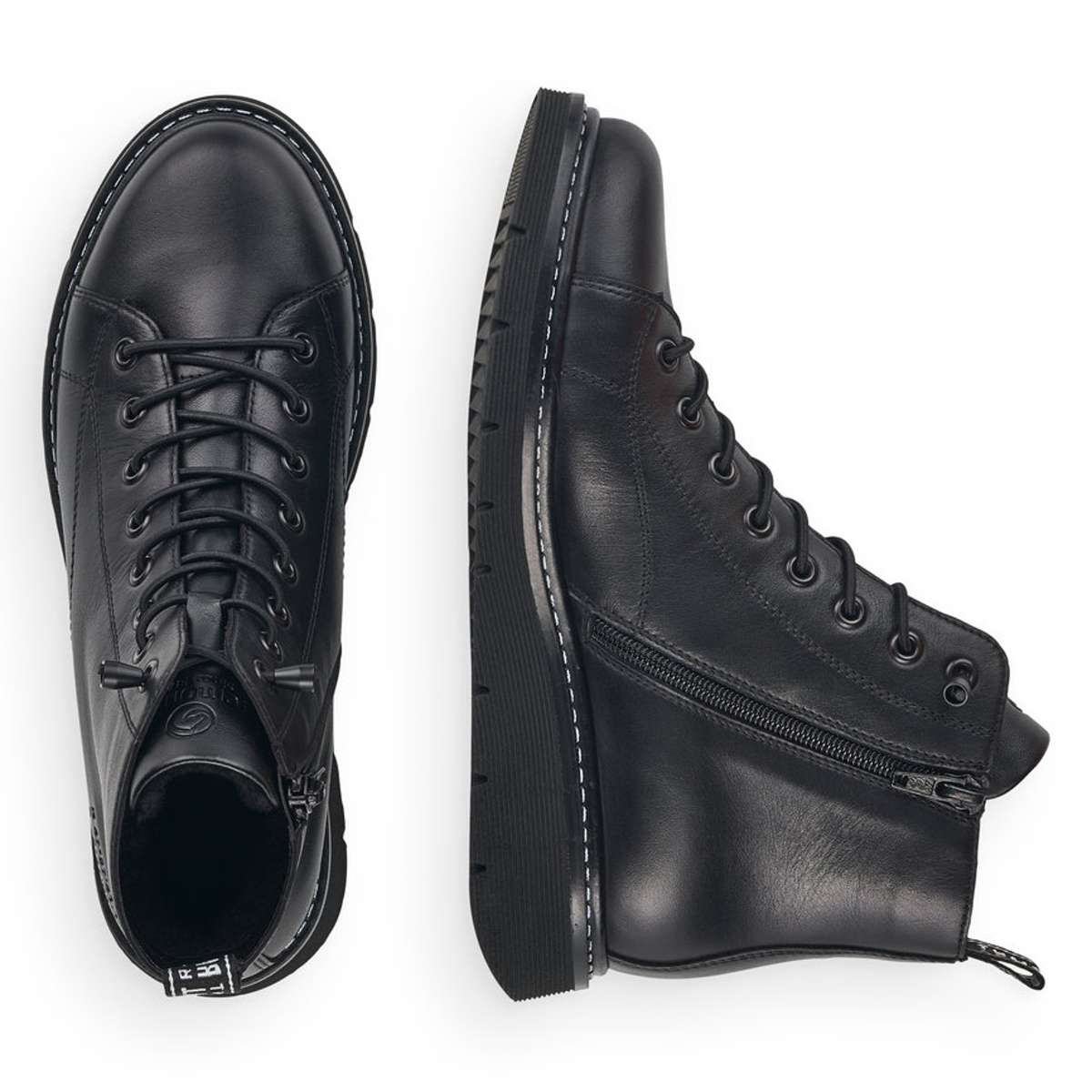 Tato kotníková obuv černé barvy od značky Remonte je vyrobena z kvalitní pravé kůže, což Vás určitě potěší. Má hladký povrch a ozdobný prošívaný lem podešve, který dodává botám dokonalost. Obouvání usnadní jak funkční zip a poutko u horního okraje, tak i tkaničky na šněrování nebo tkaničky pružné, obojí jsou součástí obuvi. Na zimní procházku lesem nebo městem jsou jako stvořené. Měkká vyjímatelná stélka Vám zajistí příjemný pocit i při dlouhodobé chůzi. Pohodlná podšívka z jehněčí vlny zaručí teplo a perfektně zahřeje. Pevná podešev se vzorem pro pevný a jistější krok. Skvěle se budou hodit do Vašeho šatníku.