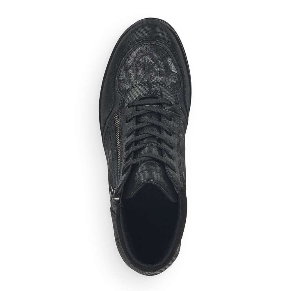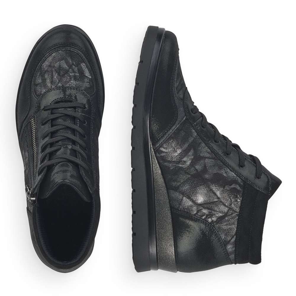 Kombinace materiálu černého a stříbrného mramoru je perfektní souhra originality. Funkční zip s koncovkou ve tvaru kapky spolu se šněrováním Vám ulehčí obutí i vyzutí.