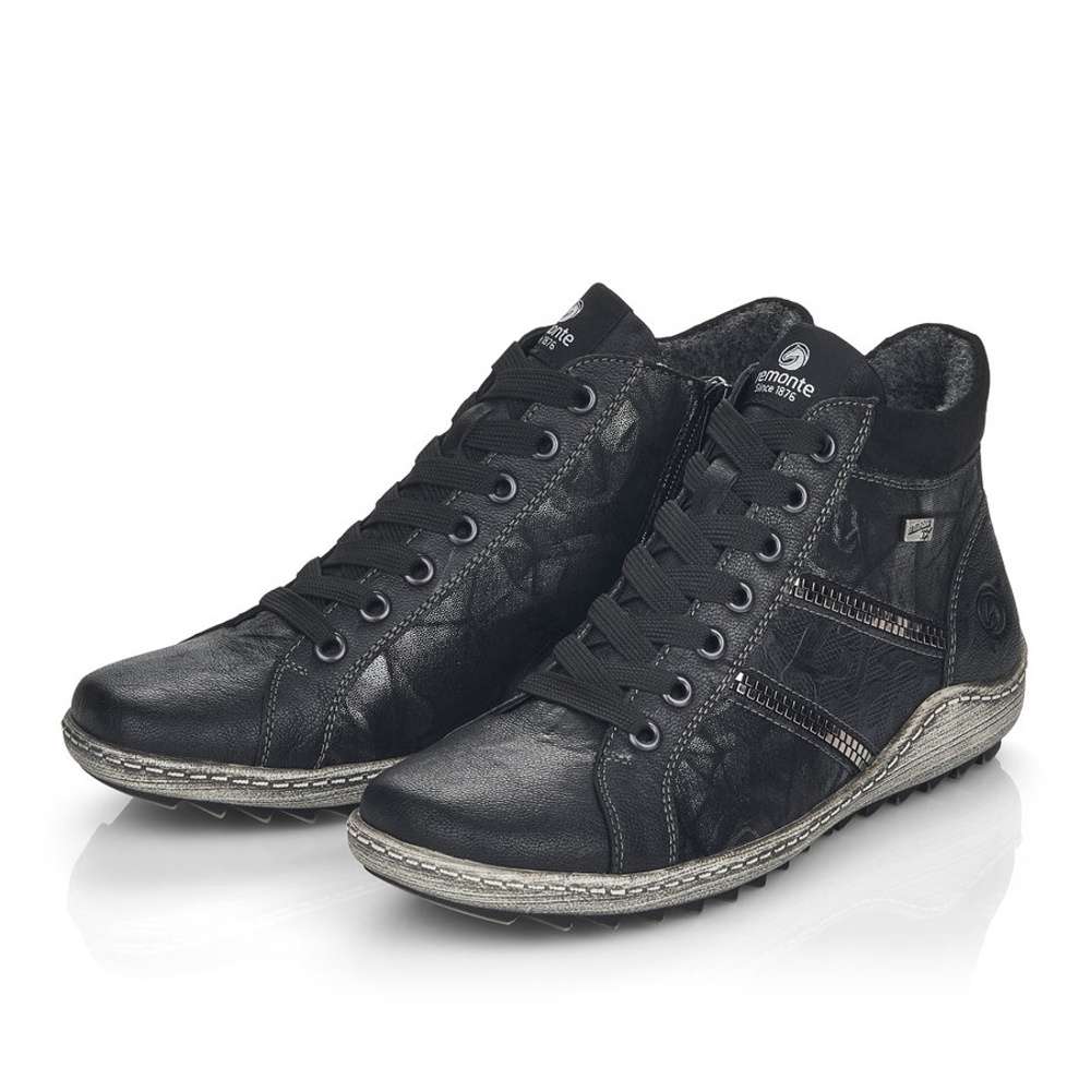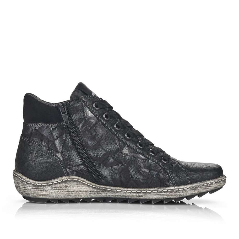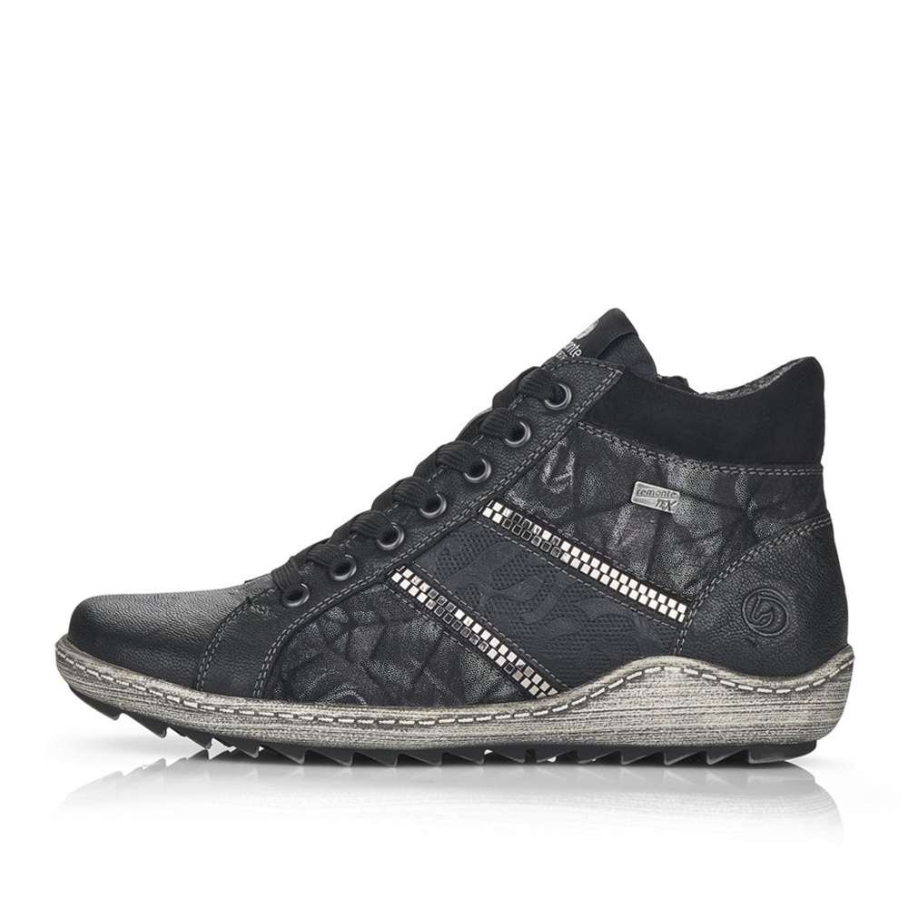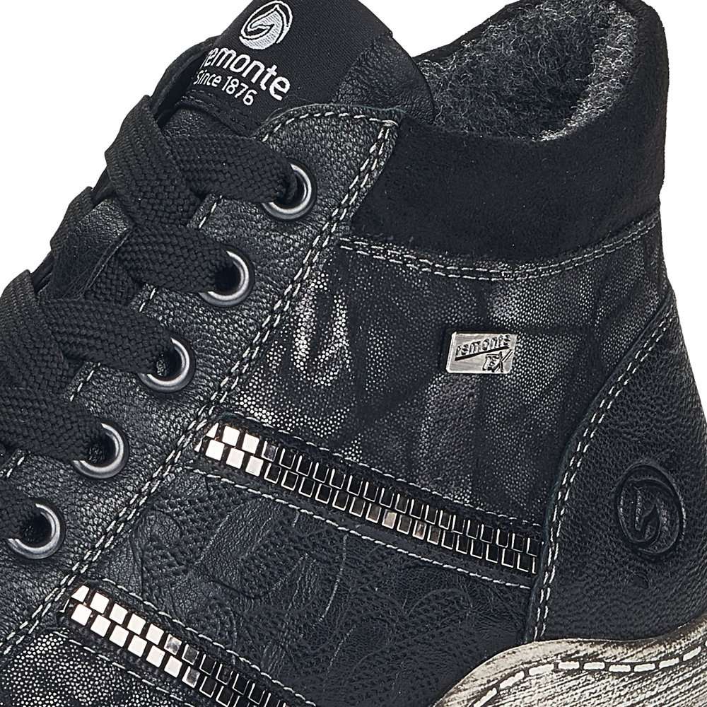 Svršek obuvi je poskládán z několika částí různého designu, které spolu dokonale ladí. Funkční vrstva Remonte TEX se postará o nepromokavost obuvi a snadné nazutí zajistí funkční zip společně se šněrováním.