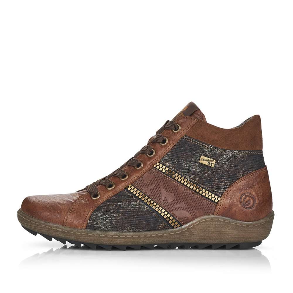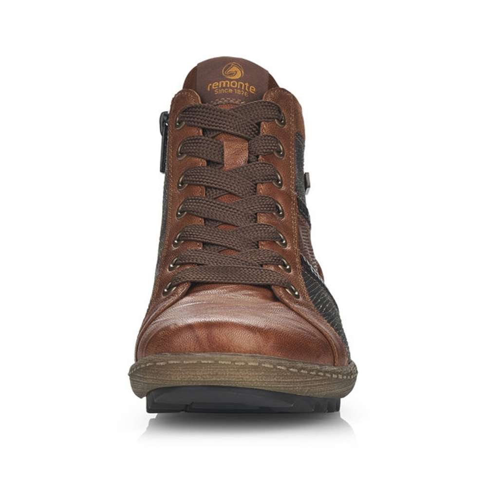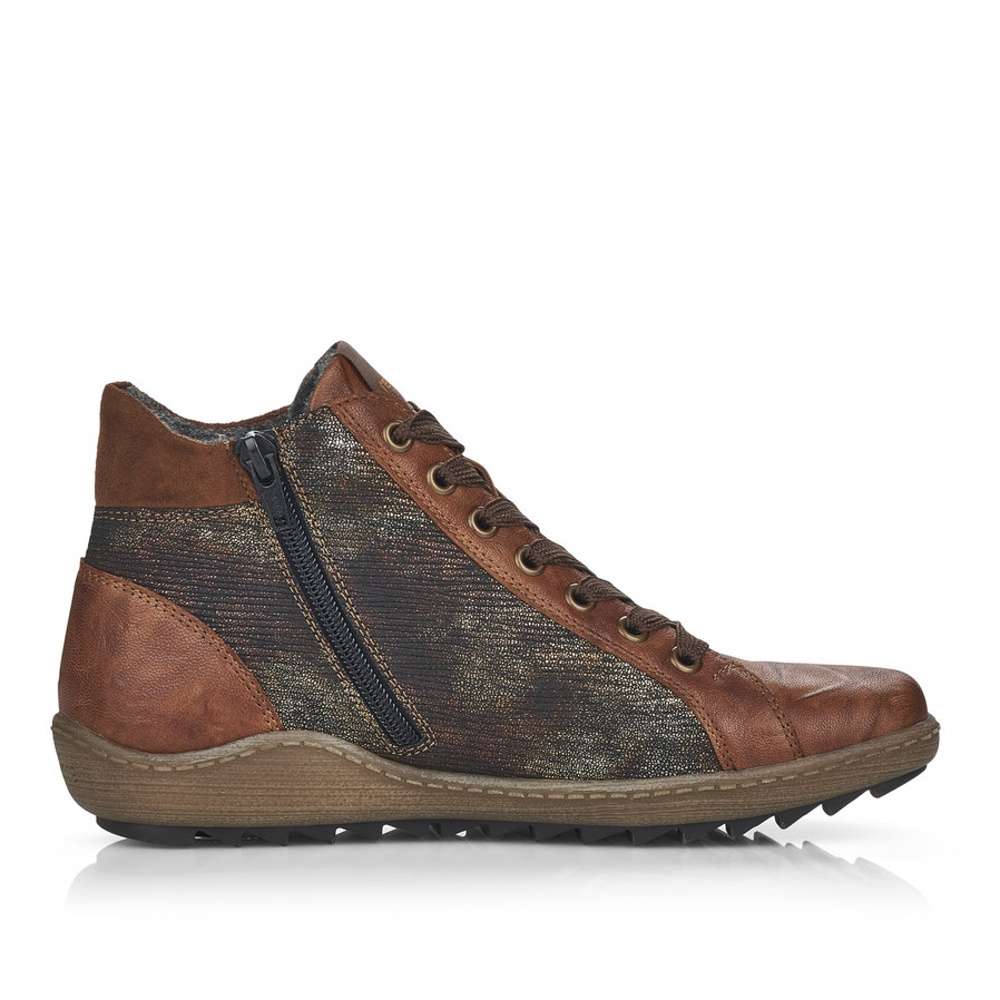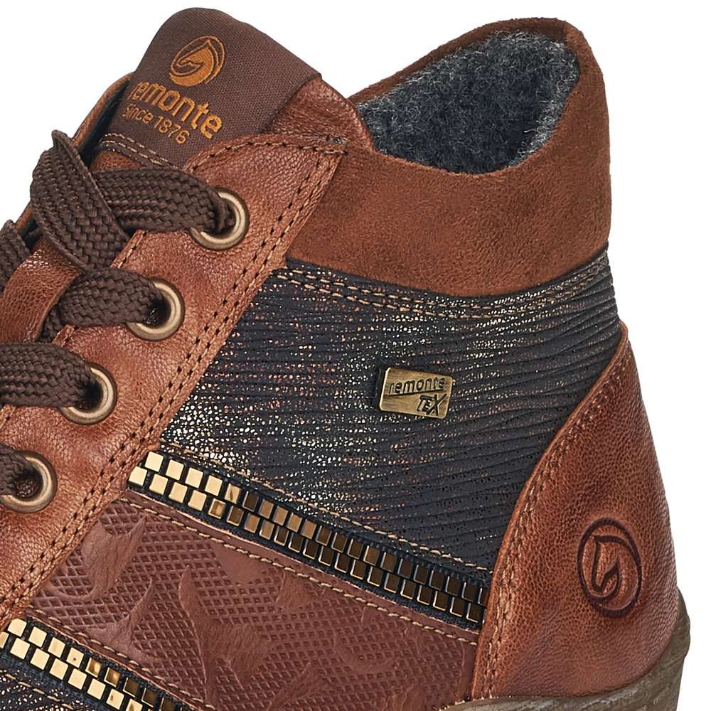 Svršek obuvi je poskládán z několika částí různého designu, které spolu dokonale ladí. Funkční vrstva Remonte TEX se postará o nepromokavost obuvi a snadné nazutí zajistí funkční zip společně se šněrováním.