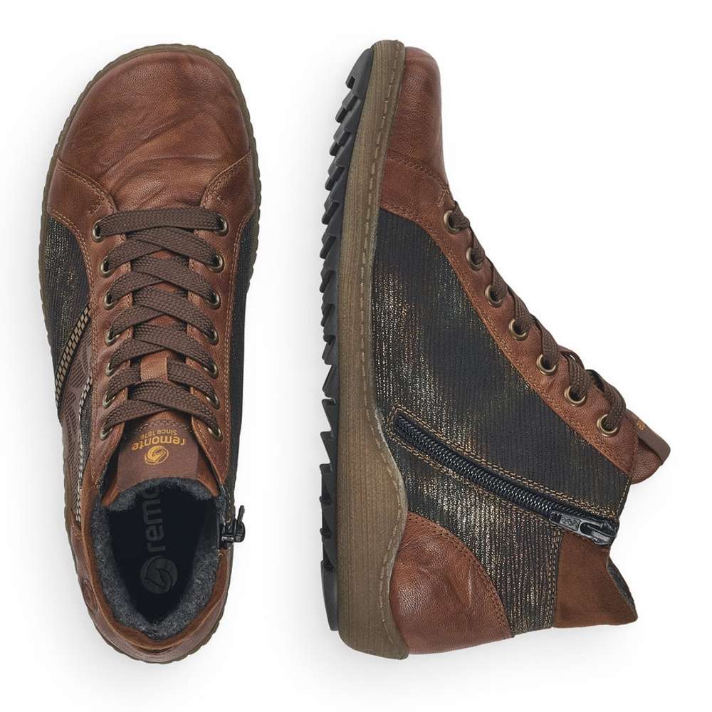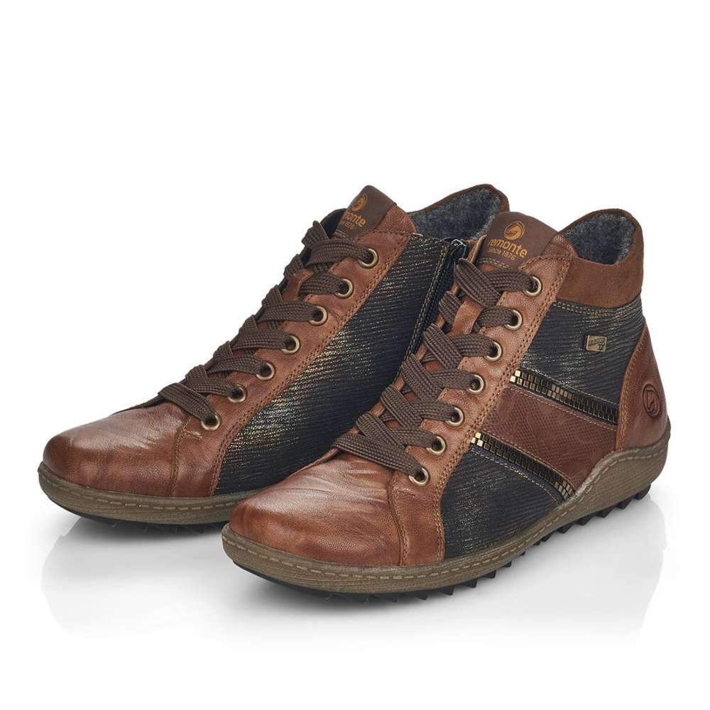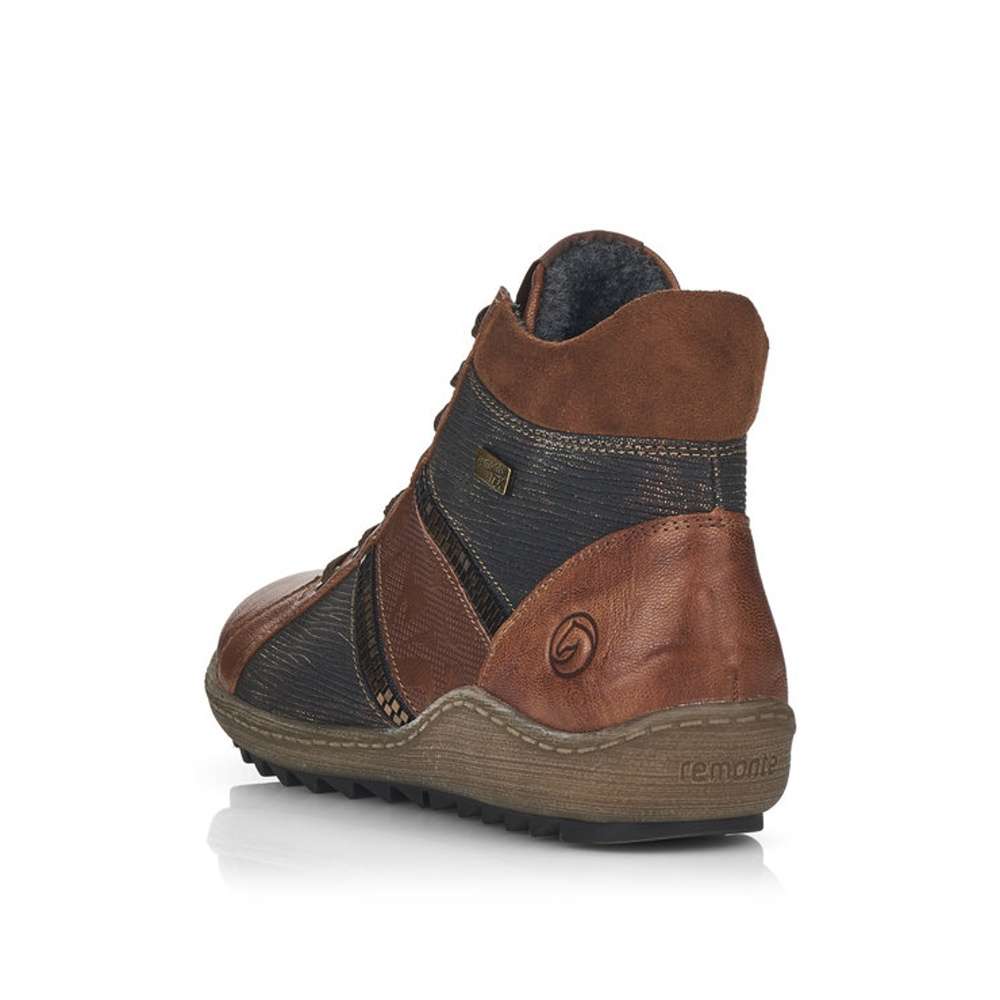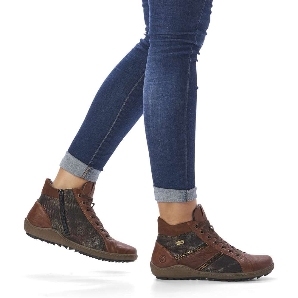 Svršek obuvi je poskládán z několika částí různého designu, které spolu dokonale ladí. Funkční vrstva Remonte TEX se postará o nepromokavost obuvi a snadné nazutí zajistí funkční zip společně se šněrováním.
