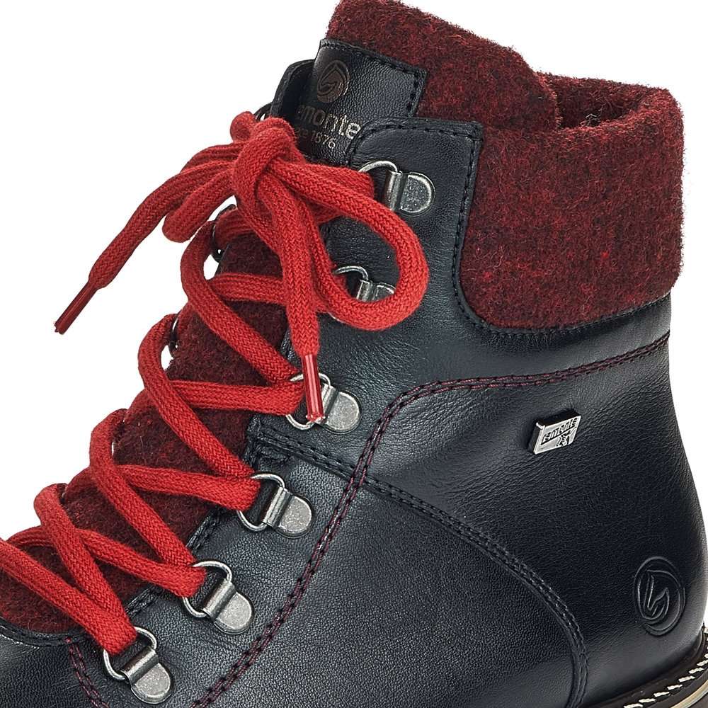 Kontrastní textilní lemování kolem kotníku, prošívání či vytlačené logo značky jsou zdobné prvky tohoto kotníku. Funkční vrstva Remonte TEX zajistí nepromokavost přesto prodyšnost obuvi a snadno si nazujete díky zipu a kontrastním tkaničkám.