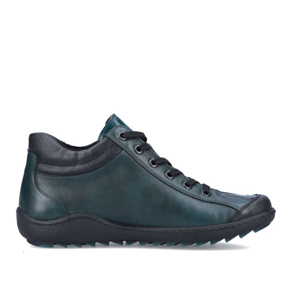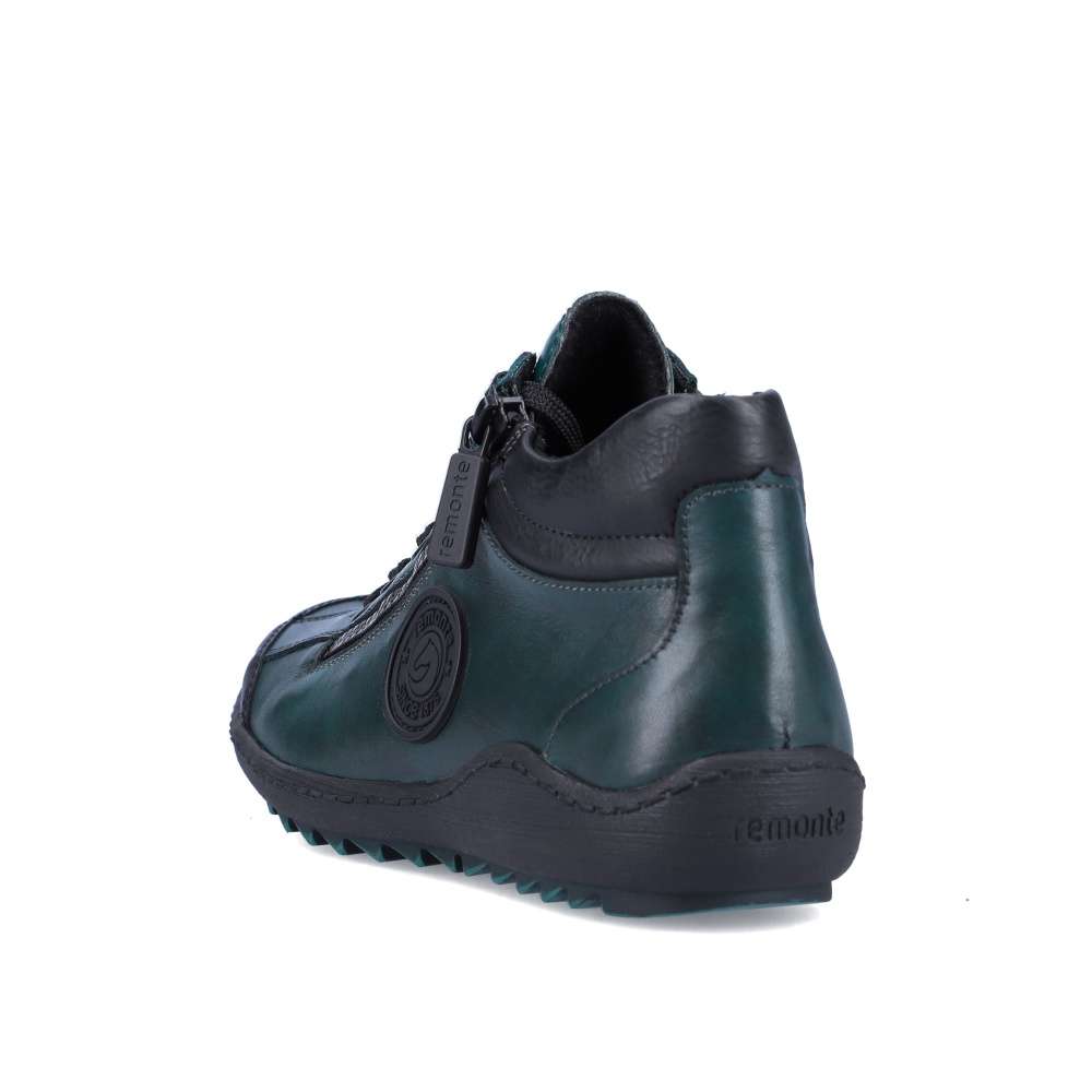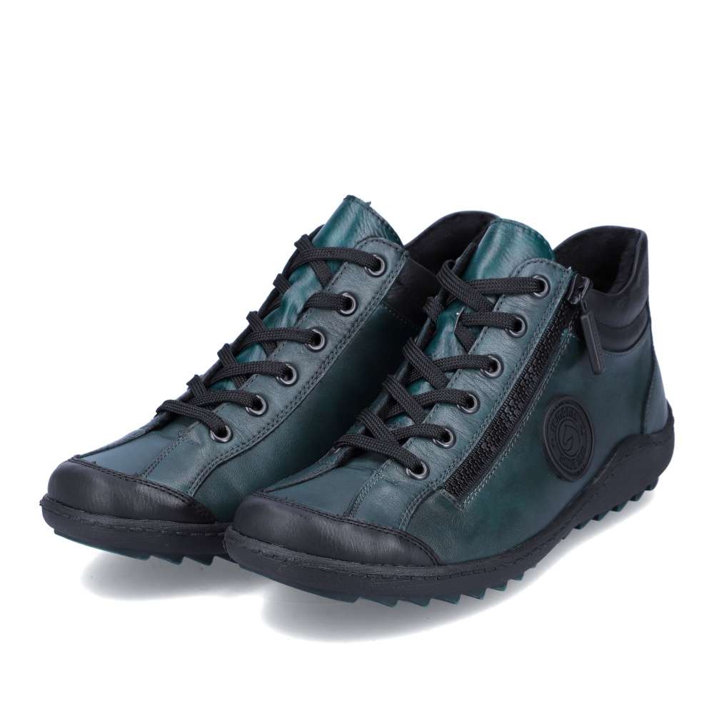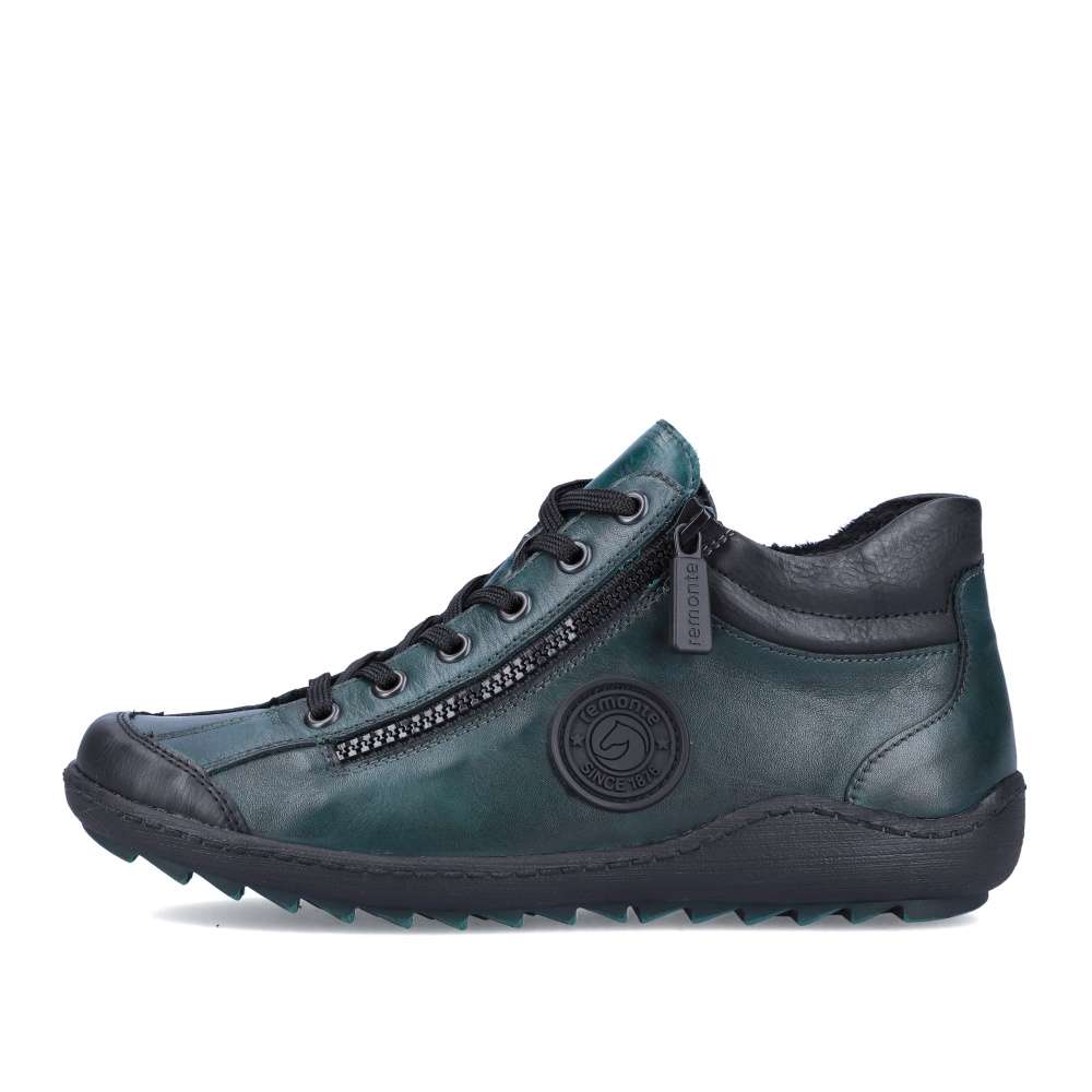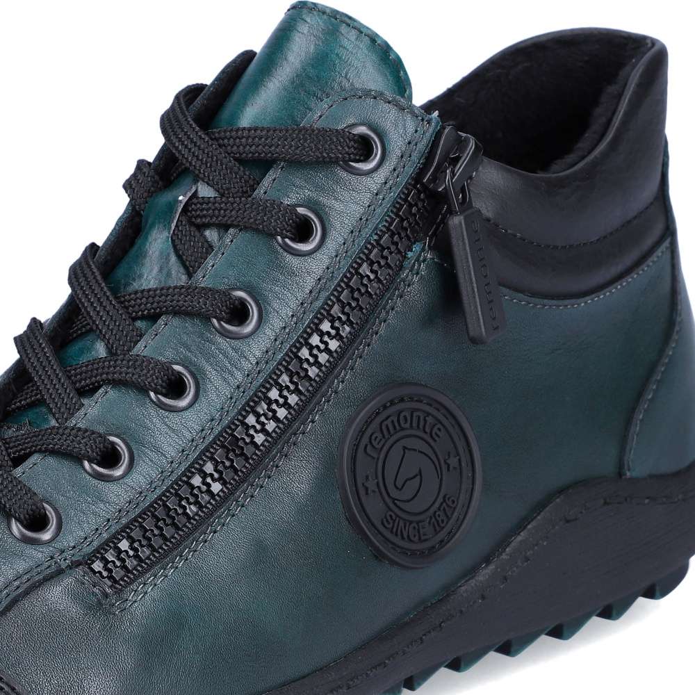 Obuv REMONTE – jedná se o vyšší řadu značky RIEKER, tato obuv se vyznačuje vynikající kombinací svrchních materiálů. Dámská kotníková obuv šitá z pravé kůže doplněná kvalitními syntetickými prvky má svršek poskládán v kombinaci zelenomodré a černé barvy. Nazutí Vám usnadní zip z vnější strany kotníku a šněrováním si boty přizpůsobíte na Vaši nohu. Podešev má hrubší vzorek díky kterému, bude Váš krok jistý na každém povrchu. Boty z řady Remonte Vám zajistí maximální komfort, pohodlí při celodenním nošení a tento model je vhodný snad ke všem pracovním i běžným outfitům.
