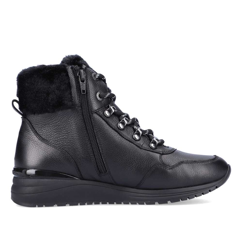 Obuv REMONTE – jedná se o vyšší řadu značky RIEKER, tato obuv se vyznačuje vynikající kombinací svrchních materiálů. Tento model kotníkové obuvi byl vytvořen pro ty z Vás, které máte rády tenisky, ale v zimně přece jen chcete mít nohy v teple. Černý kožený svršek zdobný jemným prošíváním, vytlačeným logem značky je kolem kotníku ozdoben lemováním kožíškem. Pro rychlé nazouvání Vám poslouží funkční zip a šněrováním si obuv přizpůsobíte dle požadavků. Pohodlí na každém kroku zajistí podšívka z pravé ovčí vlny, vyjímatelná paměťová stélka a vyšší podešev. Boty z řady Remonte Vám zajistí maximální komfort při celodenním nošení a vhodné budou například k džínům anebo úzkým kalhotám. Technologie: Podšívka je vyrobena z pravé ovčí vlny. SoftFoam – unikátní stélka z paměťové pěny, která změkčuje došlap, maximálně se přizpůsobí tvaru Vašeho chodidla, ale zároveň ji můžete vyjmout, vyměnit nebo vyvětrat. Tato bota je vybavena vyjímatelnou stélkou.