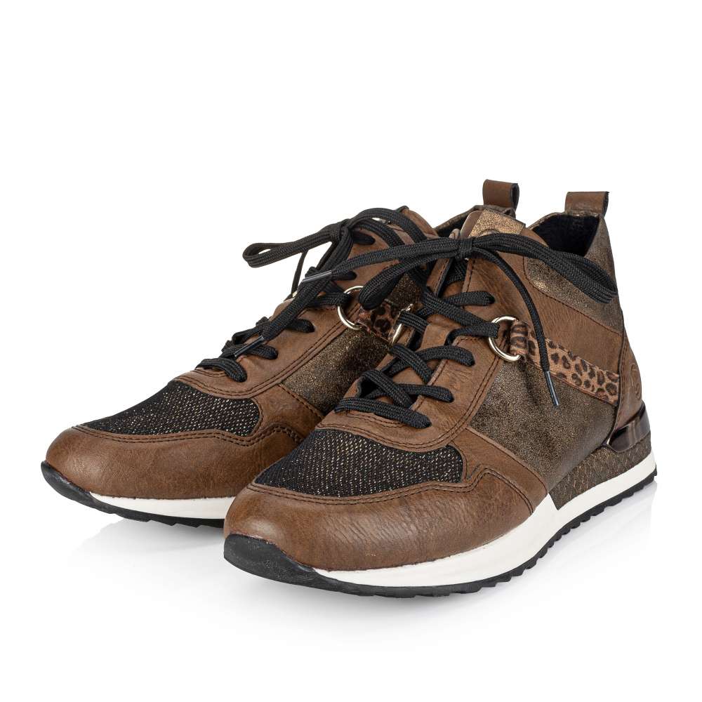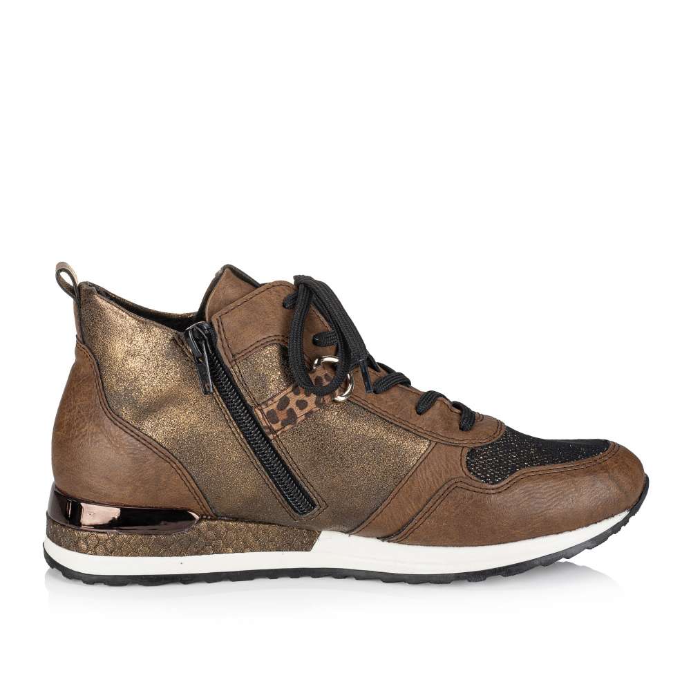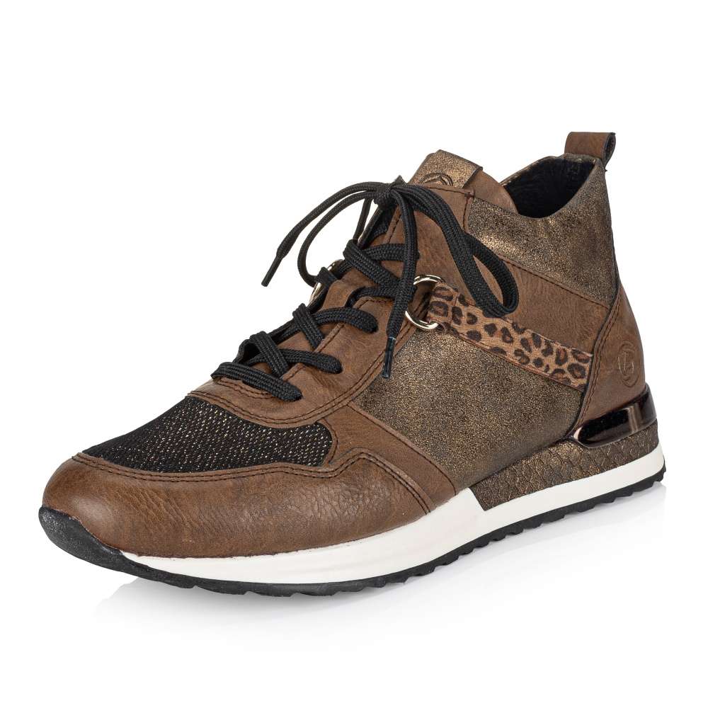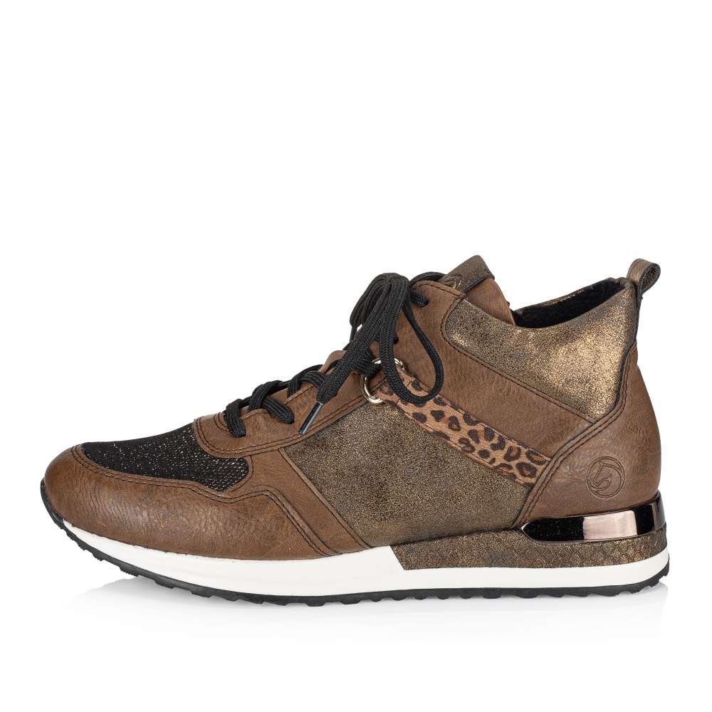 Detailní informace Obuv REMONTE – jedná se o vyšší řadu značky RIEKER, tato obuv se vyznačuje vynikající kombinací svrchních materiálů. Tato kotníková obuv svým teniskovým vzhledem doladí Vaše zimní outfity k dokonalosti. Svršek je složen z lesklých, jemně broušených a textilních částí, které jsou pro dokonalý vzhled doplněny zvířecím motivem. Snadno si obuv nazujete díky funkčnímu zipu a šněrování tkaničkami. Pro Vaše pohodlí na každém kroku je vyjímatelná stélka vyrobena z paměťové pěny a kvalitní podešev svým provedením doladí celkový vzhled obuv k dokonalosti. Boty z řady Remonte Vám zajistí maximální pohodlí při celodenním nošení a tento model byl navržen tak, aby vyhovoval potřebám dnešní moderní ženy.
