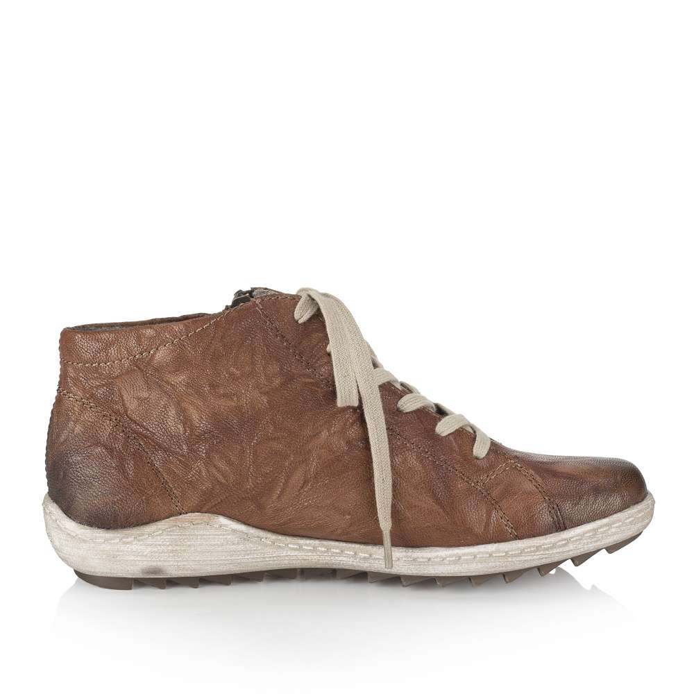 Detailní informace Obuv REMONTE – jedná se o vyšší řadu značky RIEKER, tato obuv se vyznačuje vynikající kombinací svrchních materiálů. Dámský kožený kotník s hřejivým zateplením je ozvláštněn jemným prošíváním a vytlačeným logem značky. Nazouvání Vám usnadní zip z vnější strany a šněrováním si boty přizpůsobíte na Vaši nohu. Pohodlí na každém kroku pocítíte díky vyjímatelné paměťové stélce a kontrastní podešvi se zajímavým vzorkem. Boty budou ideální volbou na chladnější dny ať už si je vezmete do práce či jen na procházku městem.