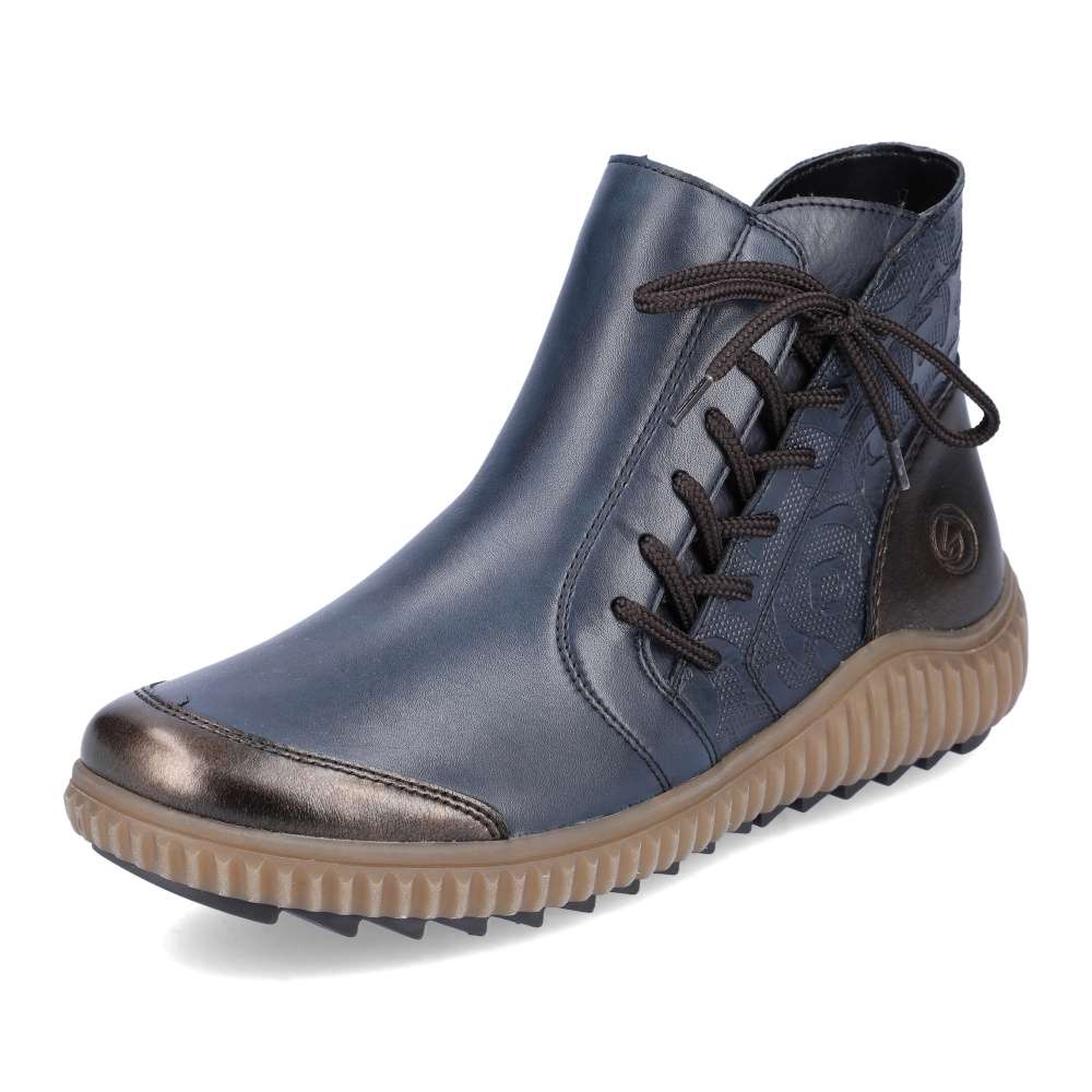 Detailní informace Obuv REMONTE – jedná se o vyšší řadu značky RIEKER, tato obuv se vyznačuje vynikající kombinací svrchních materiálů. Pokud potřebujete extravagantní obuv, která ozvláštní a oživí Váš jednoduchý outfit, naše boty budou skvělou volbou. Obuv nabízí šněrování na boční straně, barevné detaily v patní části i na špičce a kombinace hladkého strukturovaného materiálu dodá na originalitě. Stélka je vyrobena z unikátní paměťové pěny, která se maximálně přizpůsobí tvaru Vašeho chodidla. Pomocí zipu na vnitřní straně do boty lehce vklouznete a můžete vyrazit do města s kamarády, na rodinný výlet, ale také do práce. Boty z řady Remonte Vám zajistí maximální komfort a pohodlí při celodenním nošení.