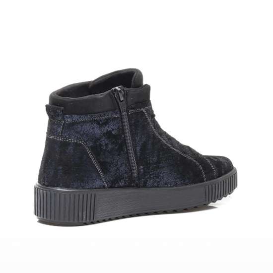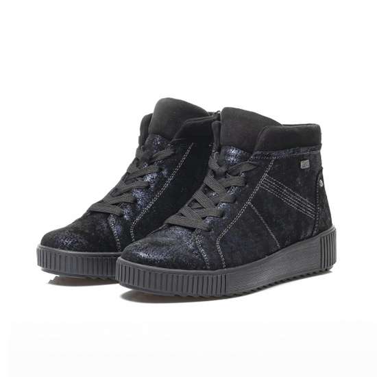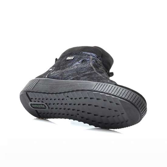 Nádherná kotníková obuv s designovou podešví šitá z broušené kůže v modré barvě s metalickými odlesky. Kotníky mají kulatou špičku, Remonte Tex což je funkční vrstva, textilní podšívku, funkční zip na vnitřní straně, který spolu se šněrováním usnadní obutí. Tento model unosíte jak k sukni do práce, tak ke kalhotám na procházce.