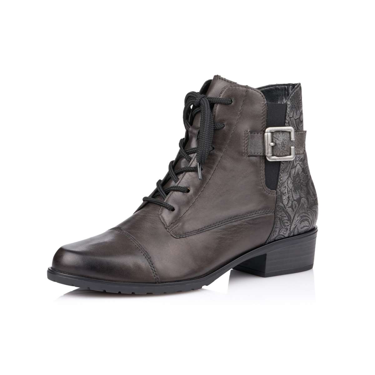 Obuv REMONTE – jedná se o vyšší řadu značky RIEKER, tato obuv se vyznačuje vynikající kombinací svrchních materiálů. Nádherný dámský kotník šitý z pravé kůže krásné šedé barvy doplní každý Váš outfit. Lehké zdobení v podobě květinového vzoru, kovové přezky na vnější straně a nízký podpatek podtrhují ladnost této boty. Vsazená pružná gumička pomůže přizpůsobit se přímo k Vaší noze. Boty z řady Remonte Vám zajistí maximální komfort při celodenním nošení.