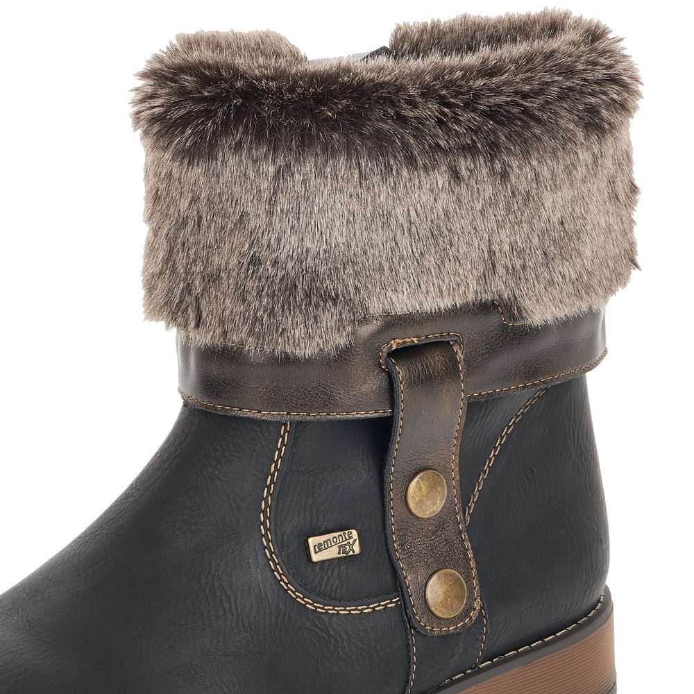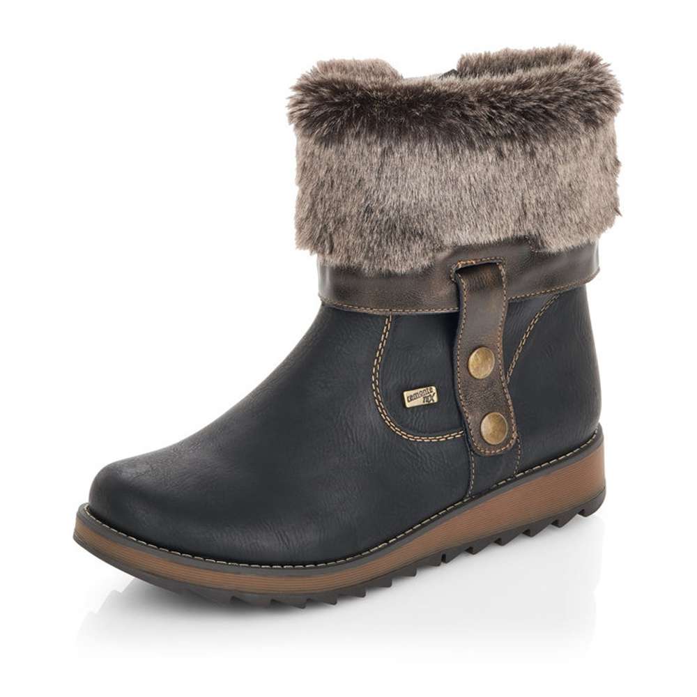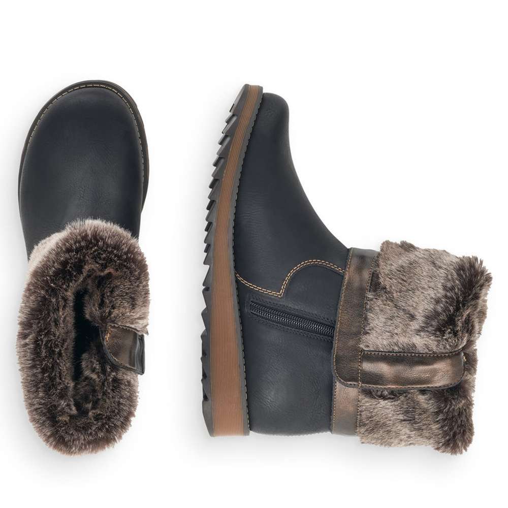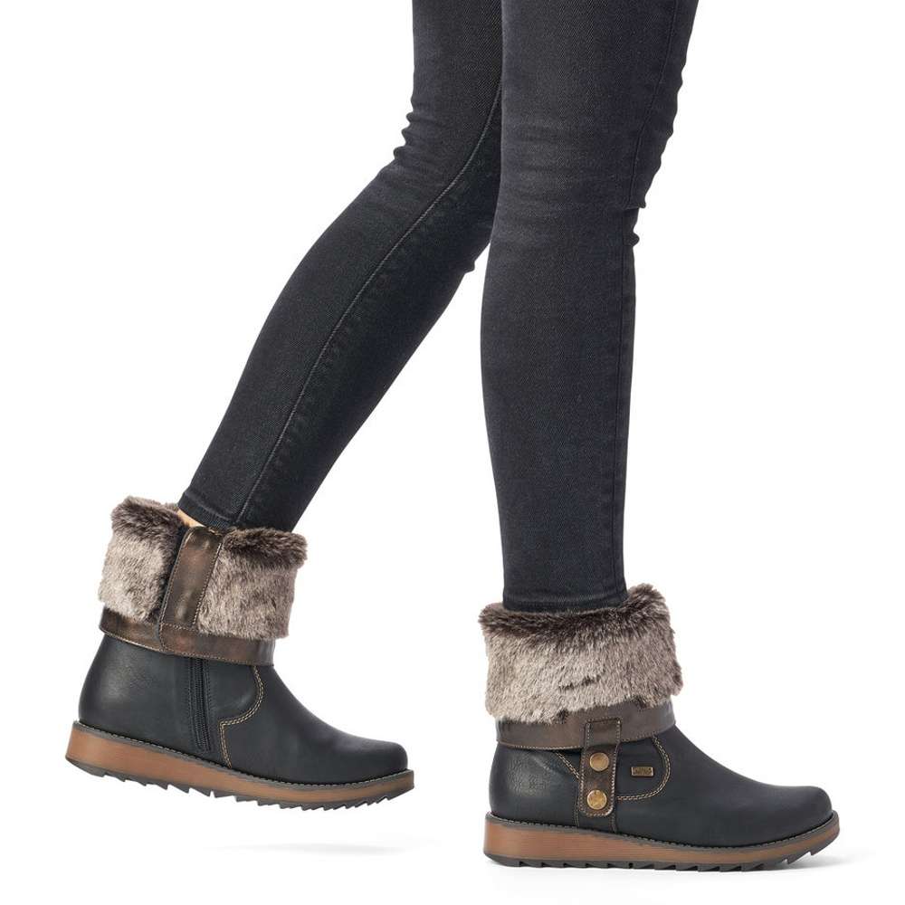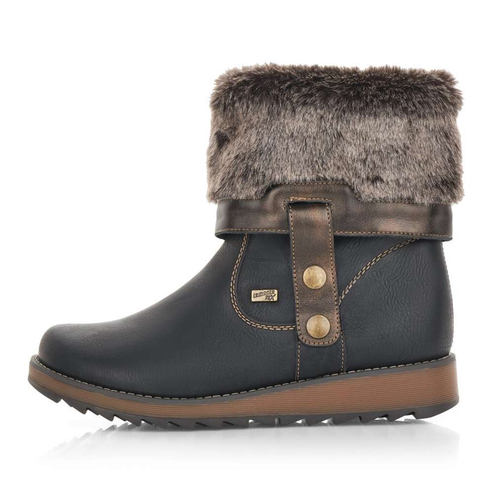 Jemně strukturovaný svršek je zdobný kontrastním prošíváním, bronzovým lemováním okraje obuvi a jemným kožíškem. Technologie Remonte TEX zajistí nepromokavost, ale přesto prodyšnost obuvi. Obuv si snadno nazujete díky funkčnímu zipu a můžete si ji pohodlně vyhrnout a udělat tak z obuvi hřejivé polokozačky.
