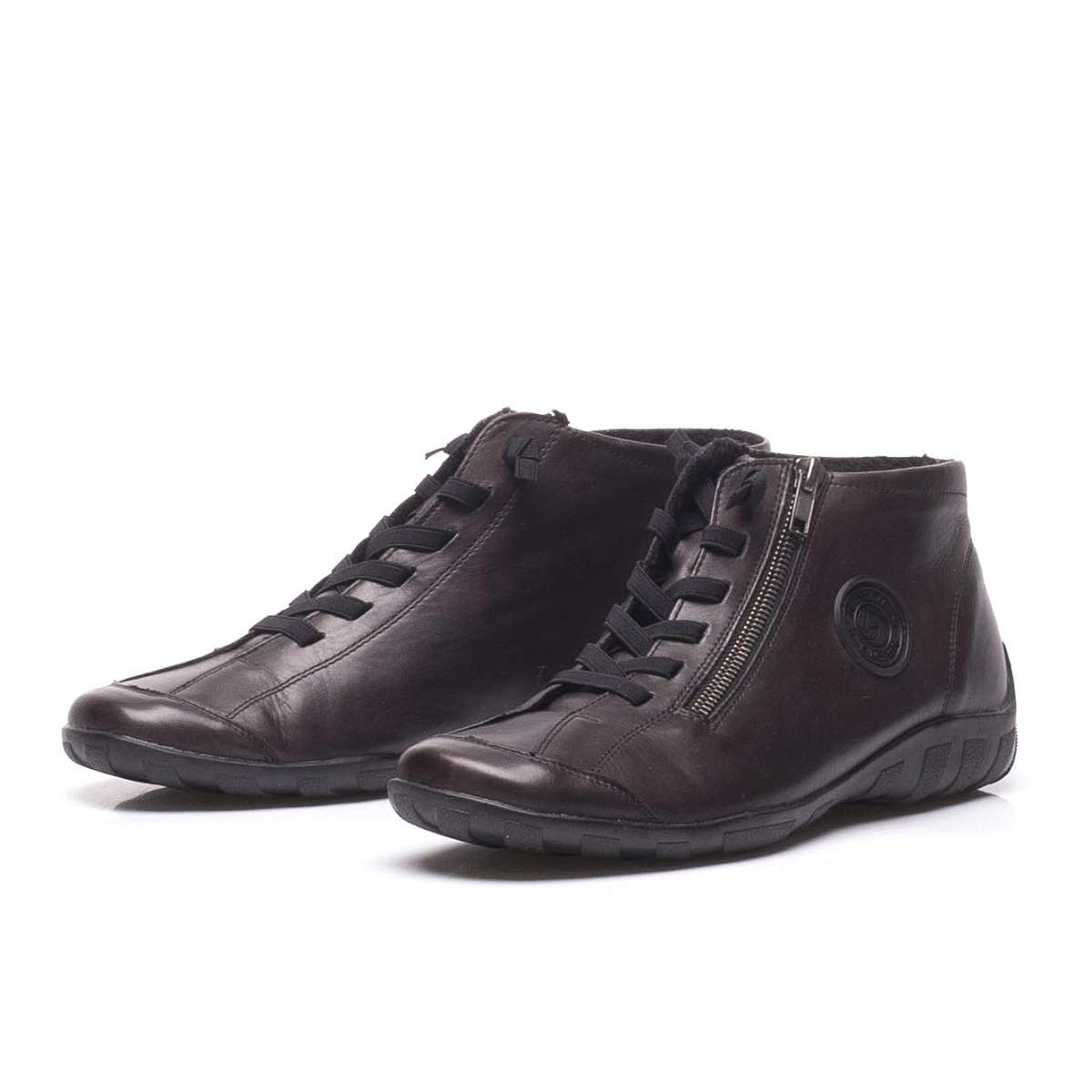 Šedá barva dodává dámskému kotníku jednoduchou eleganci. Má kulatou špičku, elegantní šití černou nití, funkční zip netradičně na vnější straně pro lepší obutí a místo tkaniček jsou provlečeny gumičky. Výrazným zdobným prvkem je pak znak řady Remonte na vnější straně obuvi. Tento kotník je vhodný ke všem outfitům ať už do práce nebo do přírody.