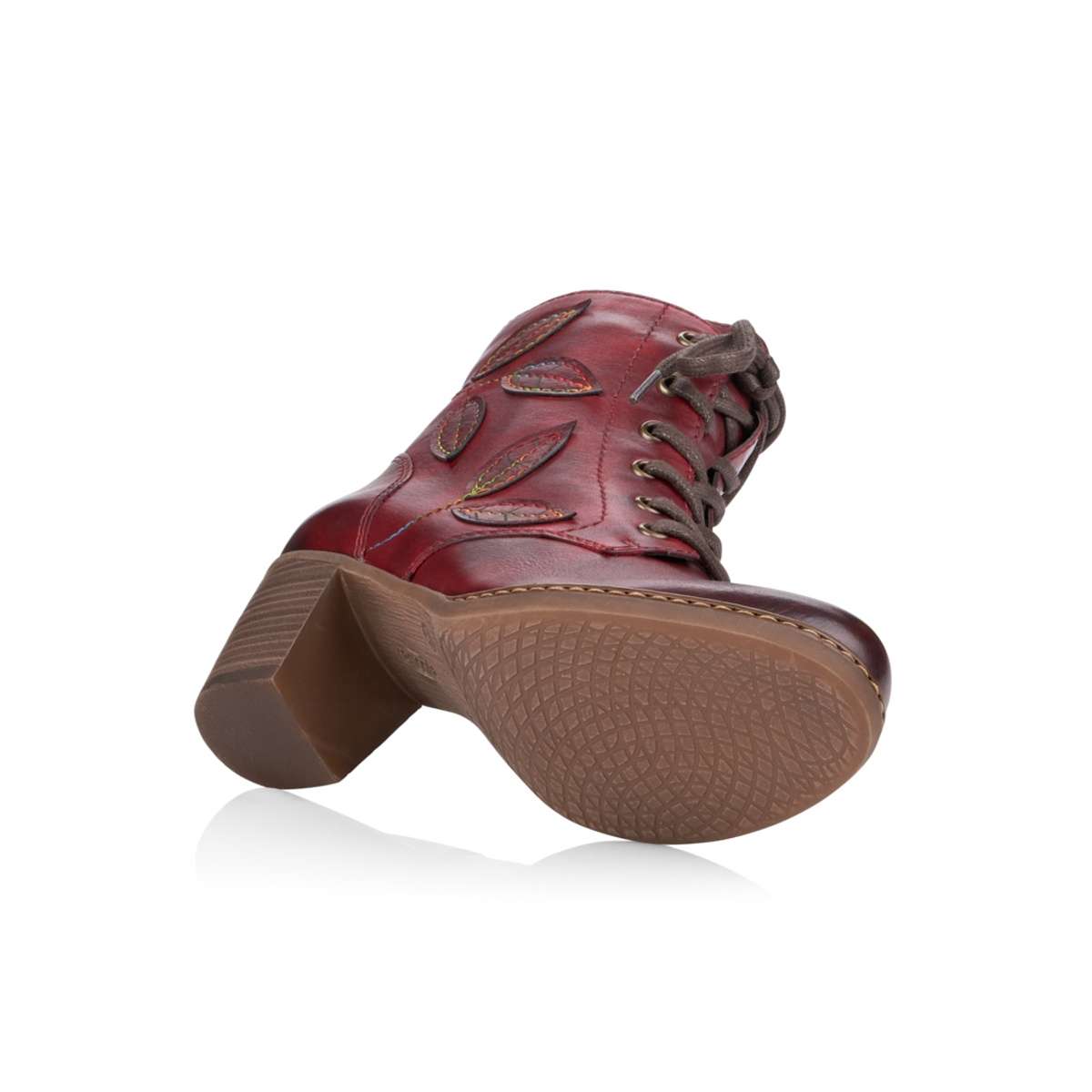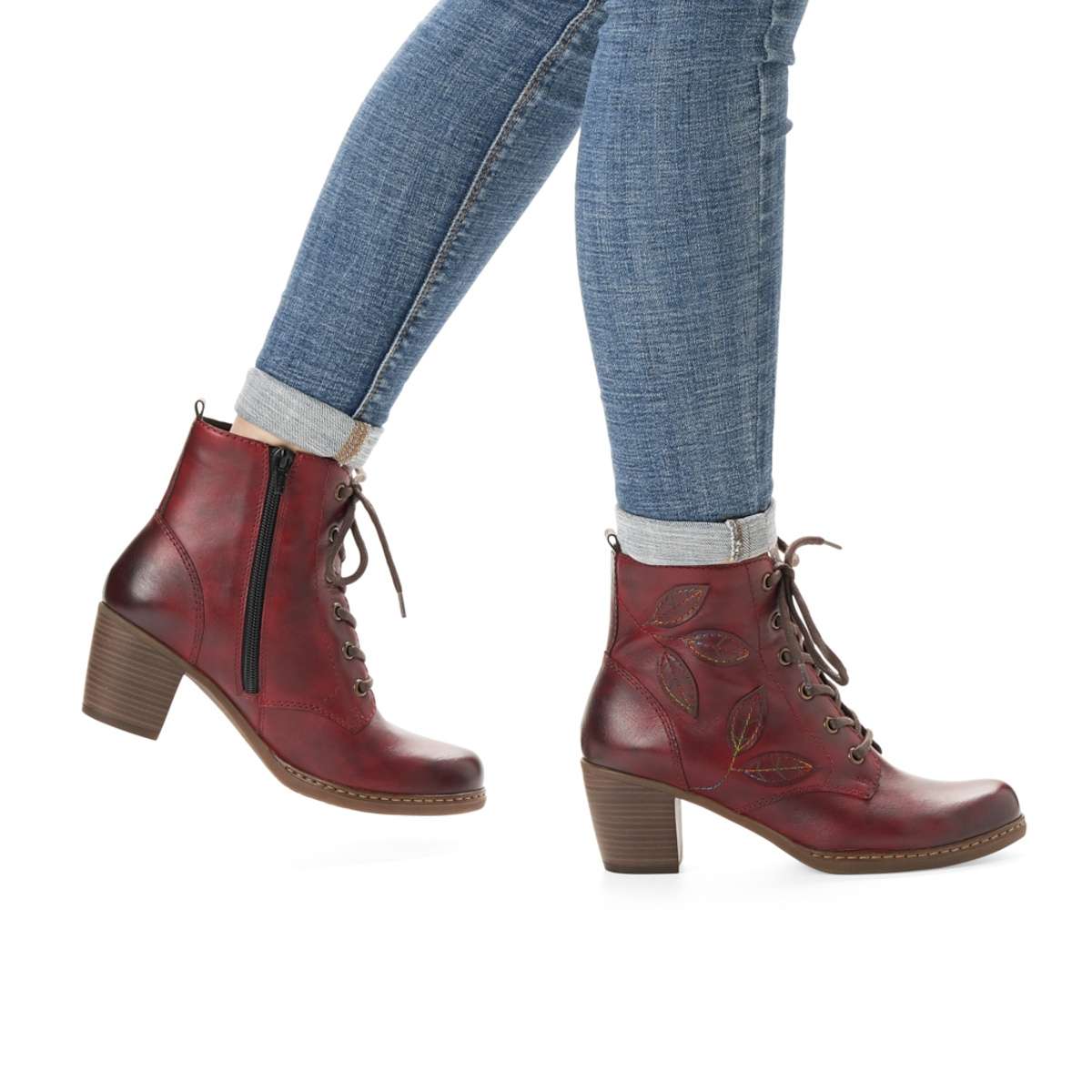 Dámská obuv vínové barvy s lístečkovou aplikací, značky REMONTE (jedná se o vyšší řadu značky RIEKER).