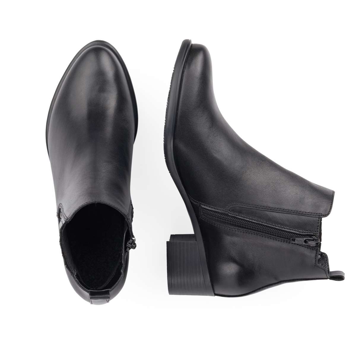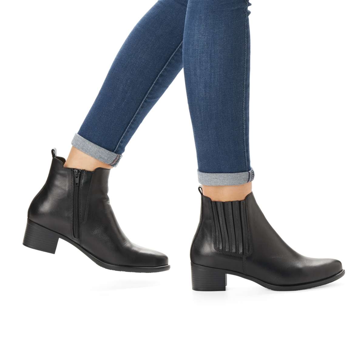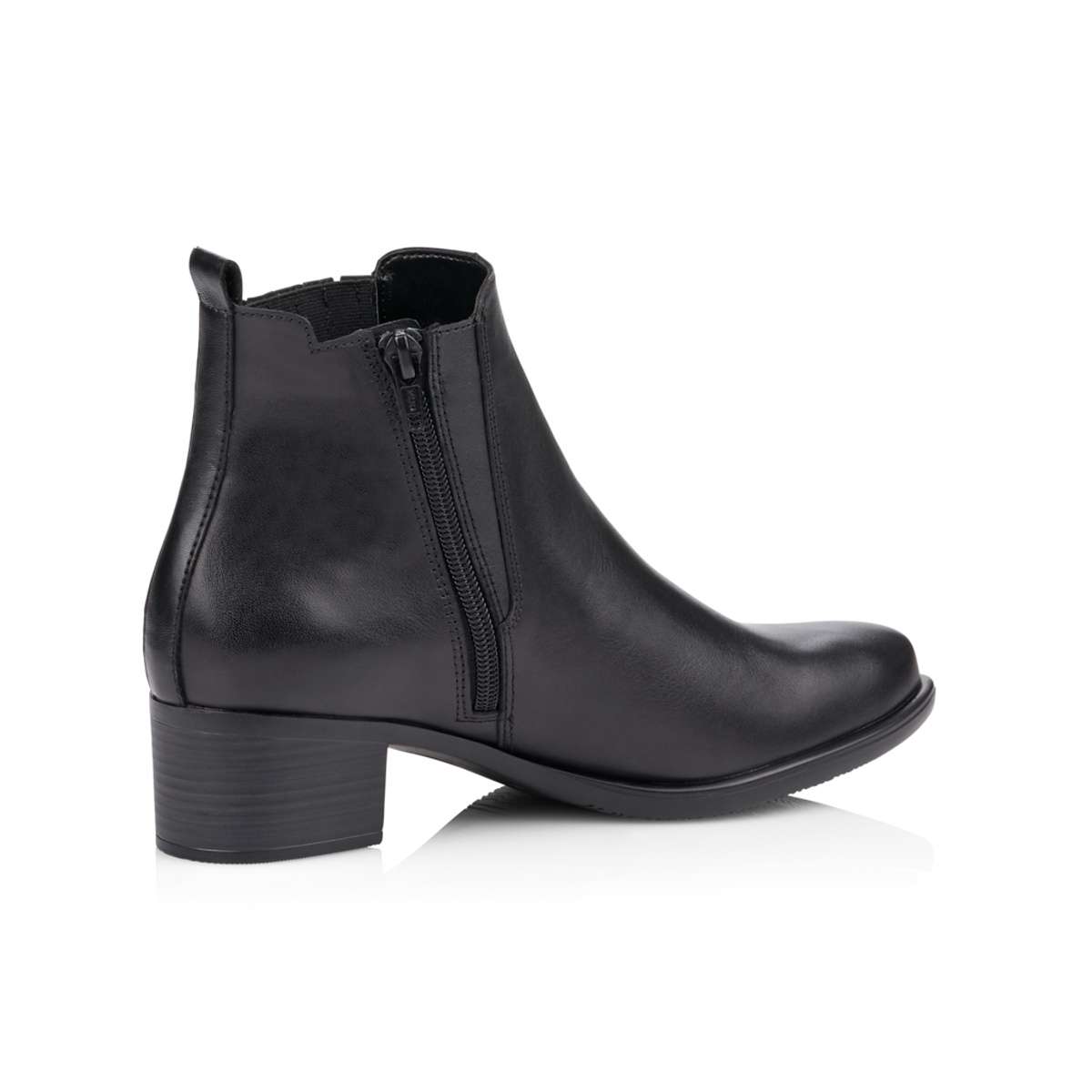 Elegantní kotníkové boty v černé barvě Vám dodají pocit pohodlí. Hladký svršek je z kůže má po obou stranách všité gumy pro lepší obouvání. Měkká hřejivá stélka Vám zajistí pohodlí po celý den. Podešev je vyrobena z kvalitního syntetického materiálu a v nejvyšším bodě je vysoká cca 4,5 cm. Tato obuv krásně vynikne na noze a svou jemností a elegancí jí můžete nosit, jak ke kalhotám, tak k sukni.