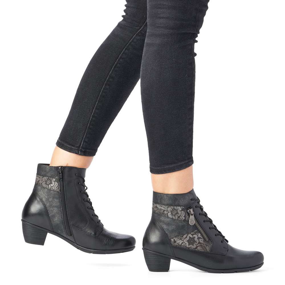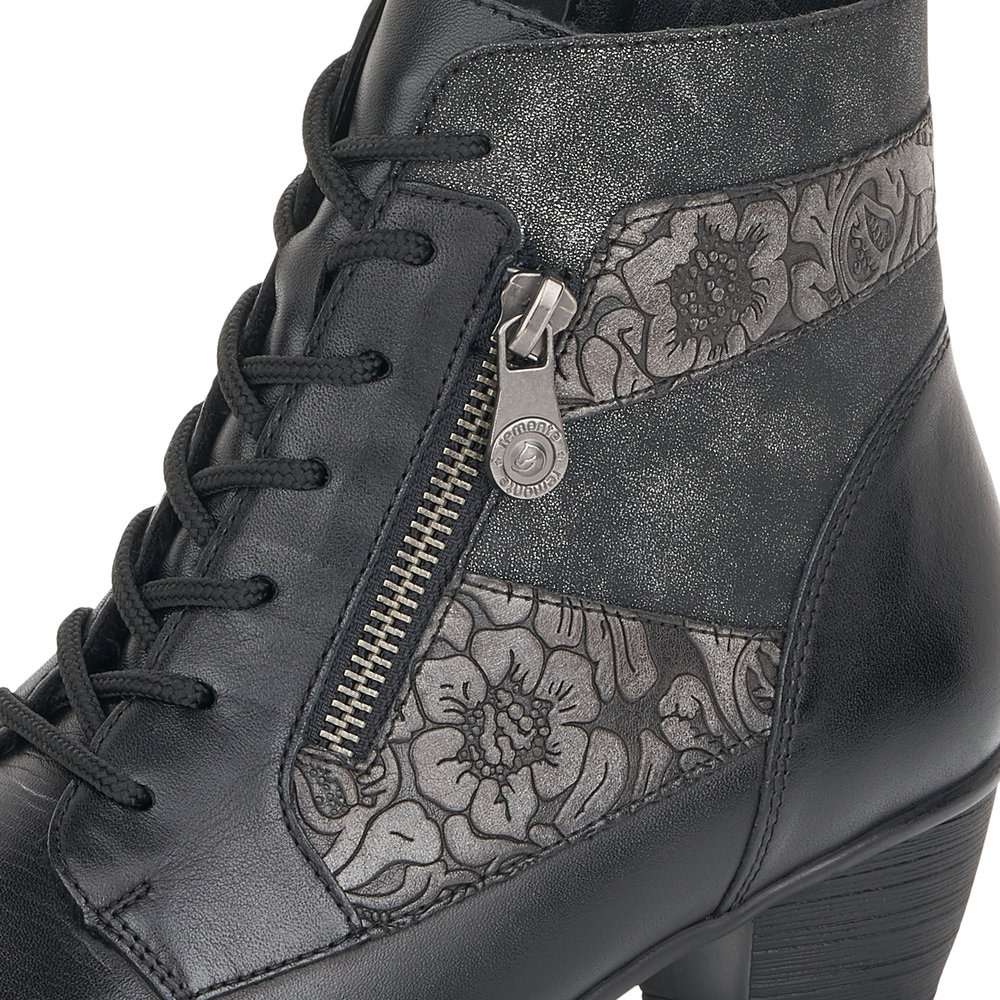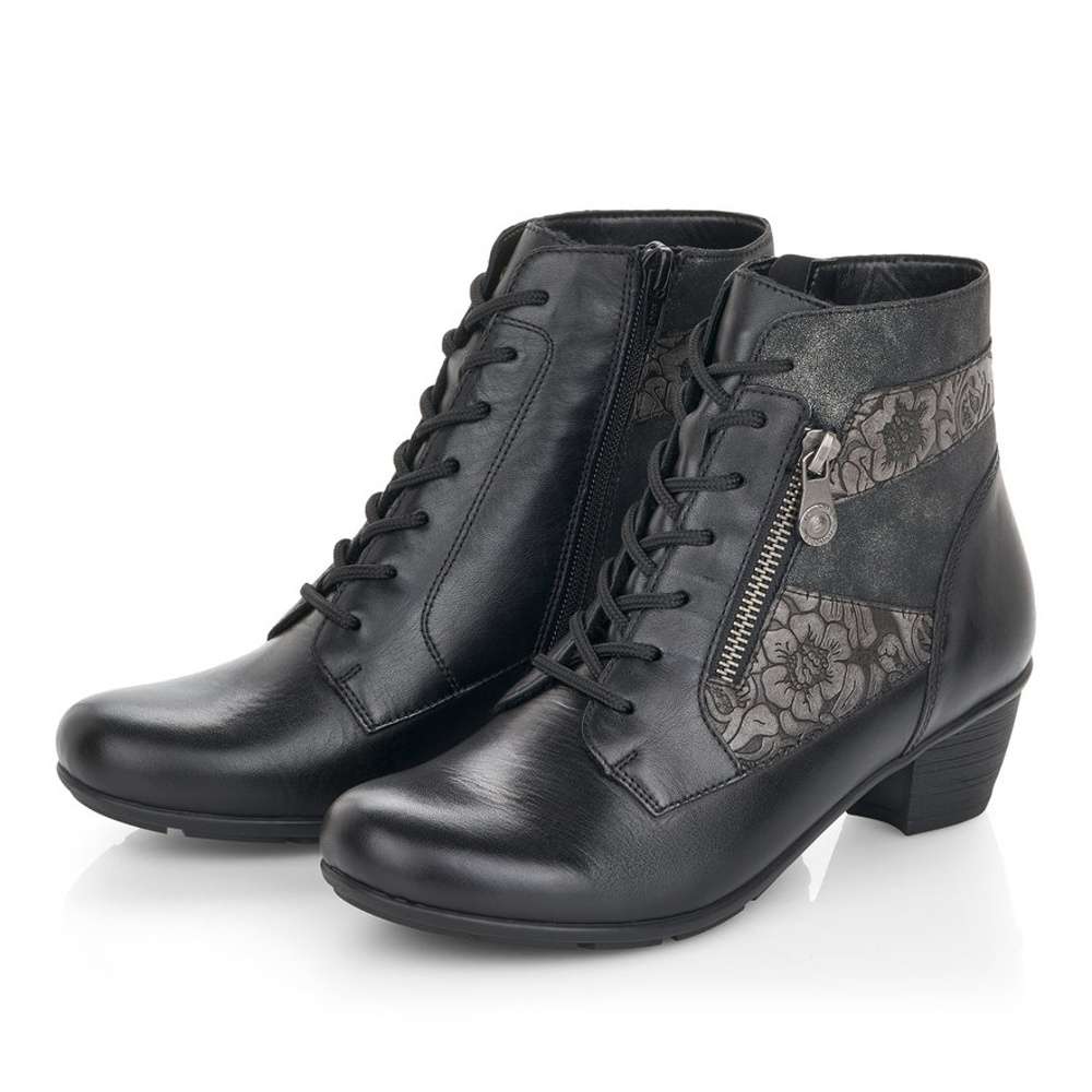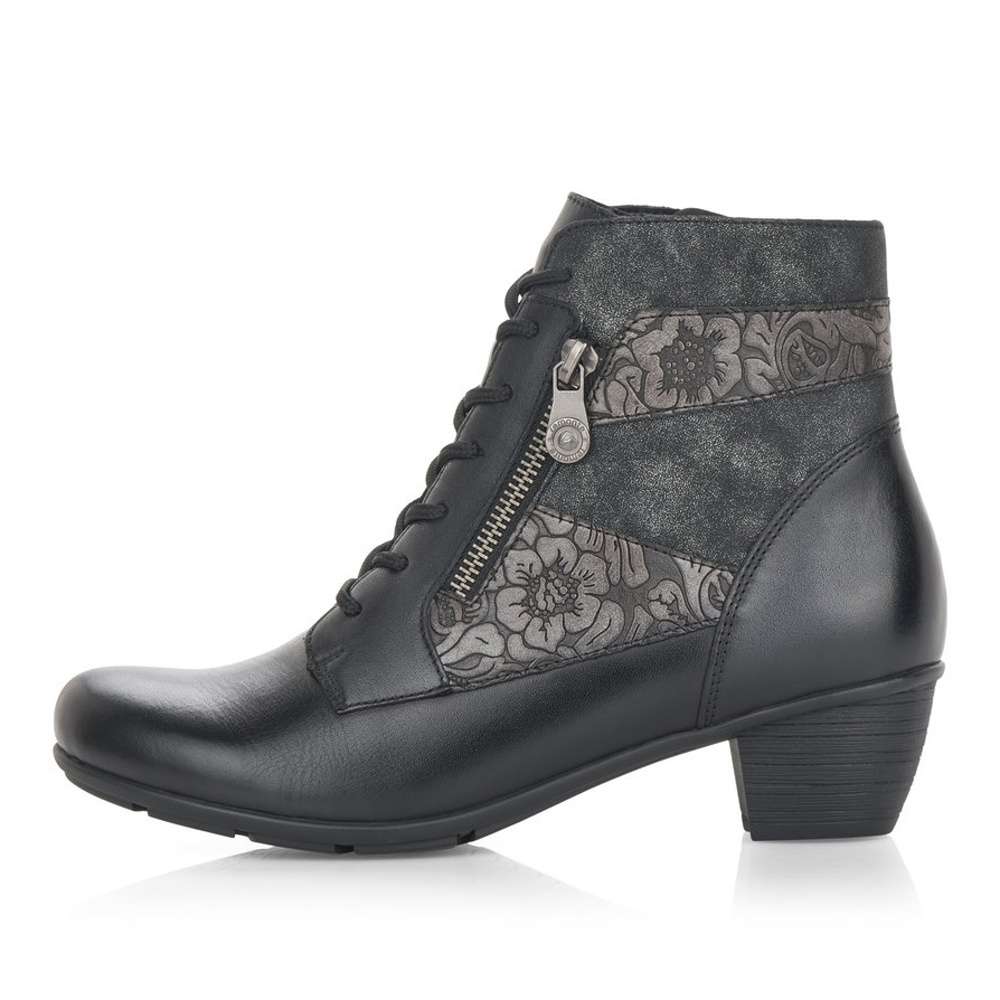 Obuv REMONTE – jedná se o vyšší řadu značky RIEKER, tato obuv se vyznačuje vynikající kombinací svrchních materiálů. Tento úžasný kotník černé barvy je zdobený květinovým vzorem a zipem na vnější straně. Na vnitřní straně je funkční zip pro snadné obutí. Šněrováním si pak obuv přizpůsobíte přímo k Vaší noze. Unosíte je při veškerých příležitostech a ke všem Vašim outfitům.