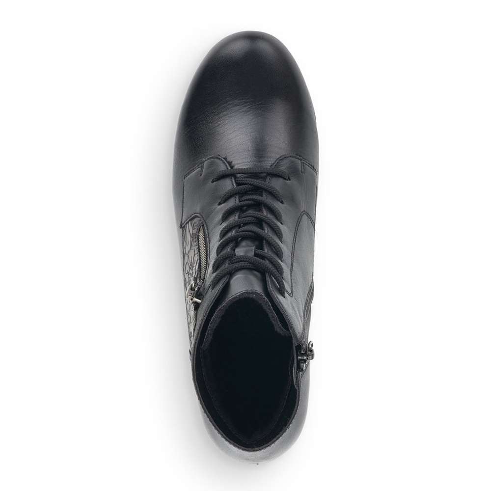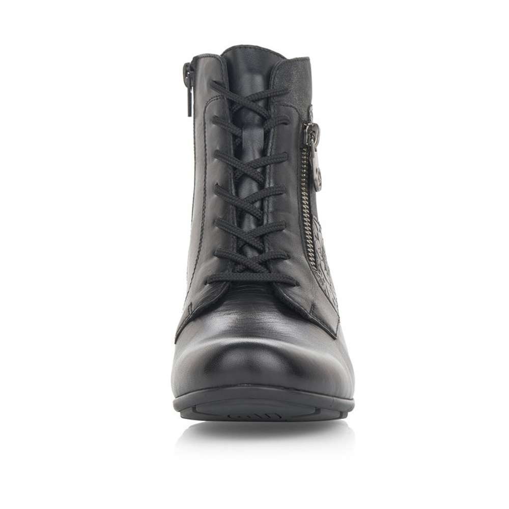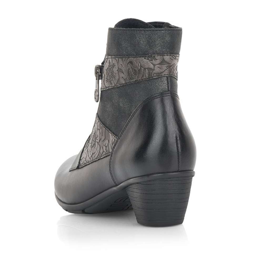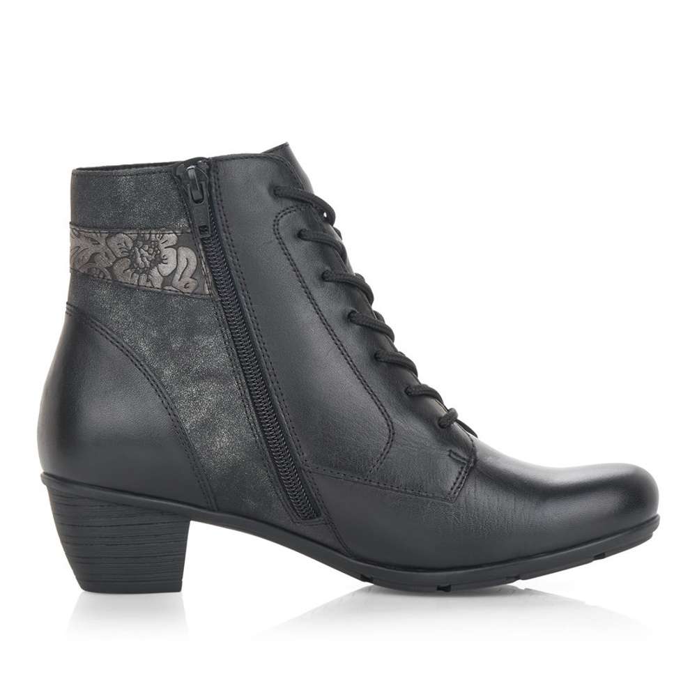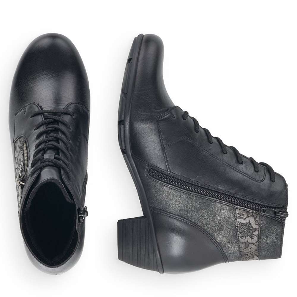 Obuv REMONTE – jedná se o vyšší řadu značky RIEKER, tato obuv se vyznačuje vynikající kombinací svrchních materiálů. Tento úžasný kotník černé barvy je zdobený květinovým vzorem a zipem na vnější straně. Na vnitřní straně je funkční zip pro snadné obutí. Šněrováním si pak obuv přizpůsobíte přímo k Vaší noze. Unosíte je při veškerých příležitostech a ke všem Vašim outfitům.
