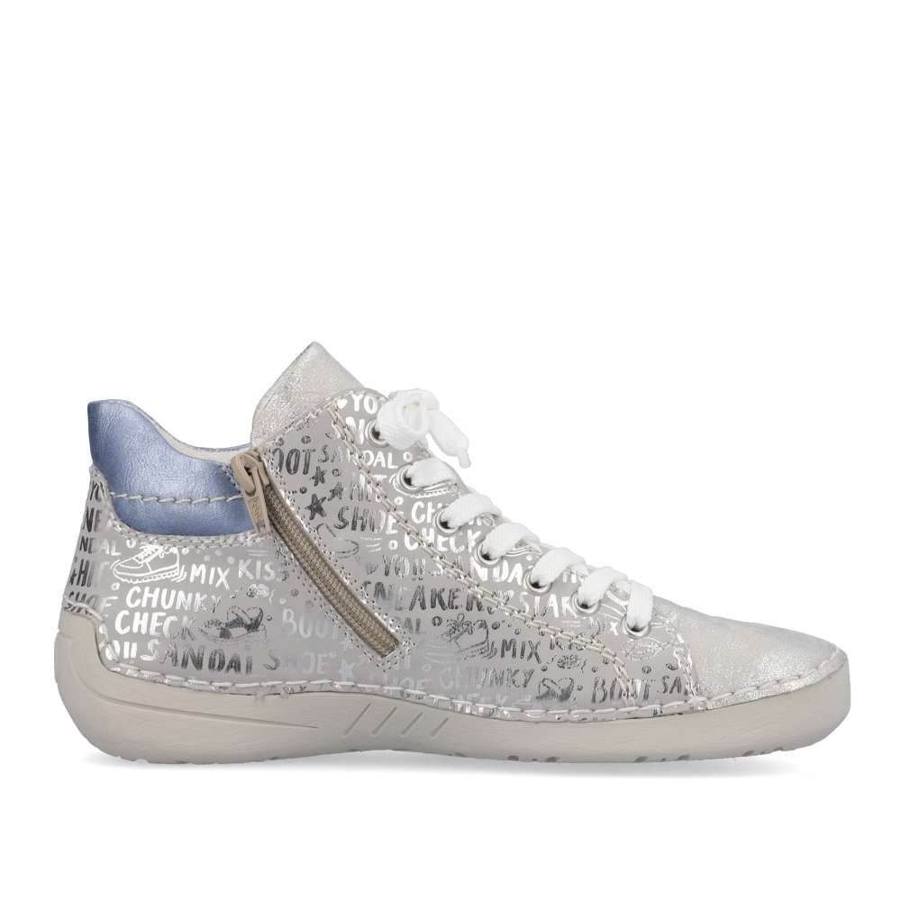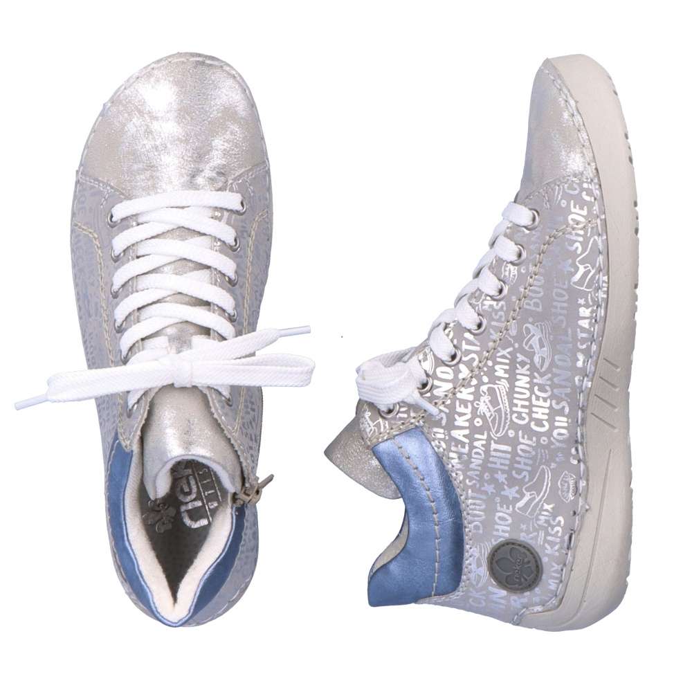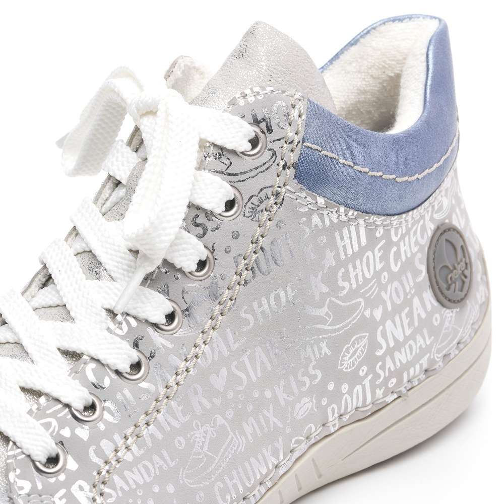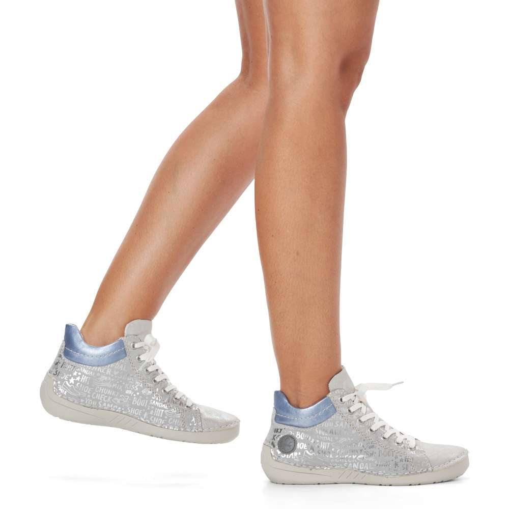 Tuto dámskou tenisku od značky Rieker si zamilujete na první pohled. Svršek zdobí lesklé nápisy, vkusné logo značky v oblasti paty a barevný prvek u kotníku. Díky kombinaci tkaniček a zipu Vám teniska skvěle padne a obouvání bude snadnější. S měkkou stélkou se budete cítit komfortně na každém kroku ať už vyrazíte za prací či zábavou. Kombinací bot s kabelkou z naší nabídky vznikne šmrncovní outfit. Technologie: Antistress – podešev je díky této technologii lehká, flexibilní, absorbuje nárazy při došlapu a snadno se přizpůsobí každé noze.