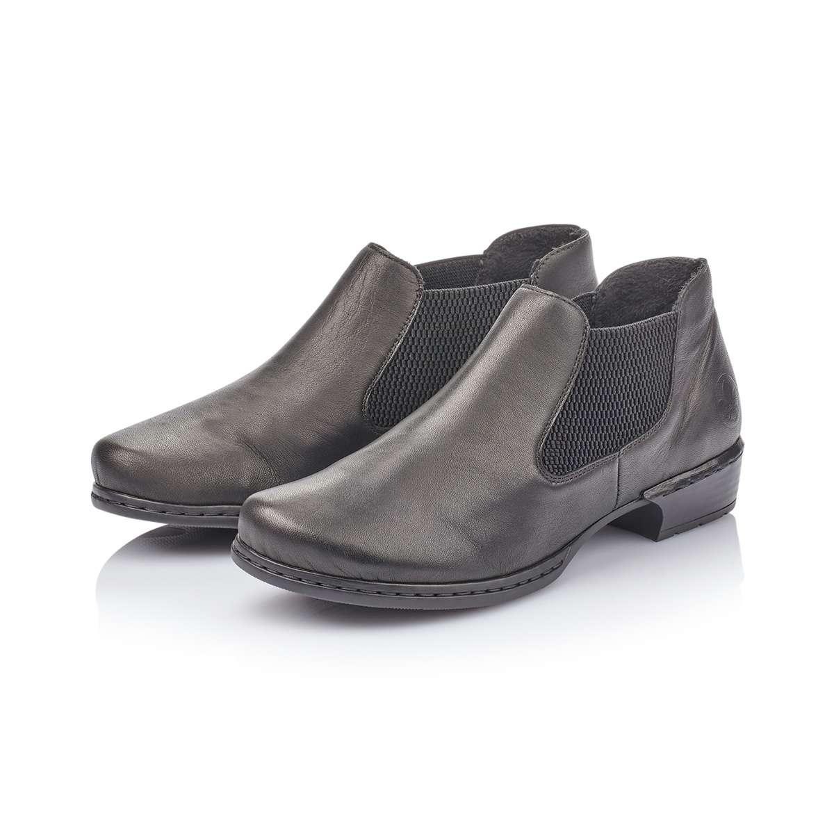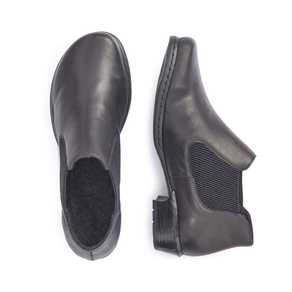 Kožená nadčasová obuv RIEKER s matným povrchem v černé barvě a decentním logem značky v části paty. Obouvání usnadní vsazené pružné gumičky na vnitřní i vnější straně. Tyto elegantní boty využijete například na pracovní schůzky.