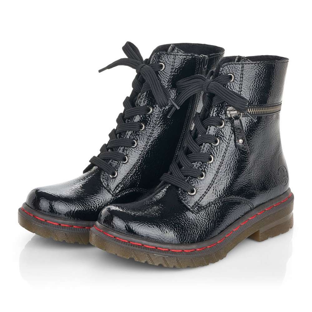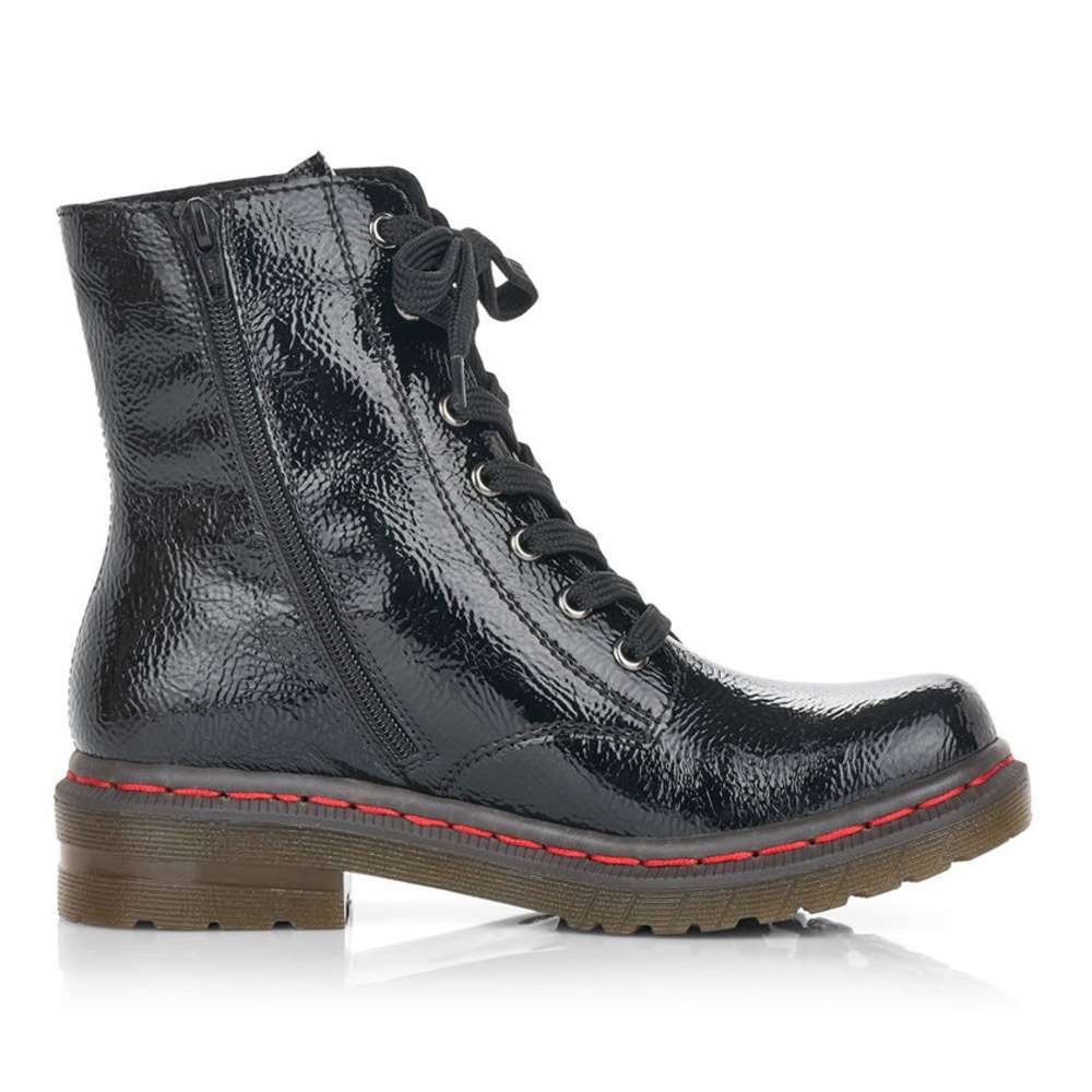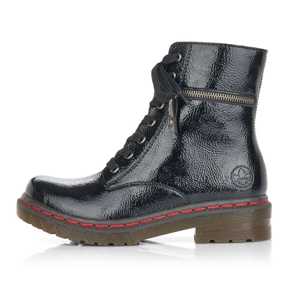Dámská kotníková obuv Rieker s lesklým oblázkovým svrškem v černé barvě je ozvláštněna zdobným zipem a červeným prošitím v části podešve. Pro snadné obutí je na vnitřní straně použit funkční zip a tkaničky, díky kterým si můžete upravit velikost přímo na Vaši nohu. Můžete si v nich vyjít do kina nebo na procházku parkem.