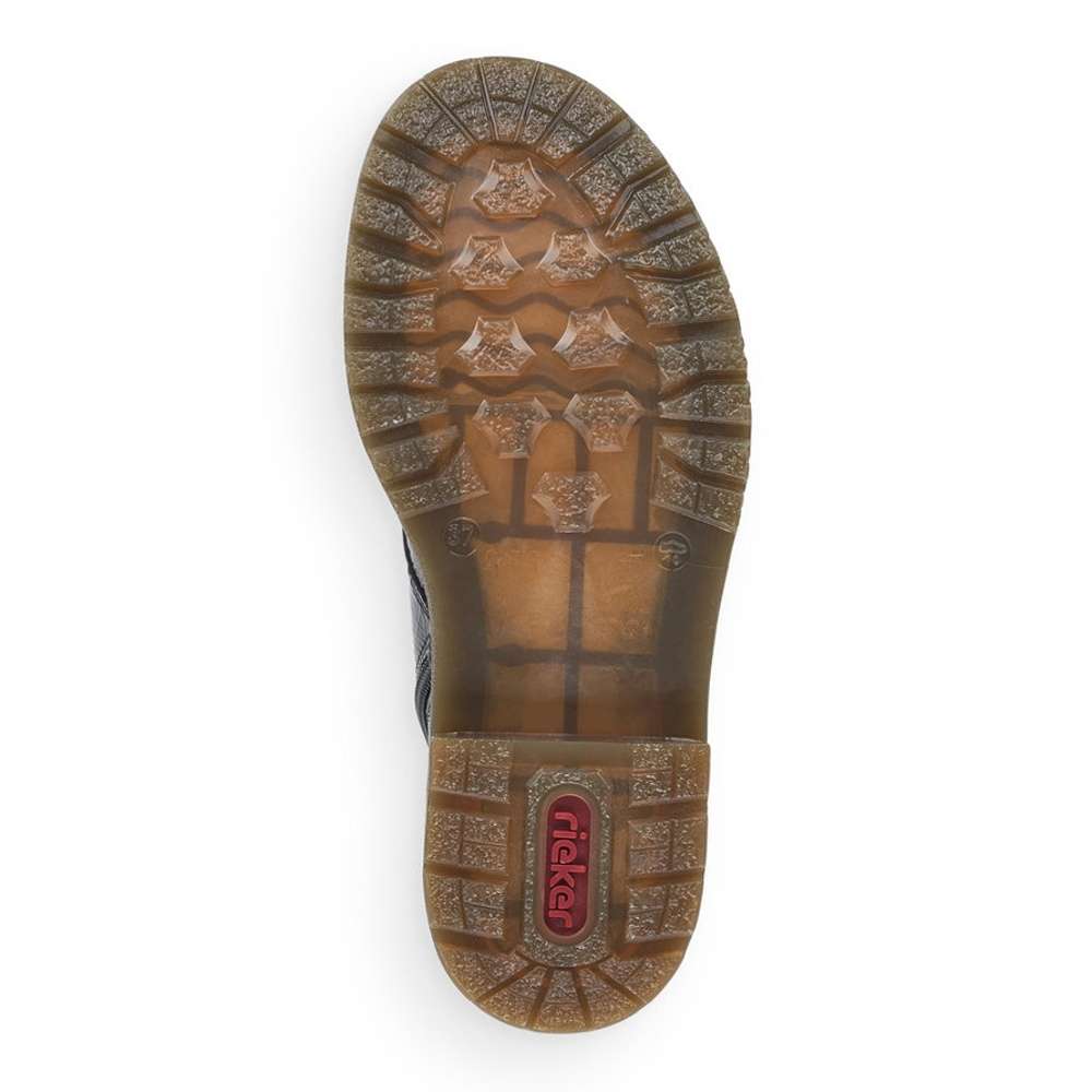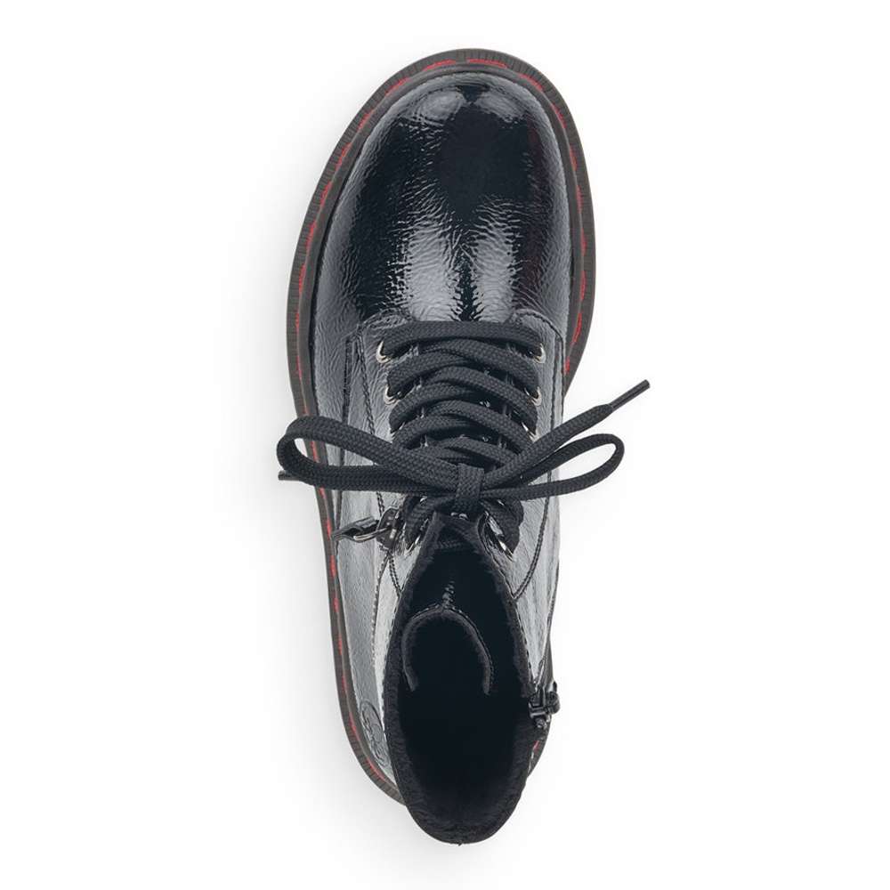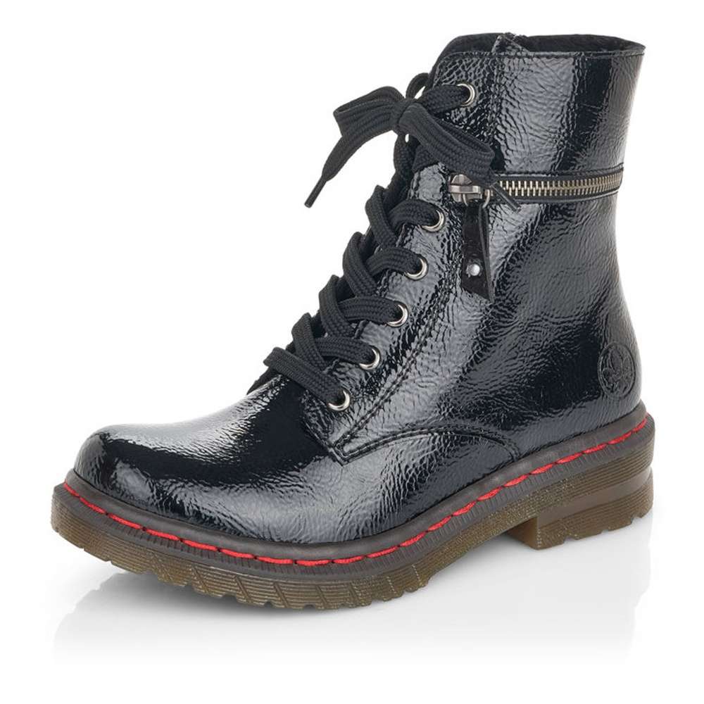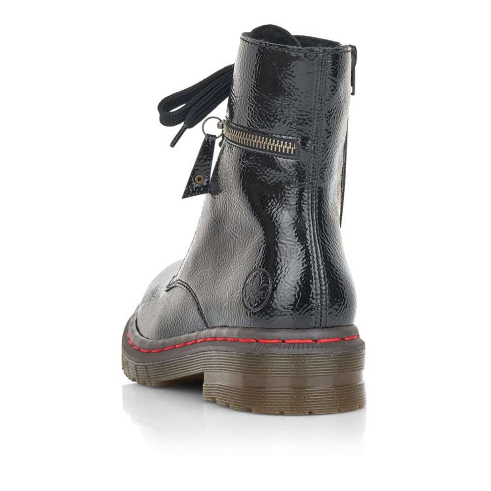 Dámská kotníková obuv Rieker s lesklým oblázkovým svrškem v černé barvě je ozvláštněna zdobným zipem a červeným prošitím v části podešve. Pro snadné obutí je na vnitřní straně použit funkční zip a tkaničky, díky kterým si můžete upravit velikost přímo na Vaši nohu. Můžete si v nich vyjít do kina nebo na procházku parkem.