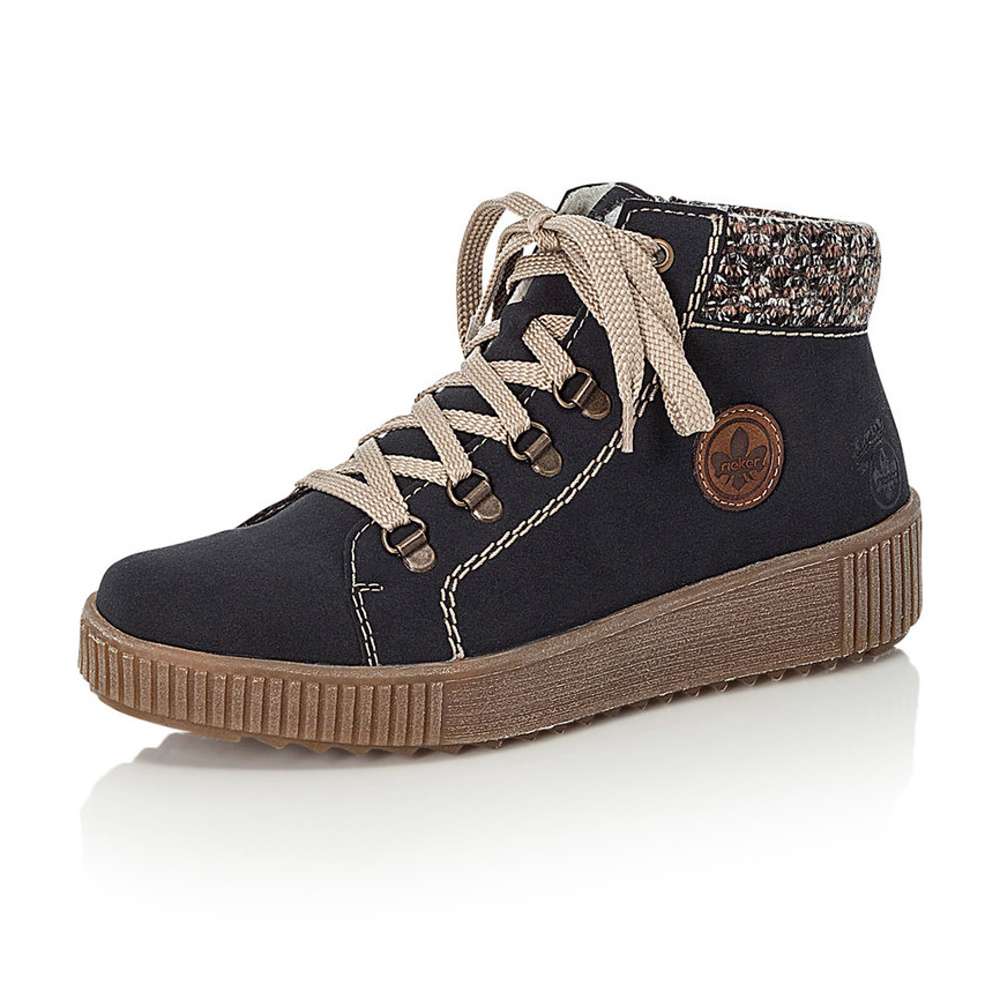 Dámské kotníkové boty značky Rieker s vysokou podešví mají krásnou pastelově modrou barvu a pestrobarevný lem u horního okraje. Na vnější straně dominuje logo značky v hnědém provedení. Obouvání Vám usnadní šněrování, které poslouží pro lepší přizpůsobení na Vaši nohu. V chladných zimních dnech jistě oceníte zateplenou podšívku. Tento velmi pohodlný vzor unosíte jak do práce, tak i na běžné pochůzky.