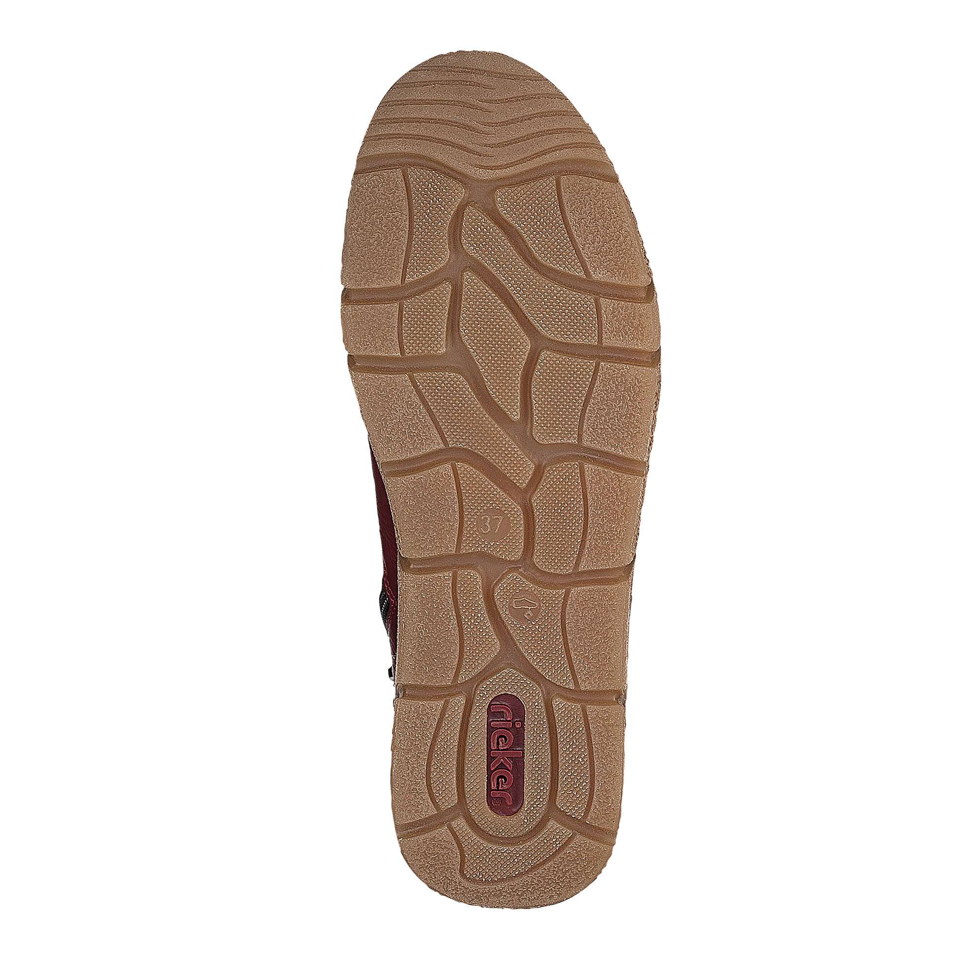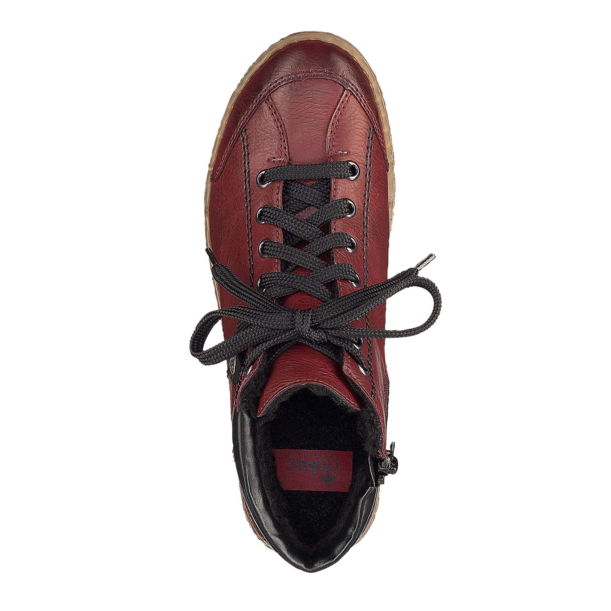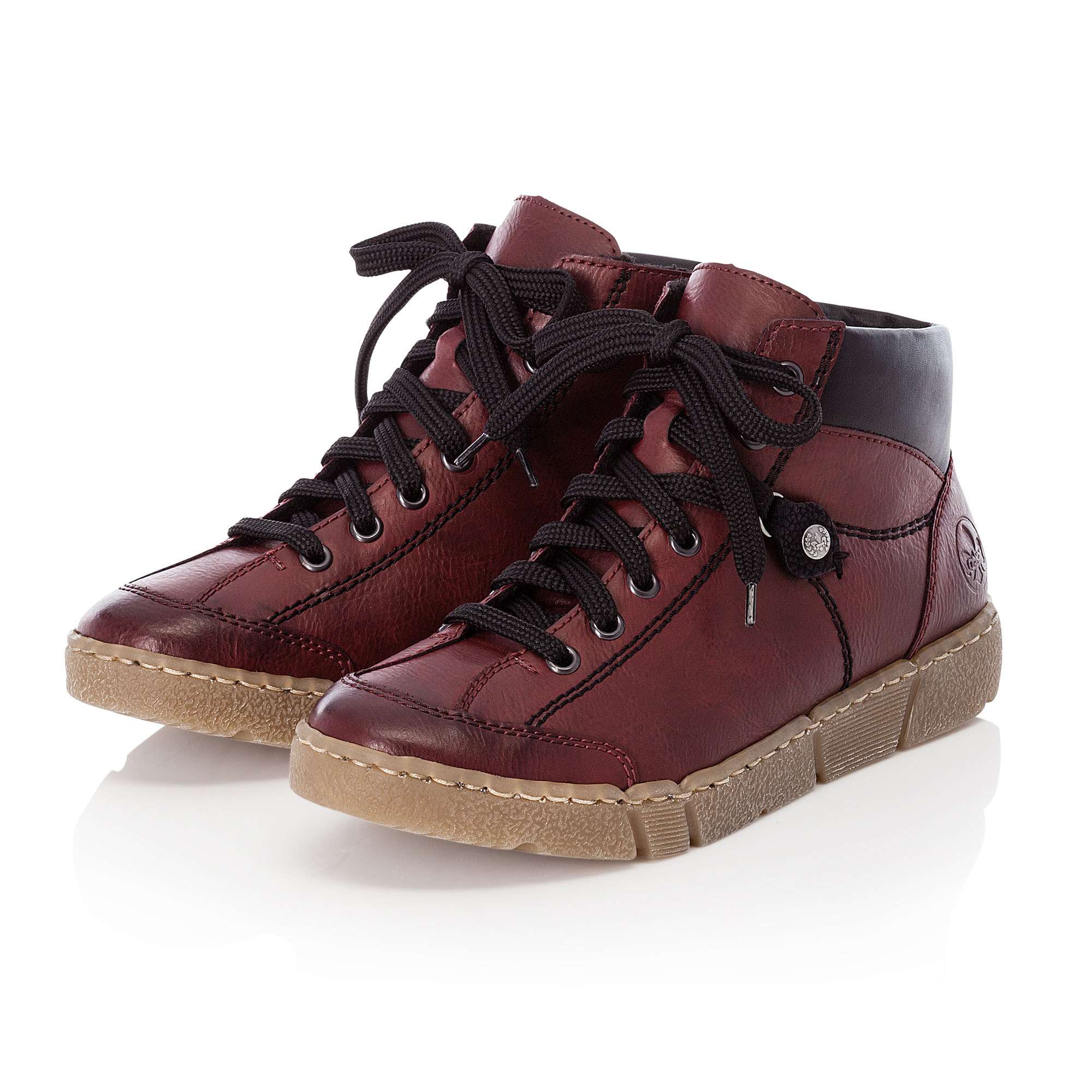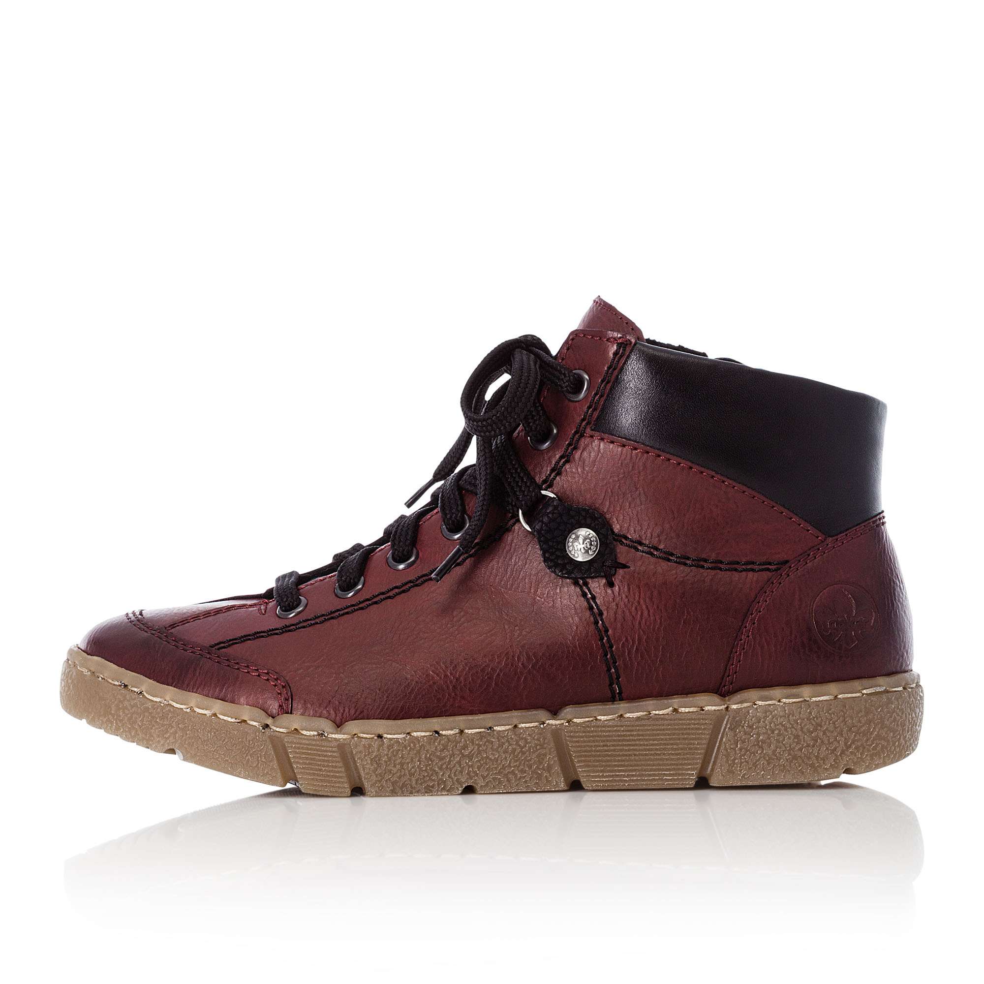 Dámské kotníky značky Rieker mají elegantní tmavě červenou barvu, logo značky a designovou podešev. Svršku dominuje kontrastní šití a lem horního okraje. Obouvání Vám usnadní šněrování, které poslouží pro lepší přizpůsobení na Vaši nohu. Tento velmi pohodlný vzor unosíte jak do práce, tak i na běžné pochůzky.