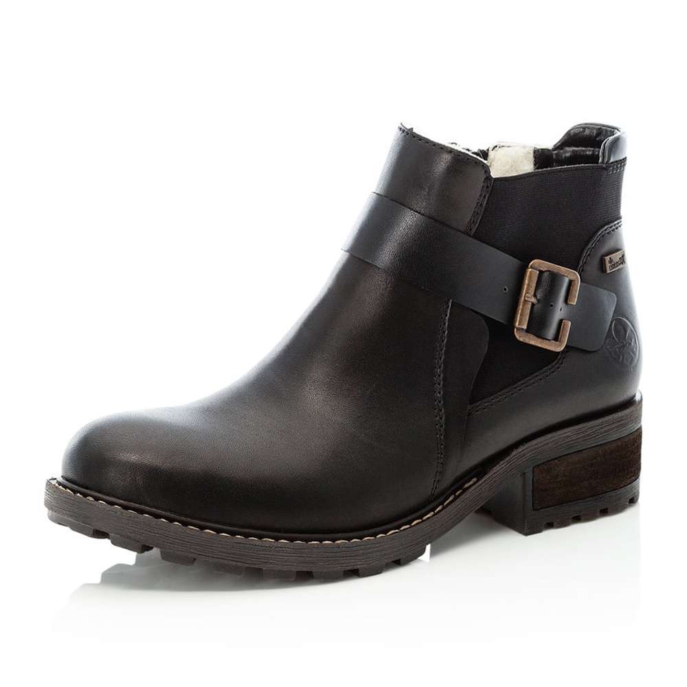 Dámské kožené kotníky budou pro Vás určitě tou správnou volbou. Hladký černý svršek je ozdoben prošíváním, páskem s kovovou sponou v oblasti nártu a pružnou všitou gumičkou na vnější straně obuvi. Unikátní vrstva Rieker TEX zajistí, že je obuv nepromokavá ale přesto prodyšná. Tyto kotníky skvěle doplní Vaše zimní outfity na procházkách městem.