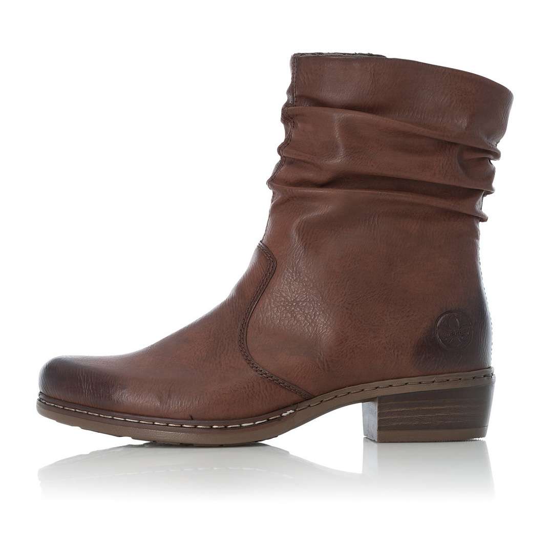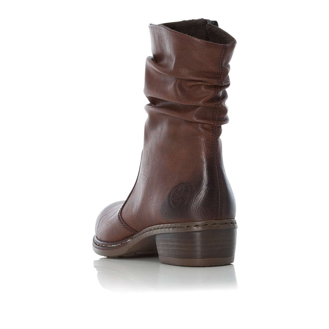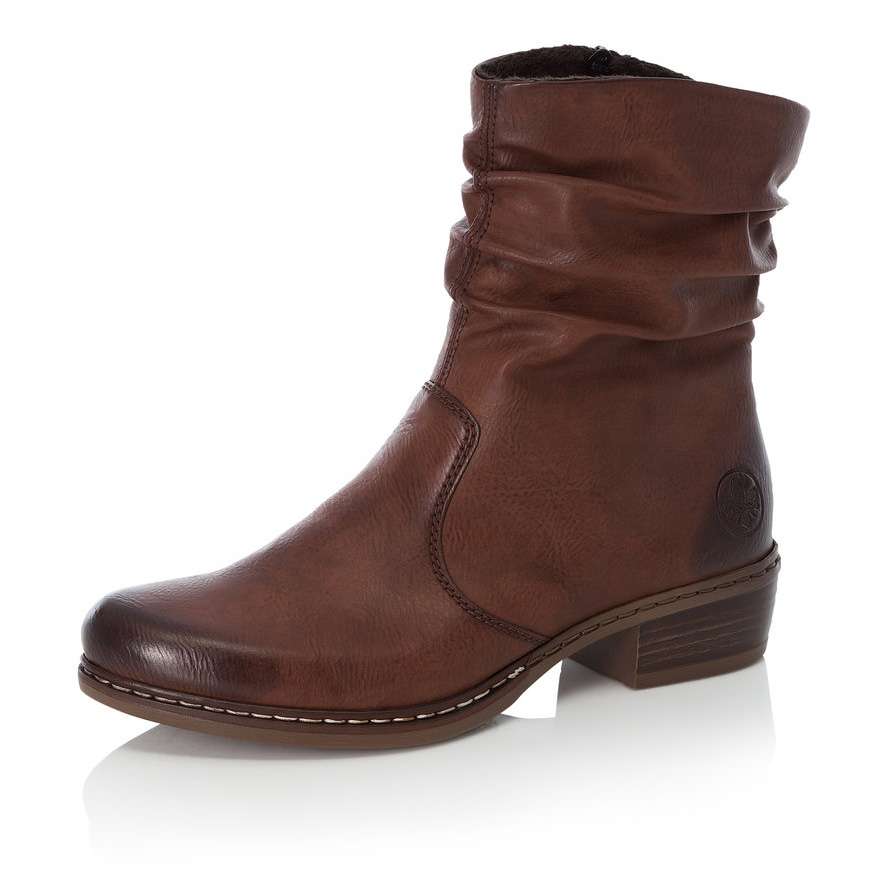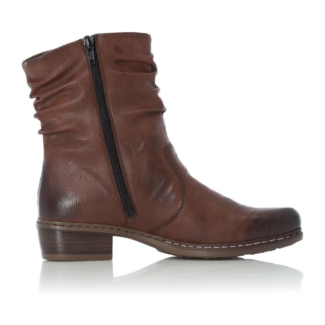 Krásné jednoduché kotníky v hnědé barvě, značky RIEKER. Svršek Tyto vyšší dámské kotníky v hnědé barvě jsou obohaceny nařasením v horní částí, decentním prošitím a vytlačeným logem. Nazouvání Vám usnadní funkční zip z vnitřní strany. Stélka Stélka je příjemně měkká a zaručí Vám pohodlí po celý den. Navíc také oceníte podšívku s příjemným kožíškem, která Vás zahřeje při chladném počasí. Podešev Podešev je vysoká cca 3,6 cm a díky technologii Antistress je lehká, flexibilní a absorbuje nárazy při došlapu. Tyto kotníky budou skvělou volbou k zimnímu kabátku. Technologie: Antistress