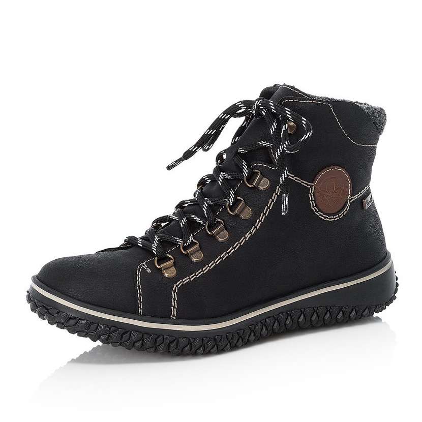 Dámské kotníky sportovního stylu černé barvy jsou zdobené kontrastním šitím, lemem horního okraje a kulatým logem na straně. Šněrováním si je upravíte dle svých potřeb. Designová podešev spolu s funkční vrstvou Rieker Tex se postarají o teplo a pohodlí na každém kroku. Tento model užijete na veškeré pochůzky i na procházky zimní krajinou.