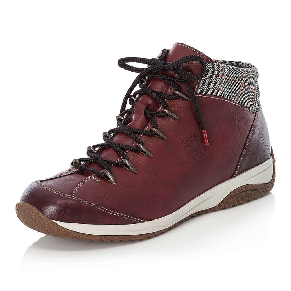 Tato dámská obuv značky Rieker vínové barvy bude skvělá do chladných dní. Svršek je ozdoben kontrastním prošíváním, vytlačeným logem značky, károvým lemem horního okraje a kontrastními černými tkaničkami. Jednoduché obouvání Vám zajistí funkční zip z vnitřní strany a šněrování. Tyto kotníky skvěle doplní Vaše zimní outfity.