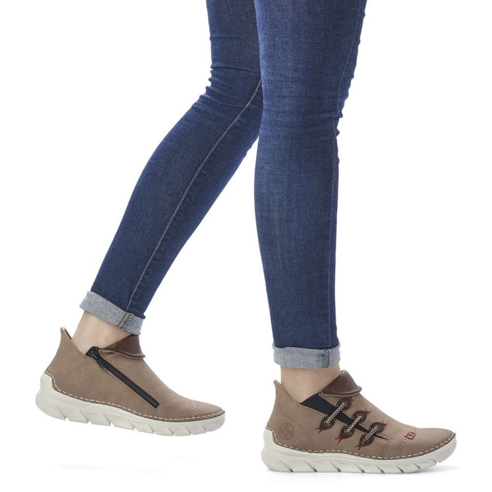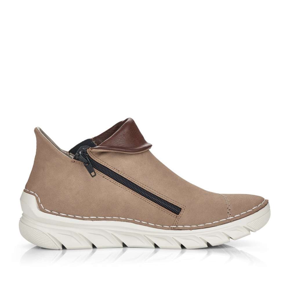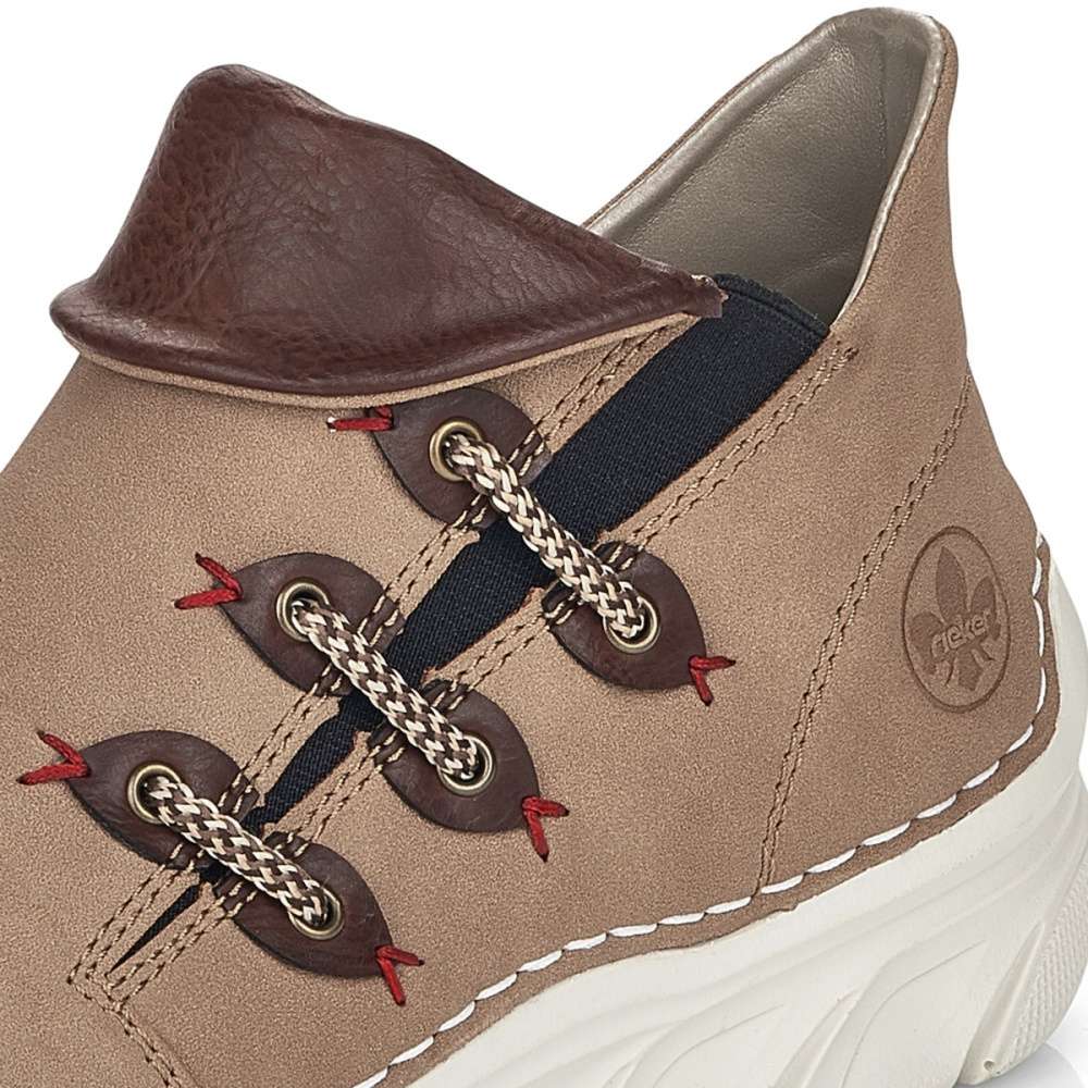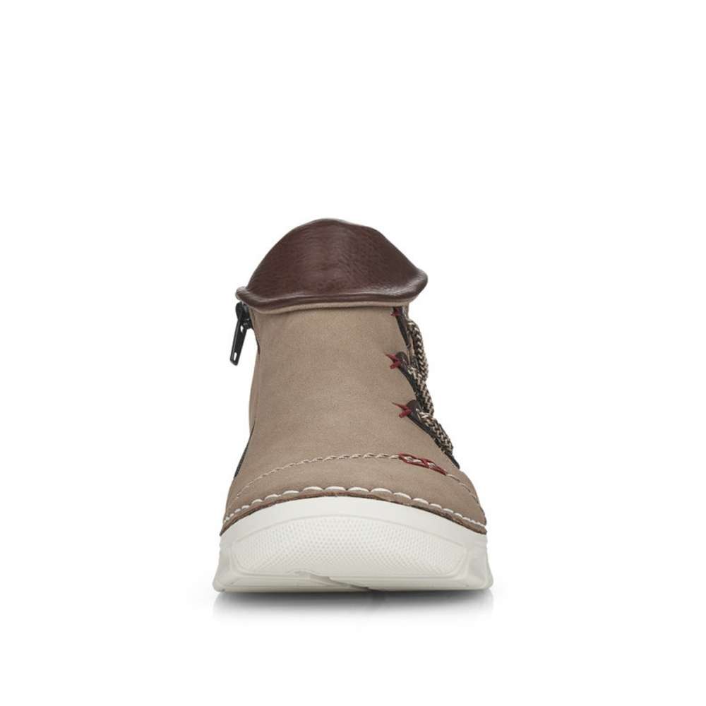 Zde máme pro Vás parádní model v hnědé barvě doplněný ohrnutým okrajem na kotníku, kontrastním šitím a logem Rieker na patě. Na straně je zdobení kolem otvorů pro zdobnou tkaničku, ta je přes pružnou gumičku, která napomáhá přizpůsobení boty Vaší noze. Vnitřní zip využijete při obutí či vyzutí.