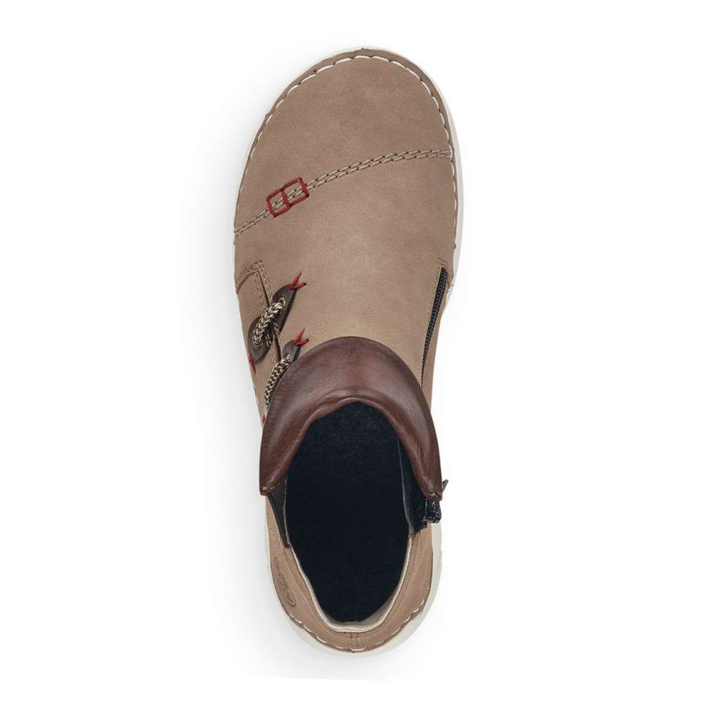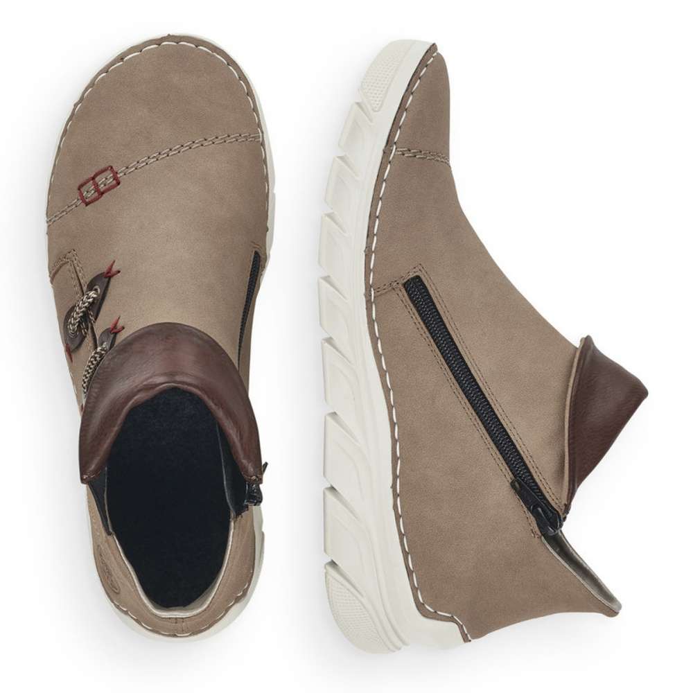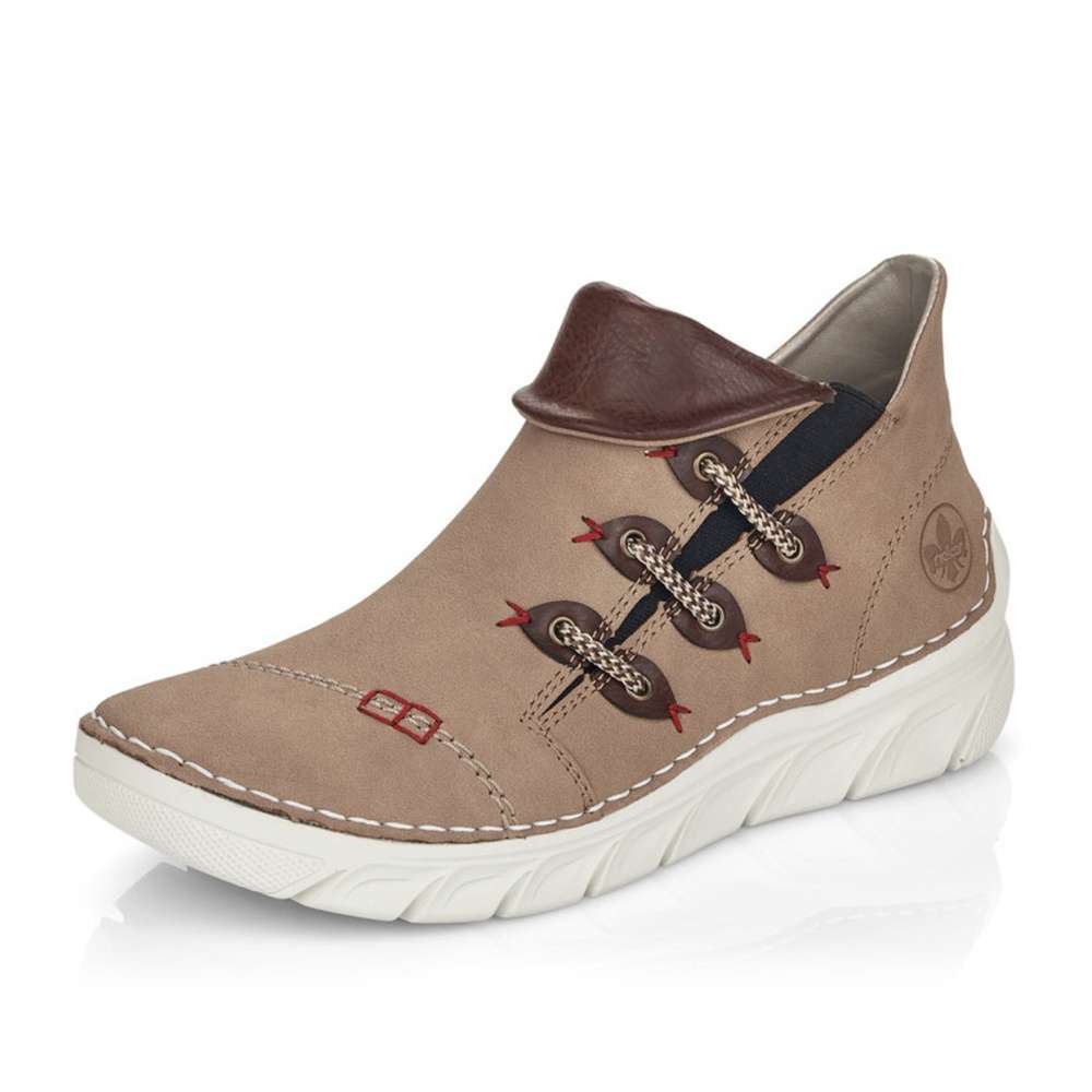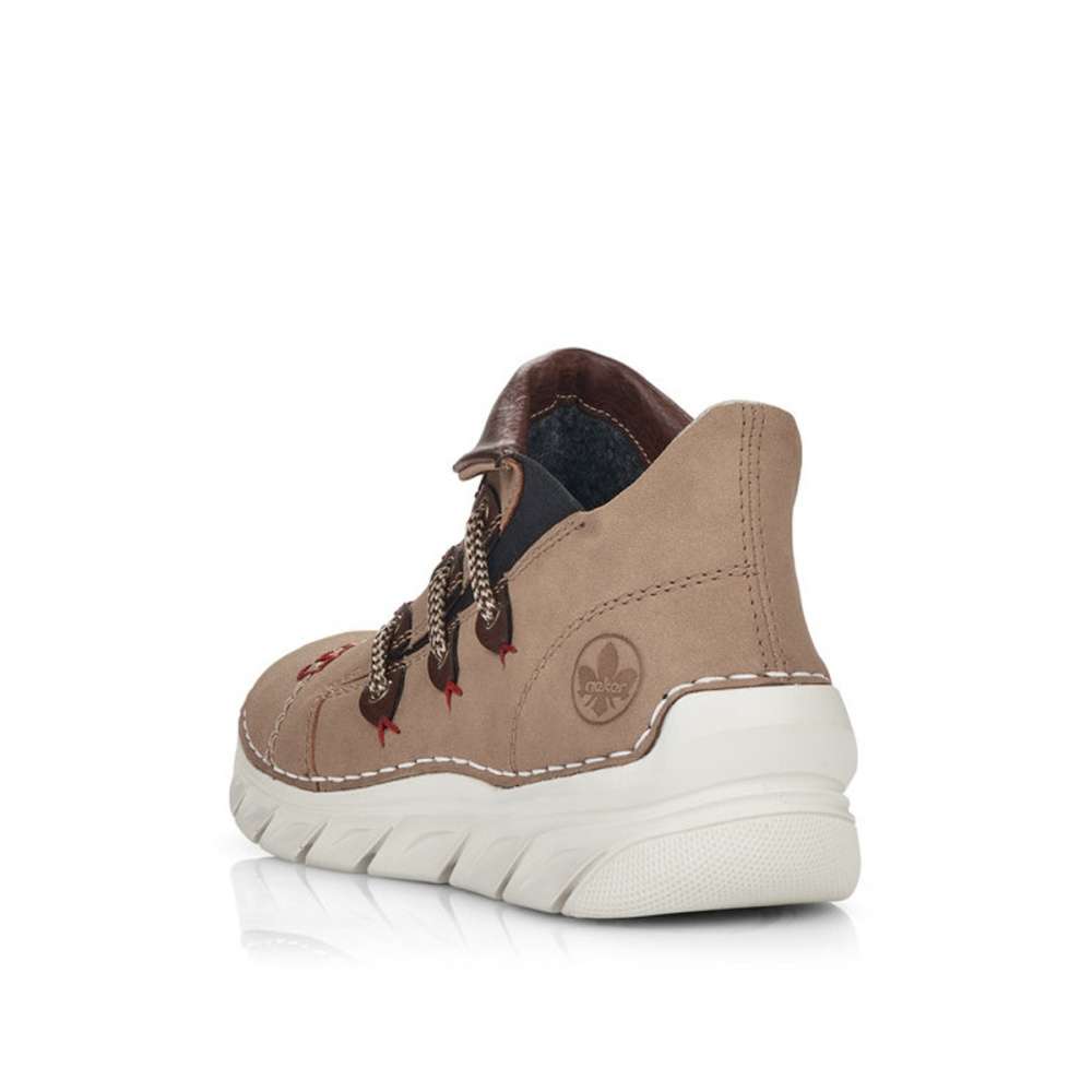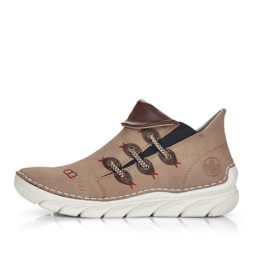 Zde máme pro Vás parádní model v hnědé barvě doplněný ohrnutým okrajem na kotníku, kontrastním šitím a logem Rieker na patě. Na straně je zdobení kolem otvorů pro zdobnou tkaničku, ta je přes pružnou gumičku, která napomáhá přizpůsobení boty Vaší noze. Vnitřní zip využijete při obutí či vyzutí.