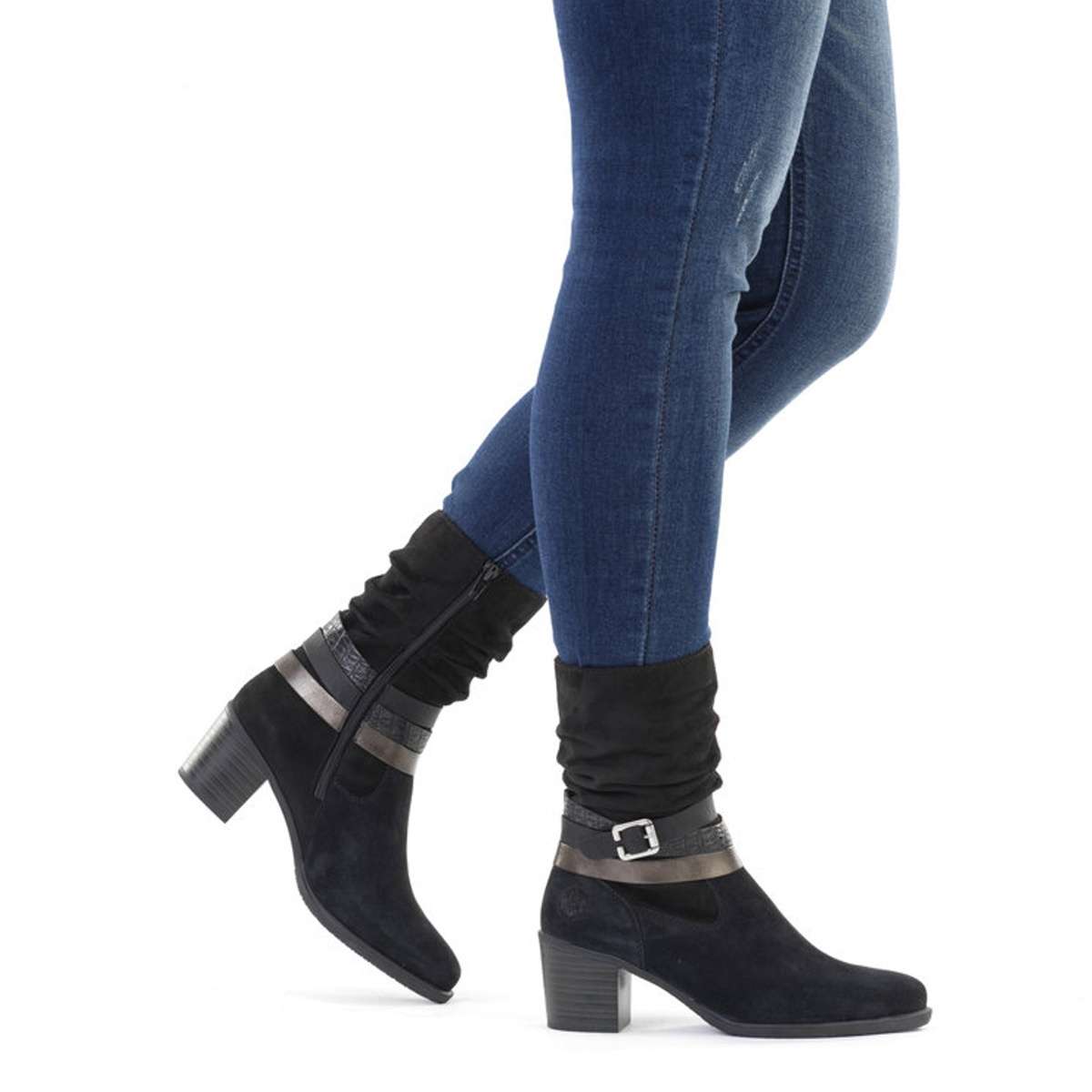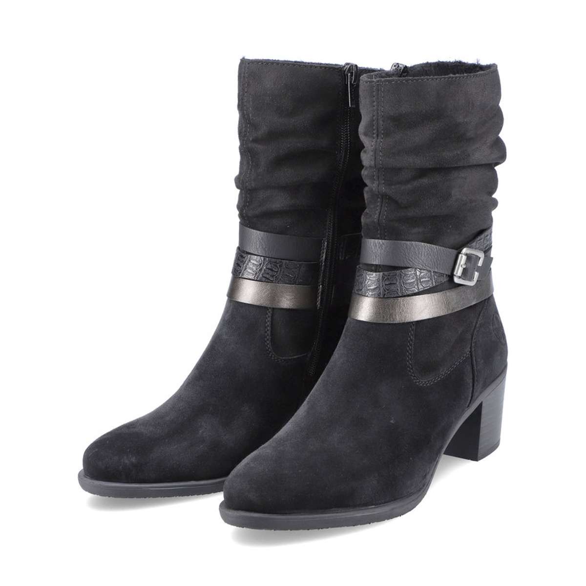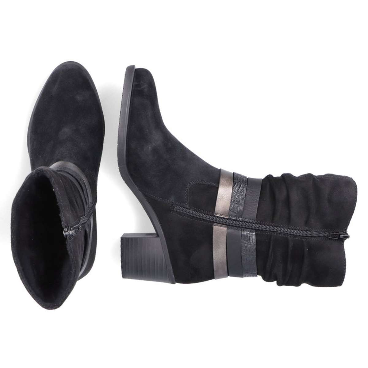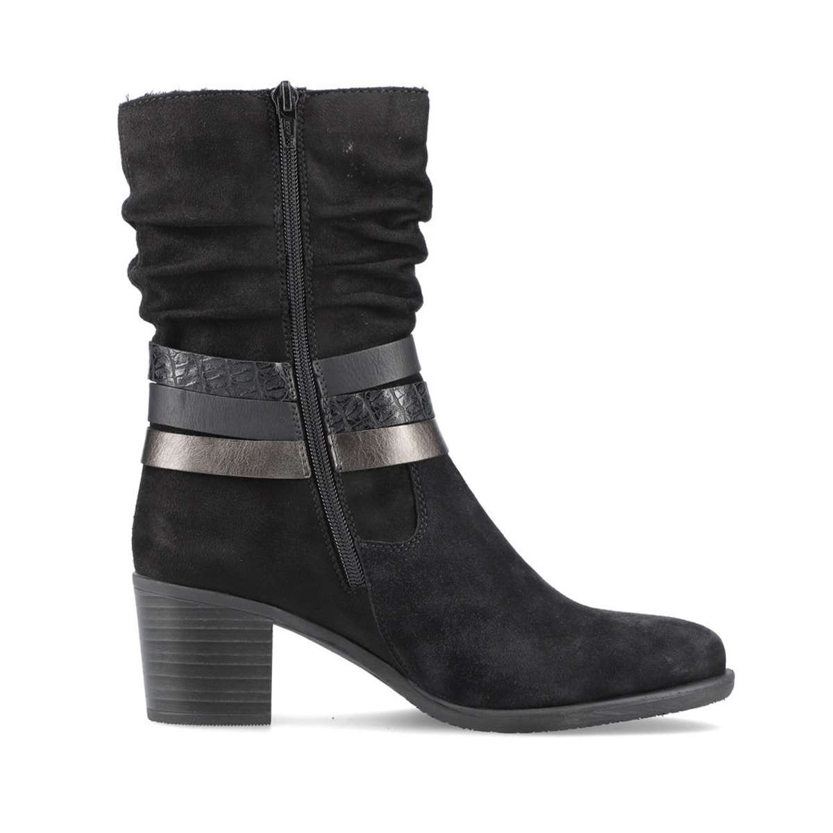 Dámský kotník se zdobnými pásky, značky RIEKER. Svršek Dámský vyšší kotník černé barvy je vyroben z textilního materiálu. Výrazným a zdobným prvkem této obuvi je decentní narašení u horního okraje a jemně lesklé pásky s přezkou kolem kotníku. Nazouvání Vám usnadní praktický zip z vnitřní strany. Stélka Určitě také oceníte podšívku s příjemným kožíškem, která Vás zahřeje při nepříznivém počasí. Stélka je příjemně měkká a zaručí Vám pohodlí po celý den. Podešev Podešev s podpatkem vysokým cca 5,5 cm má technologii Antistress, která je lehká, flexibilní a absorbuje nárazy při došlapu. Tyto boty Vám pokaždé zpříjemní den, a to kamkoliv jen půjdete. Technologie: Antistress