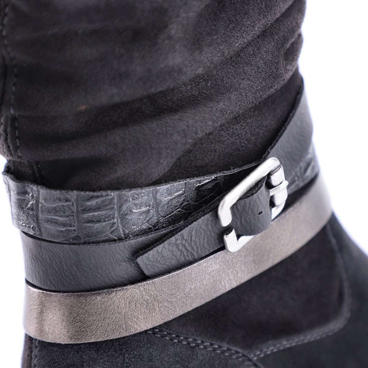Dámský vyšší kotník černé barvy je vyroben z textilního materiálu. Výrazným a zdobným prvkem této obuvi je decentní narašení u horního okraje a jemně lesklé pásky s přezkou kolem kotníku. Nazouvání Vám usnadní praktický zip z vnitřní strany.
